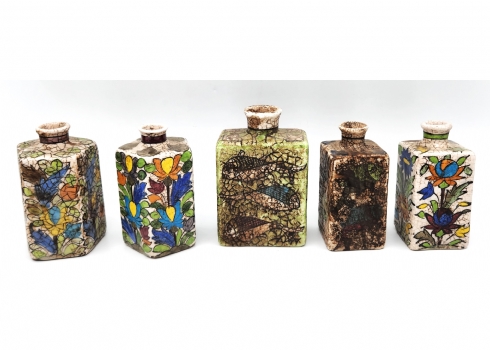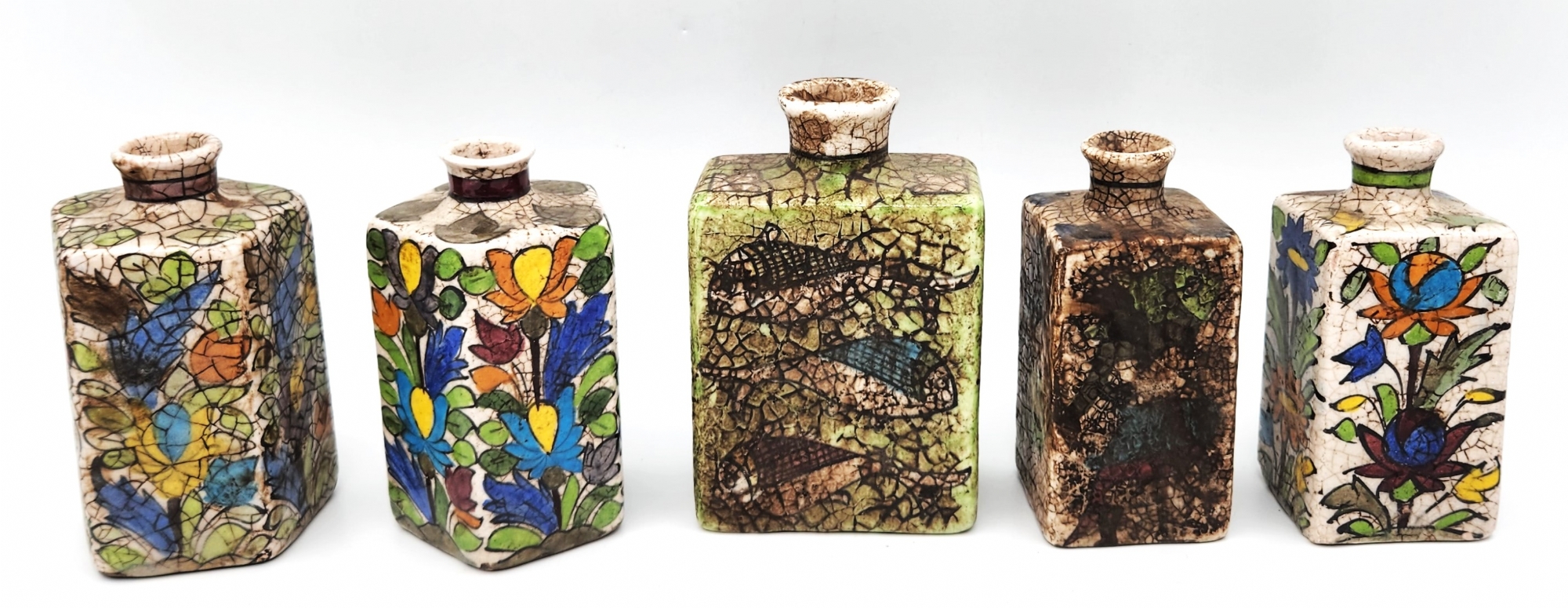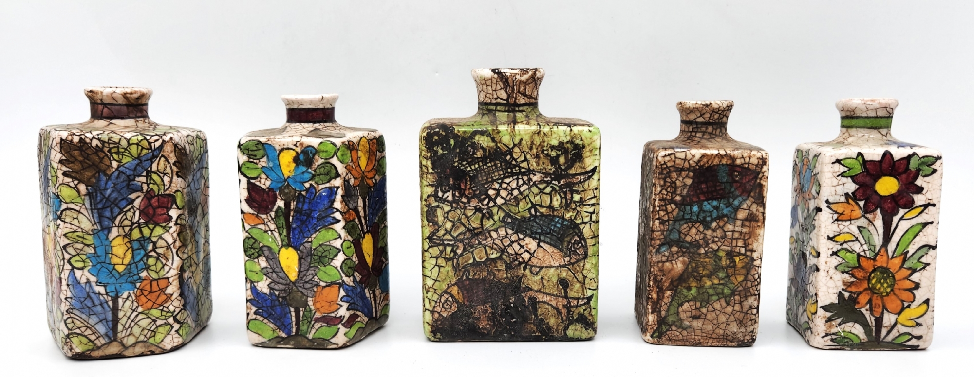 לוט של 5 בקבוקי קרמיקה פרסית ישנים, מעוטרים ציורי יד, גובה בהתאמה: 15 ס"מ עד 18 ס"מ.