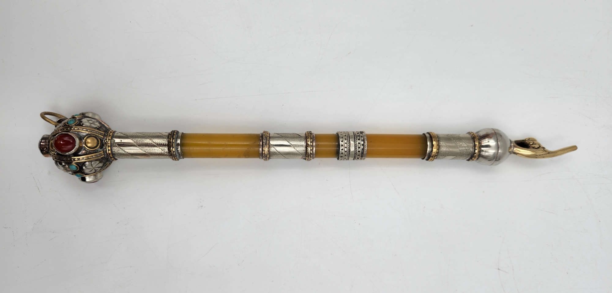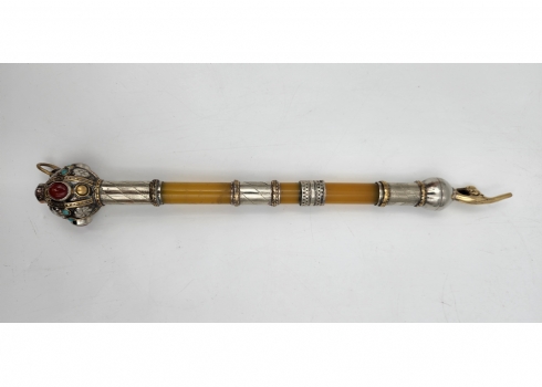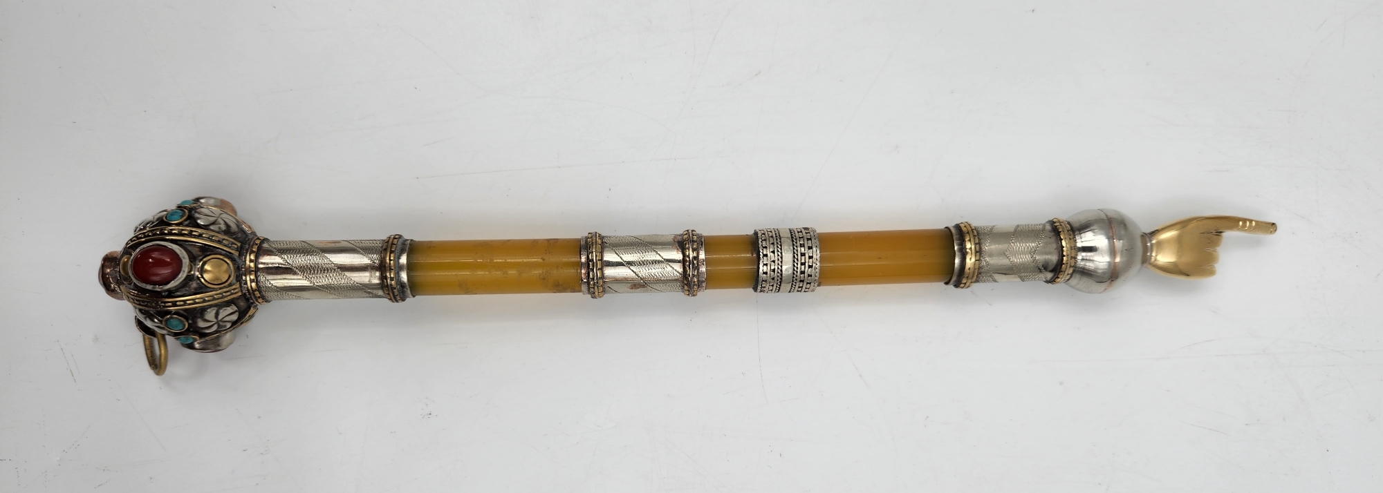 אצבע לספר תורה בסגנון טורקמני, עשויה מתכת מצופה כסף, חומר יצוק בגוון ירוק ואבנים צבעוניות, במרכזה שני חבקים מסוגננים, אורך: 29.5 ס"מ.
