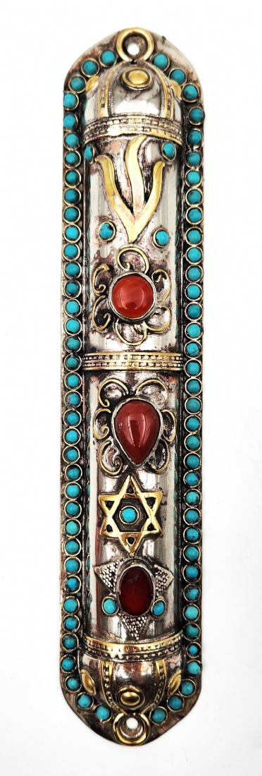 מזוזה ישנה בסגנון טורקמני, עשויה מתכת מצופה כסף ומשובצת אבנים צבעוניות, רוחב: 4.5 ס"מ גובה: 21.5 ס"מ.