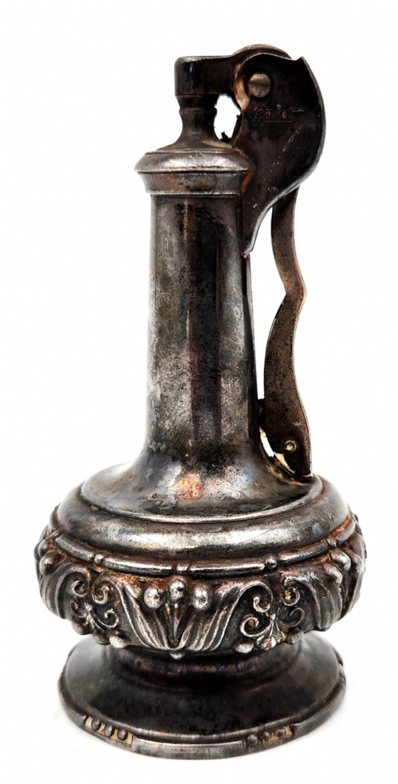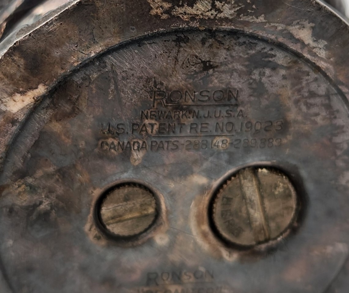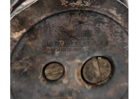 מצית אמריקאית ישנה מתוצרת 'Ronson' עשויה מתכת מצופה כסף, חתומה, גובה: 11 ס"מ, קוטר: 5.5 ס"מ