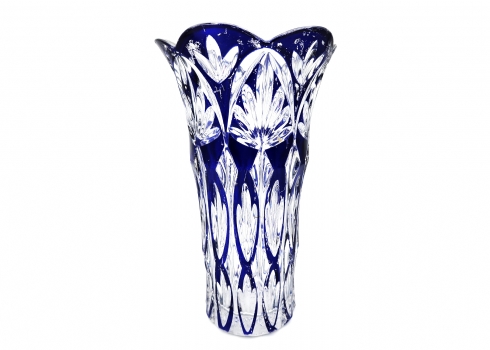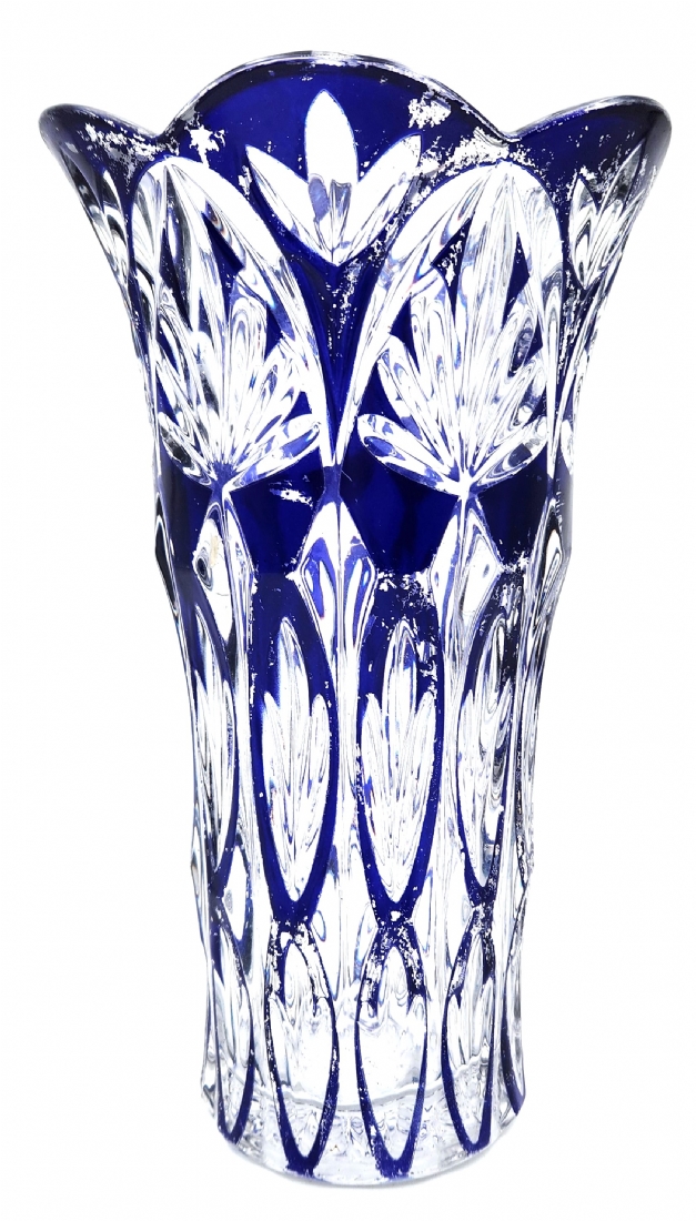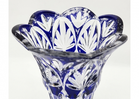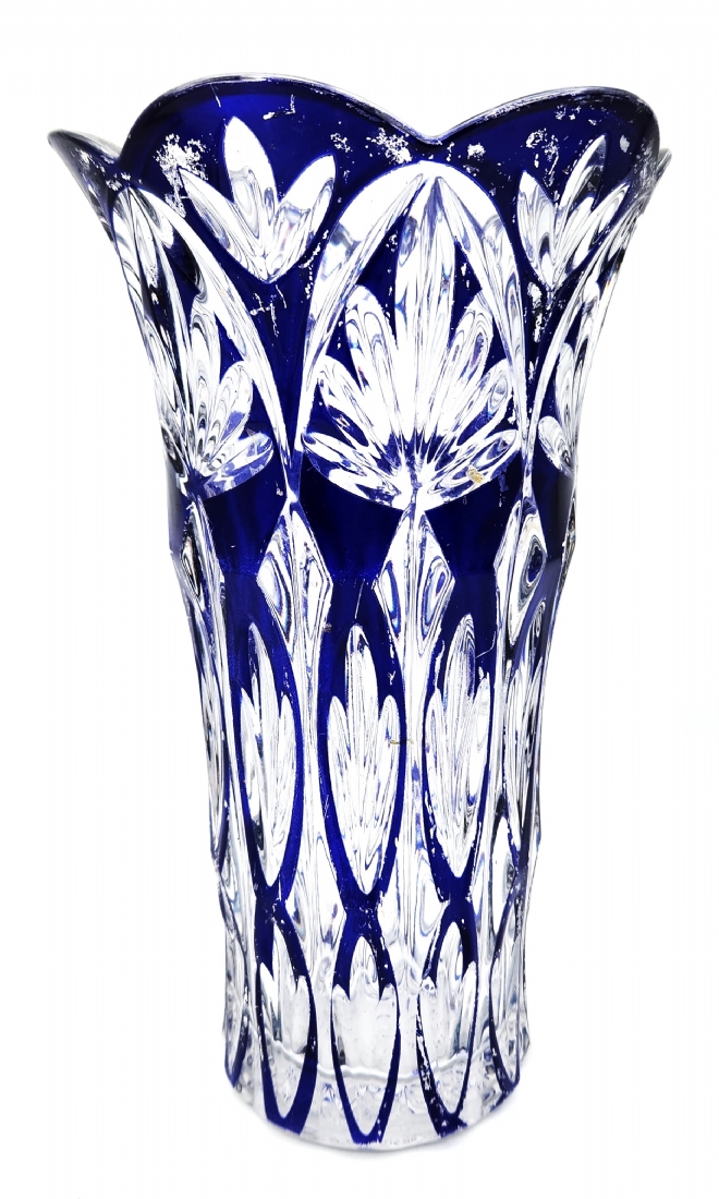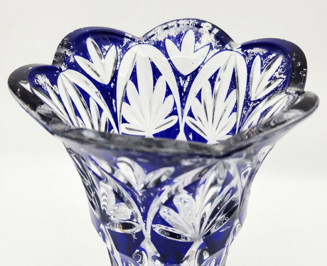 כד זכוכית ישן, מעוטר בצבע כחול (מרובב), סמני שחיקה וקילוף לצבע, רוחב המפתח העליון: 18 ס"מ, גובה: 29 ס"מ.