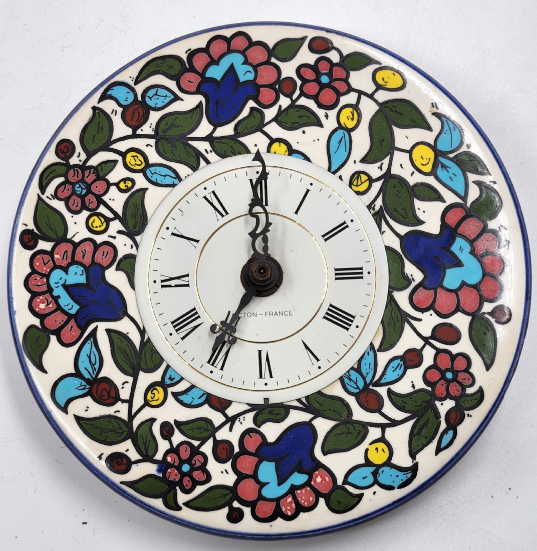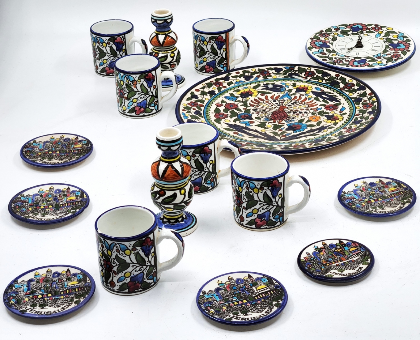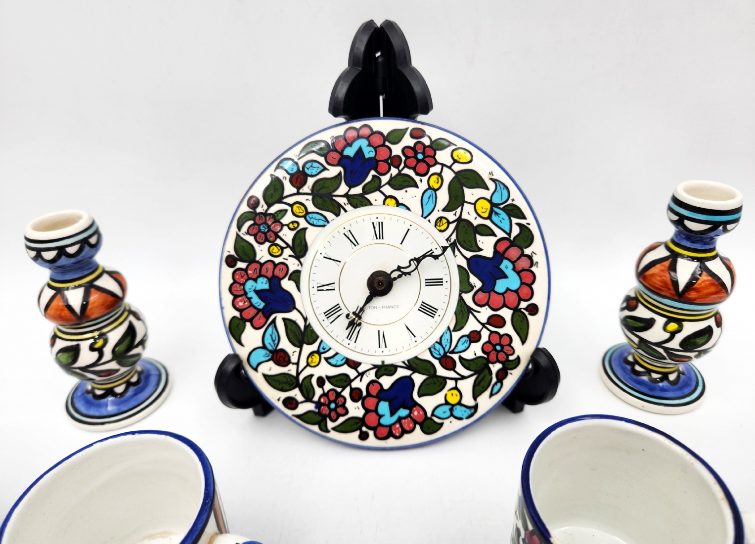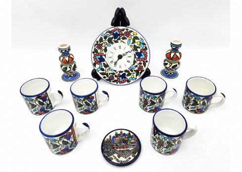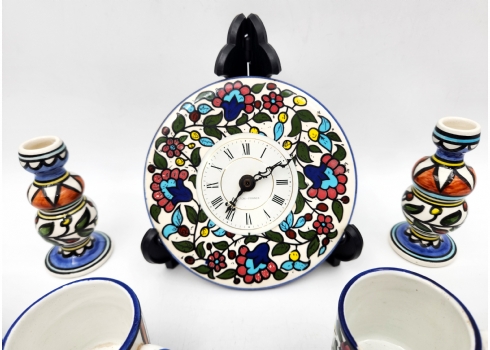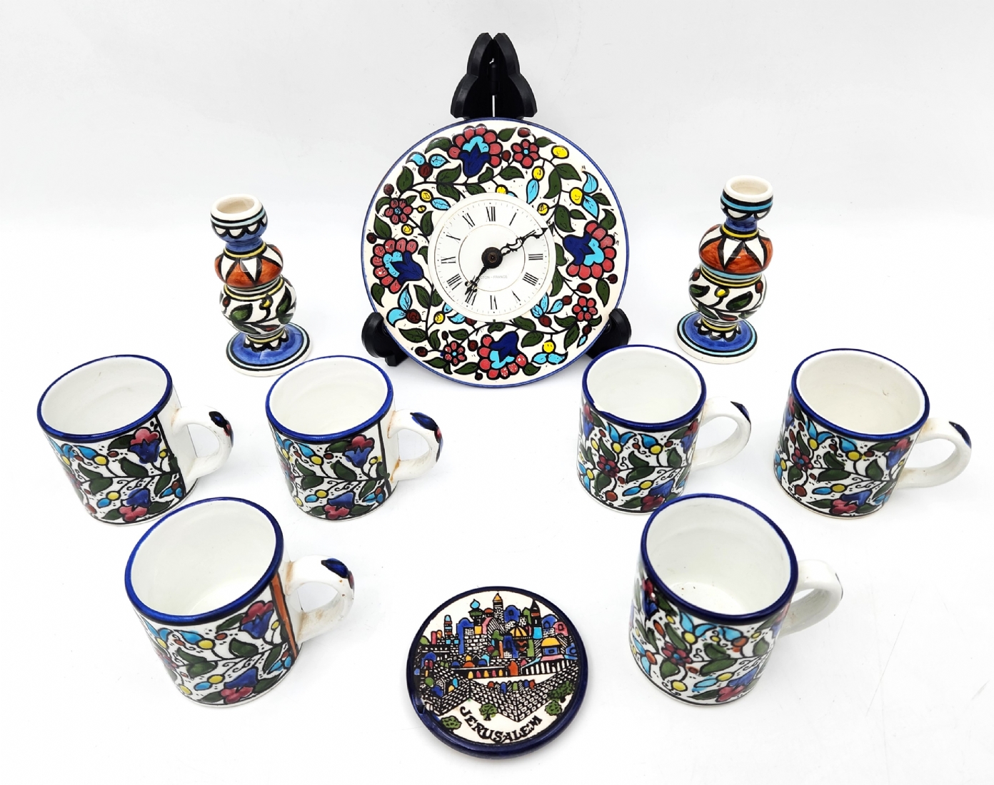 לוט של חפצי קרמיקה ארמנית ישנים שונים הכוללים: צלחת בקוטר: 27 ס"מ, שעון קיר בקוטר 16 ס"מ (יש לחלץ מהשעון סוללה ישנה) זוג פמוטים בגובה 12 ס"מ, 6 מדליונים בקוטר 8 ס"מ, ו 6 כוסות בגובה 7 ס"מ, חלקם חתומים (צ'יפ באחת הכוסות וצ'יפ זעיר לשפת הצלחת הגדולה - מצולם).