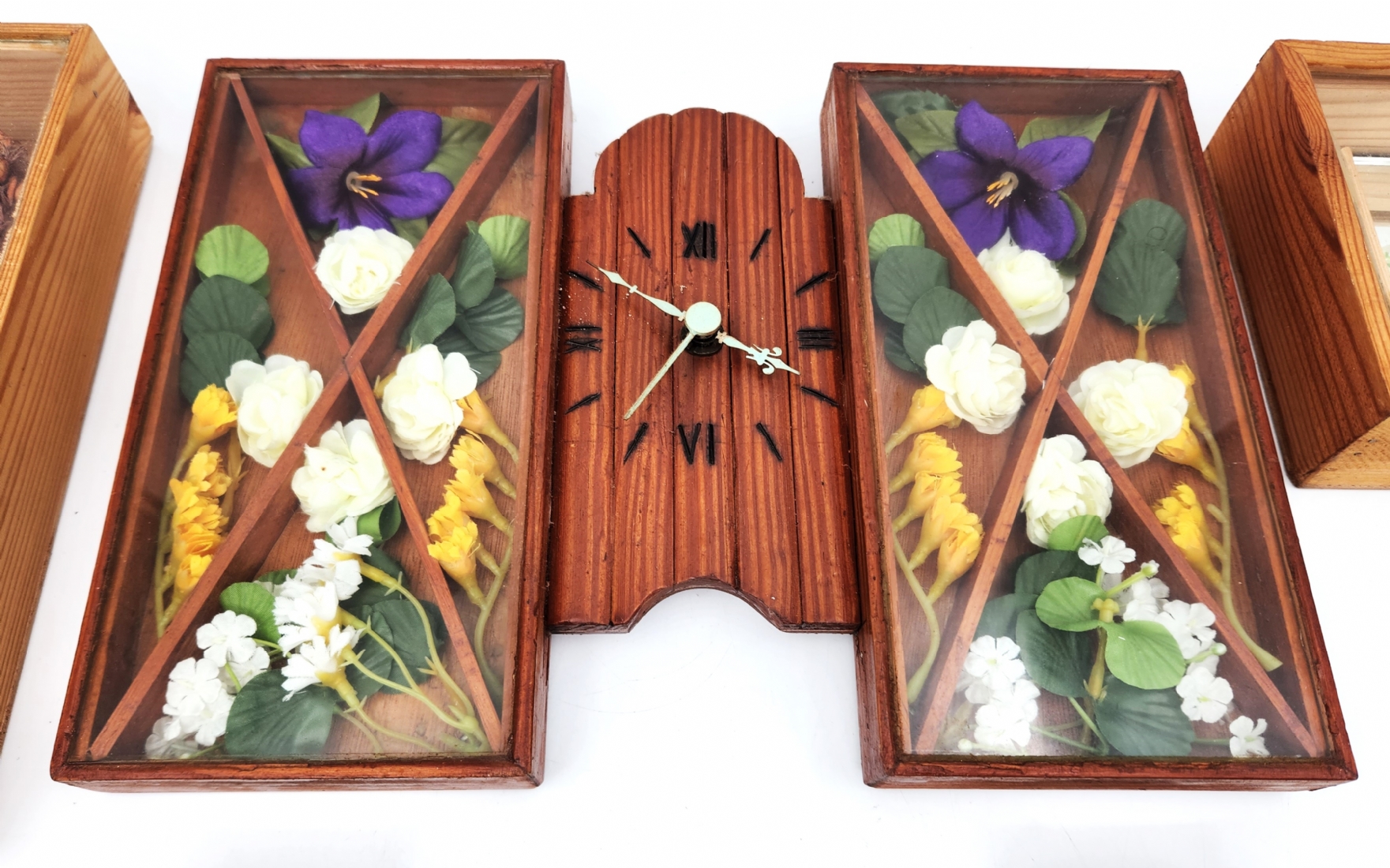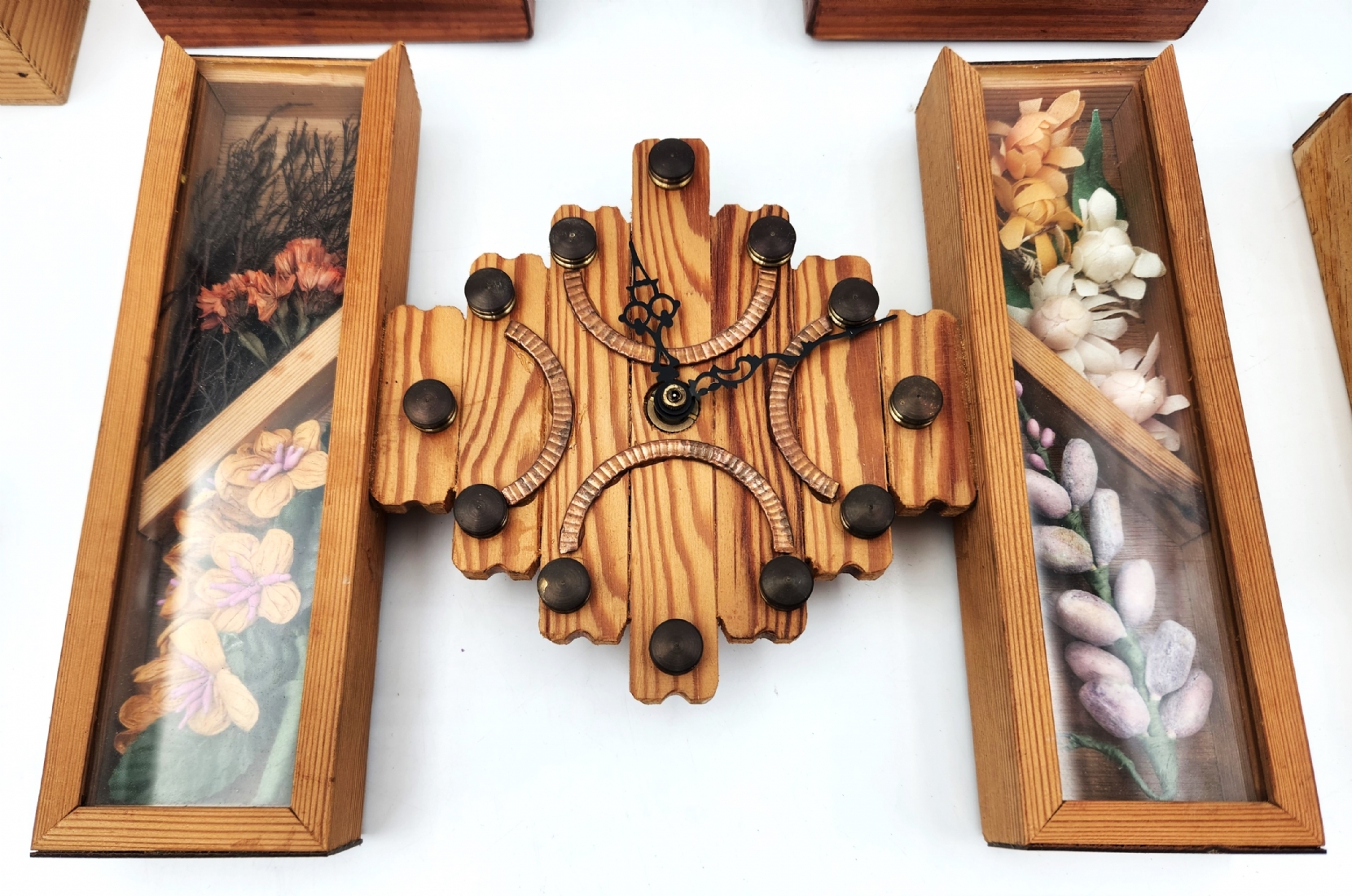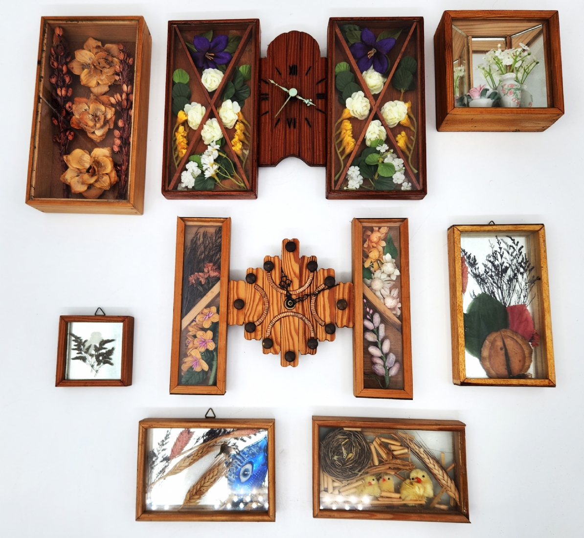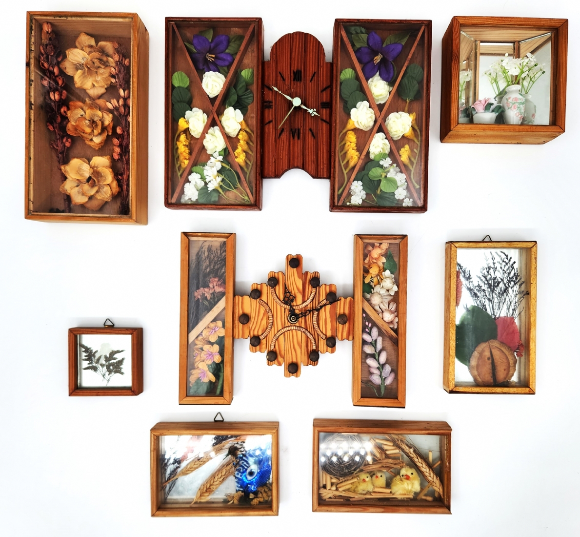 לוט של 8 קישוטים ומניאטורות ממוסגרים בתיבות עץ, אורך השעון הגדול: 31 ס"מ, מידות התיבה הקטנה: 8X8 ס"מ.