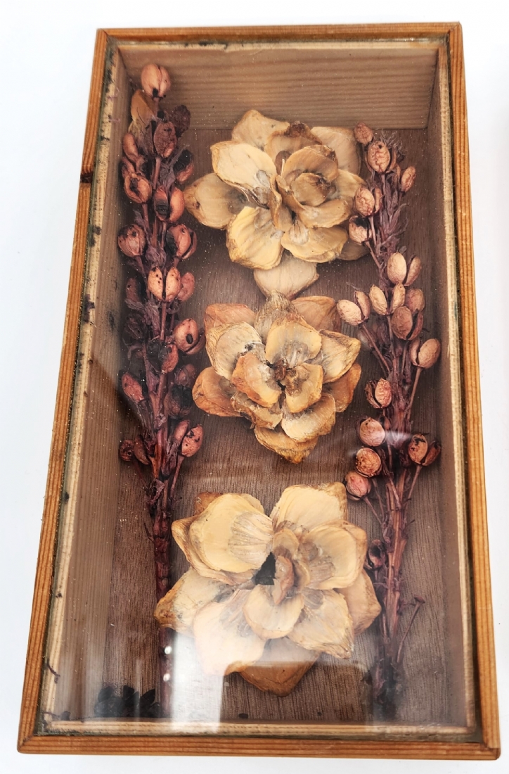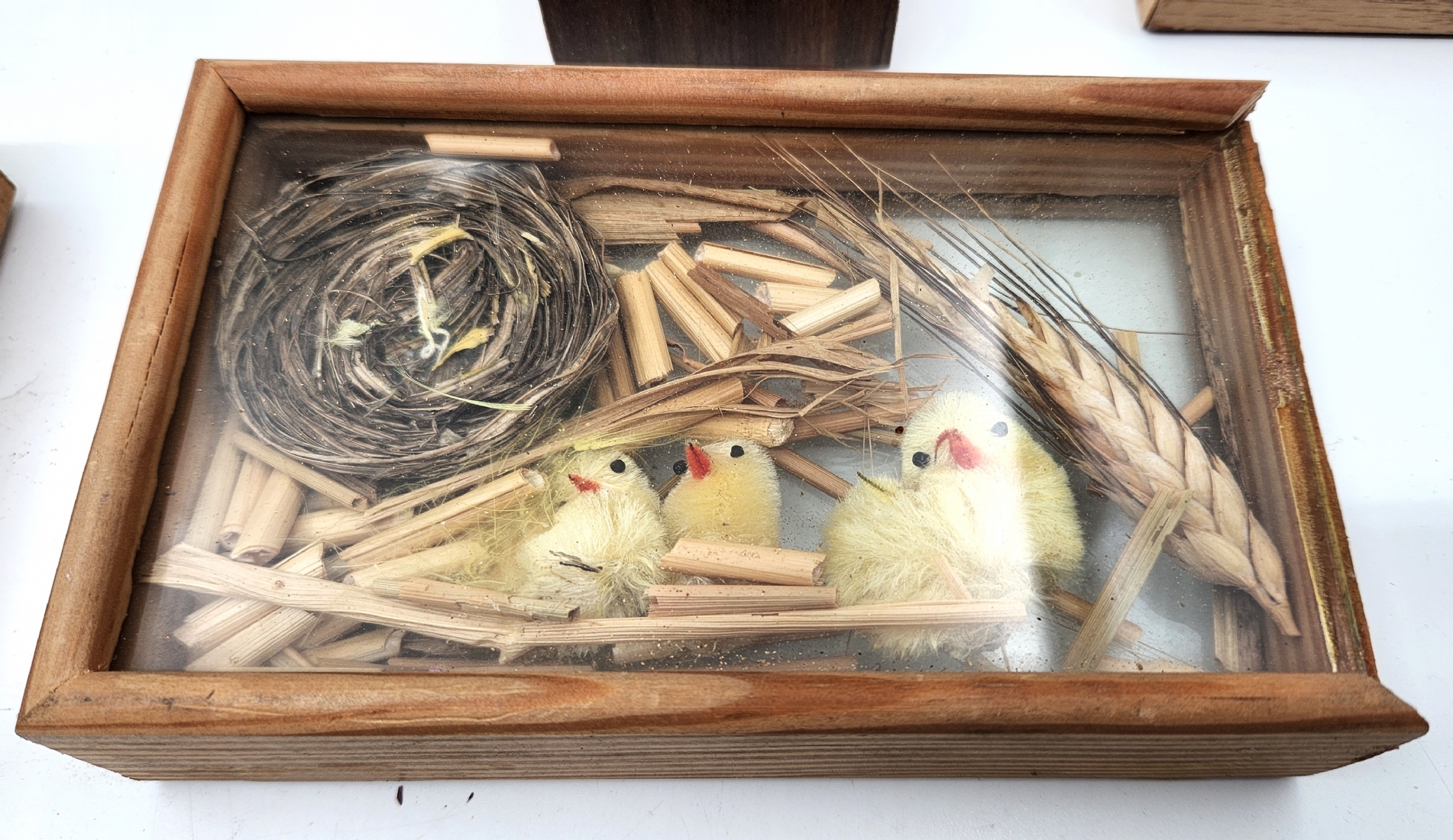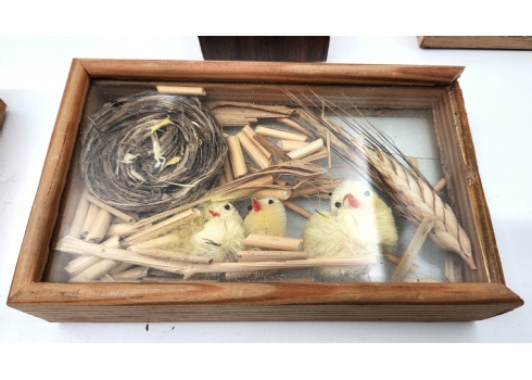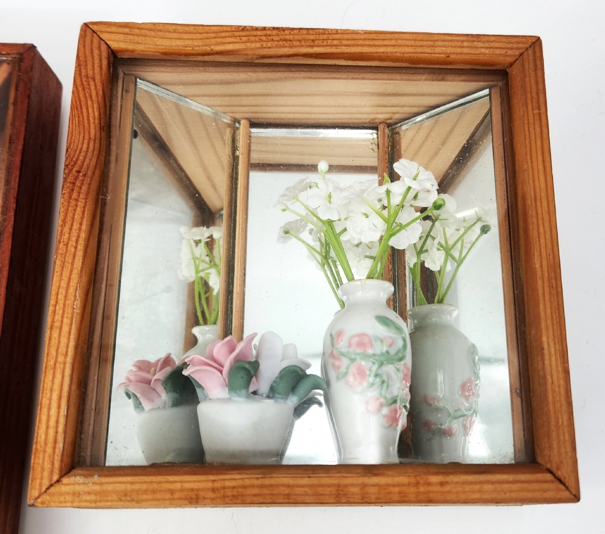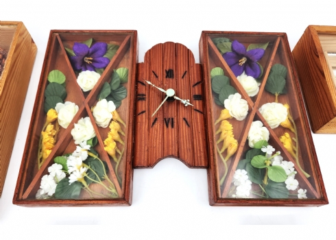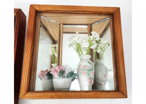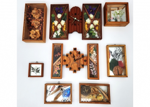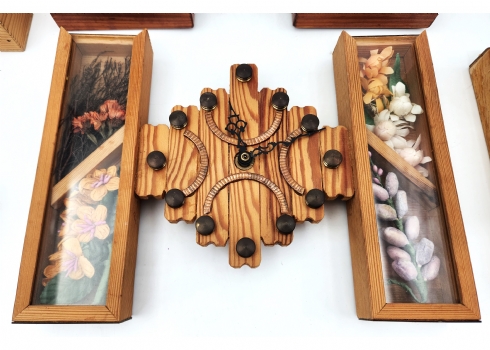 לוט של 8 קישוטים ומניאטורות ממוסגרים בתיבות עץ, אורך השעון הגדול: 31 ס"מ, מידות התיבה הקטנה: 8X8 ס"מ.
