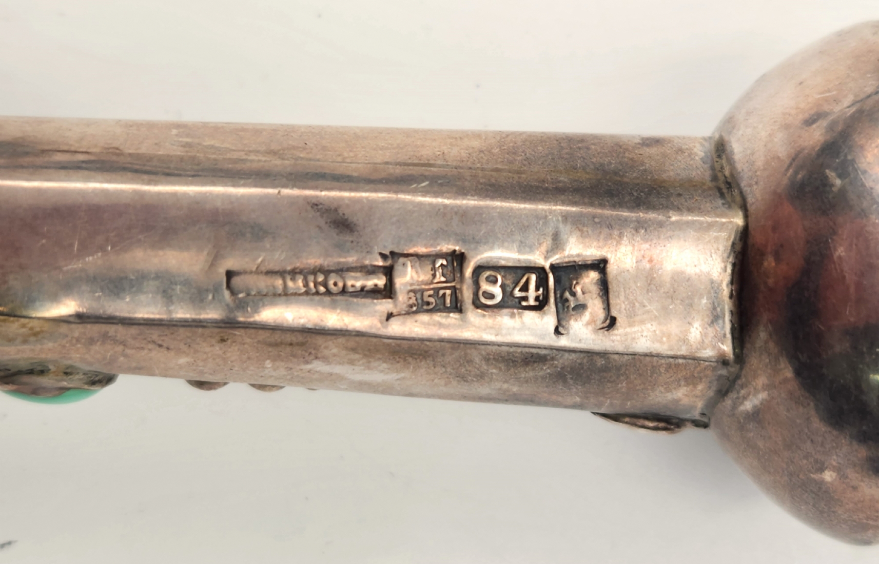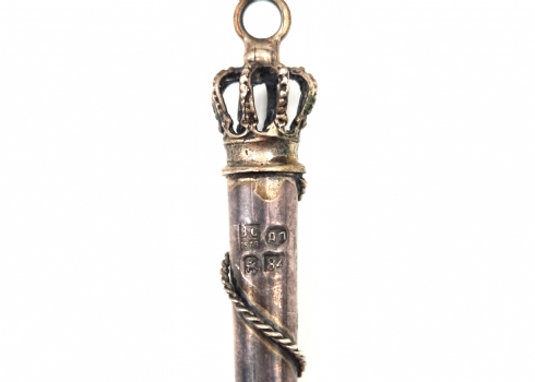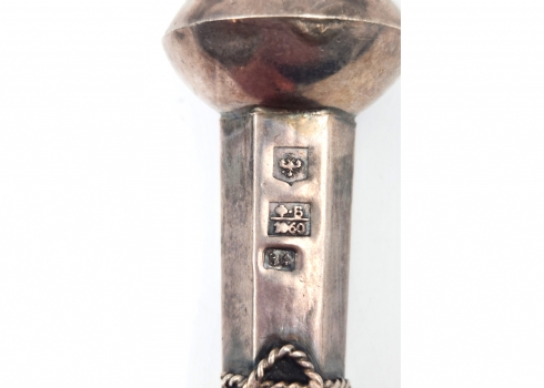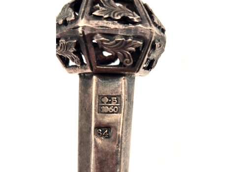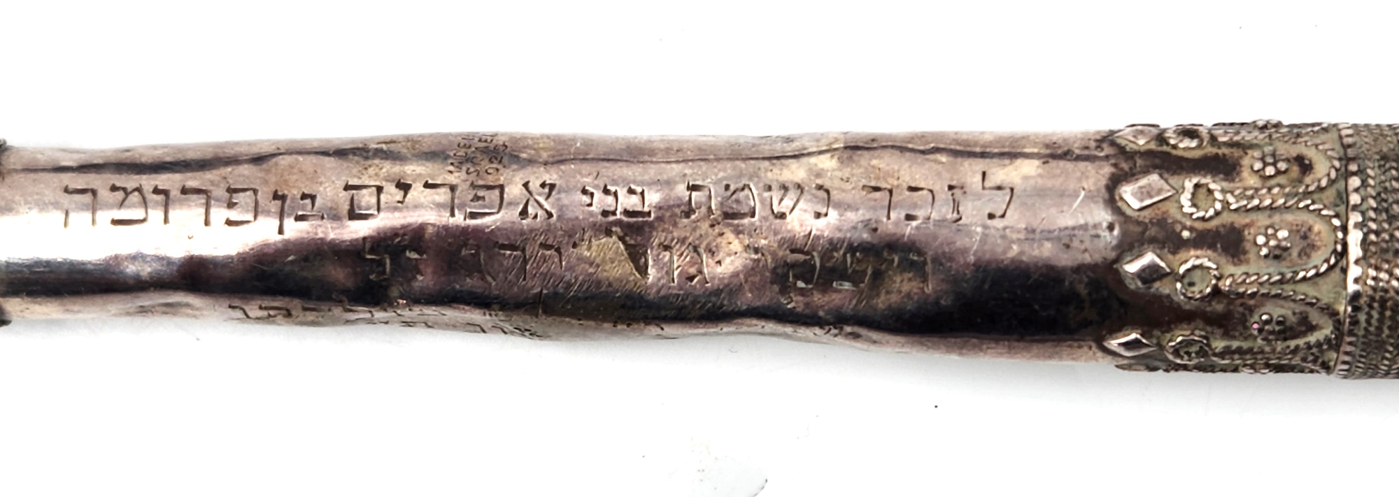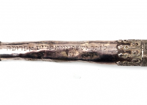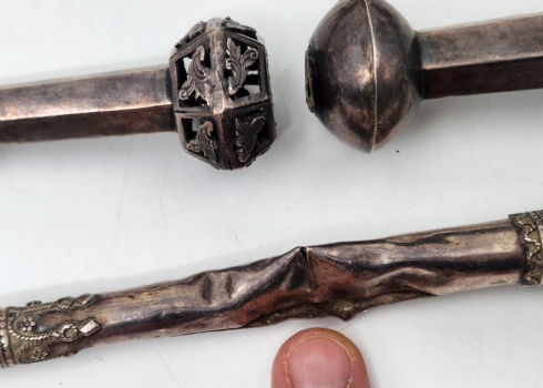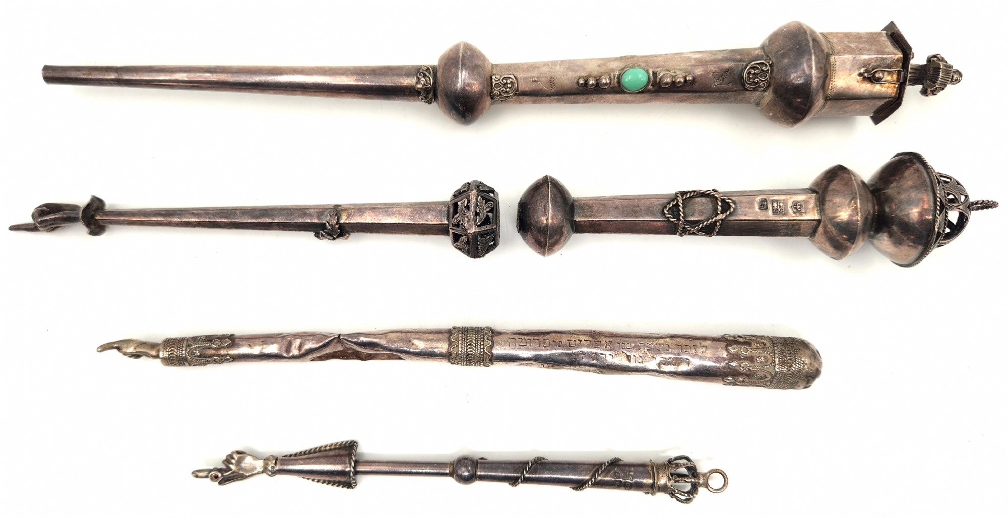 לוט של 4 אצבעות כסף לספר תורה (שלוש מהן פגומות - מצולם), הקטנה ביותר שלמה, שלוש מתוכן חתומות, משקול כולל: 247 גרם סה"כ, אורך בהתאמה: מ 18 עד 34 ס"מ.,
