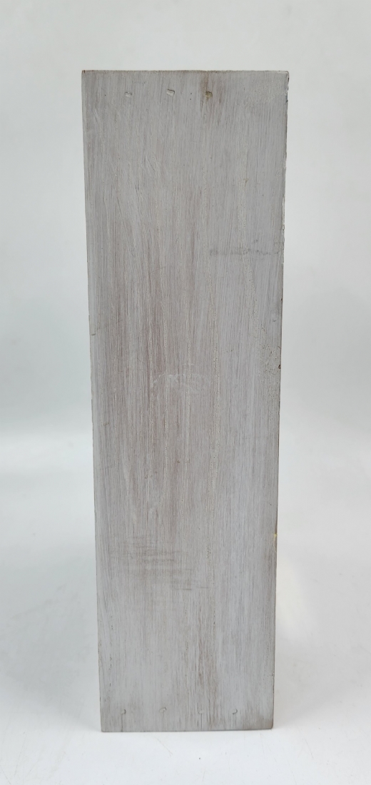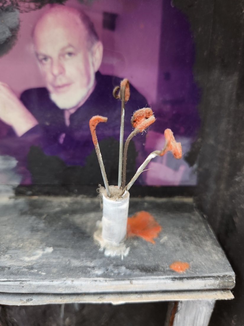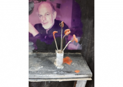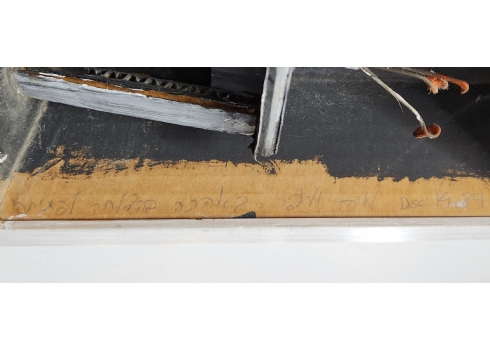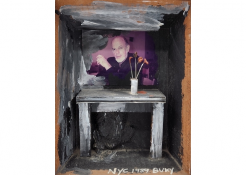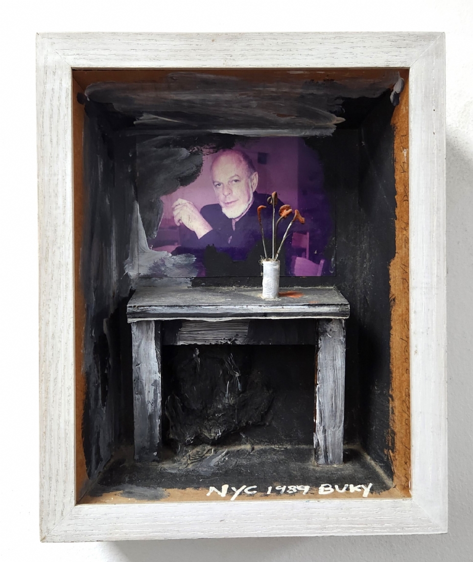 בוקי שוורץ - עבודה בתלת מיימד, טכניקה מעורבת וצילום, חתום ניו יורק 1989, עומק: 8 ס"מ, רוחב החזית: 22 ס"מ וגובה: 27.5 ס"מ.