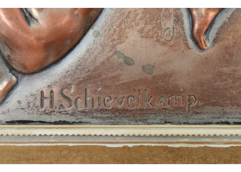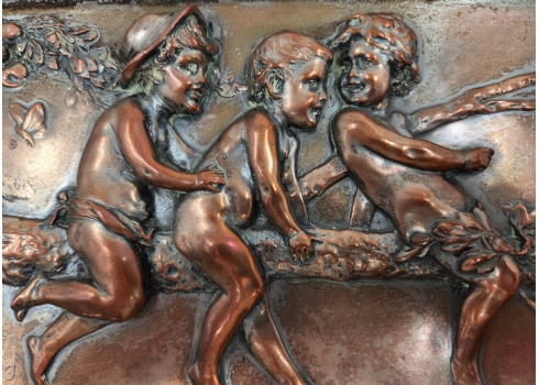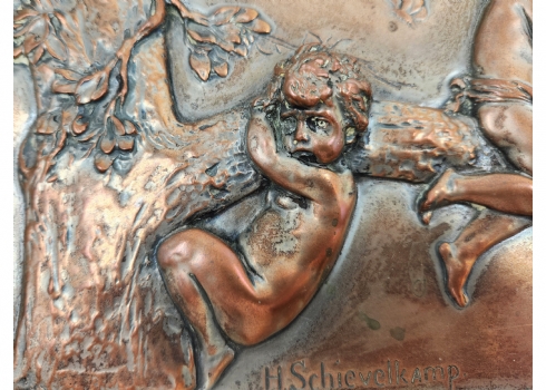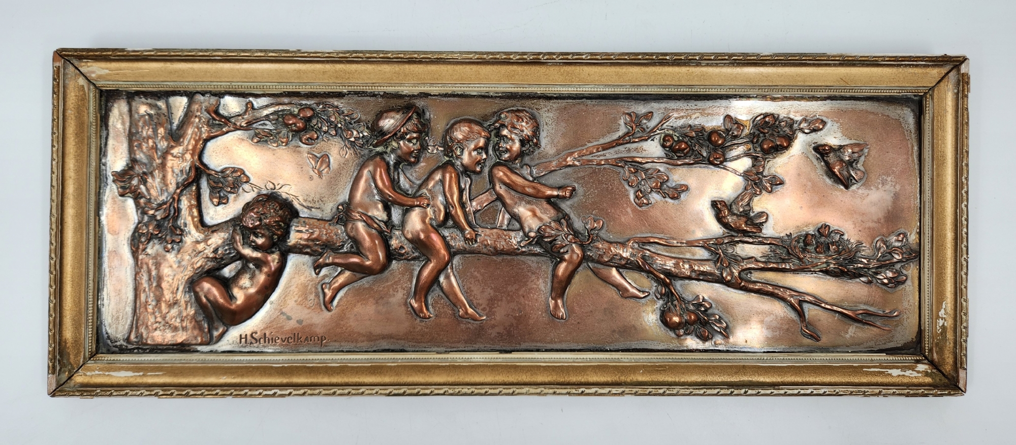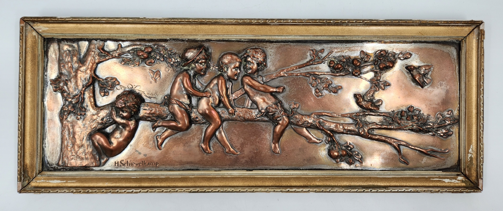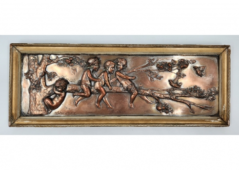 הלמוט שיוולקאמפ (Helmuth Schievelkamp, גרמני 1849-1936) - 'ארבעה ילדים על ענף של עץ' - תבליט גרמני עתיק, עשוי נחושת, חתום, מידות התבליט עצמו: 15X47 ס"מ, מידות המסגרת (פגמים למסגרת / מצולם): 9.5X51.5 ס"מ.