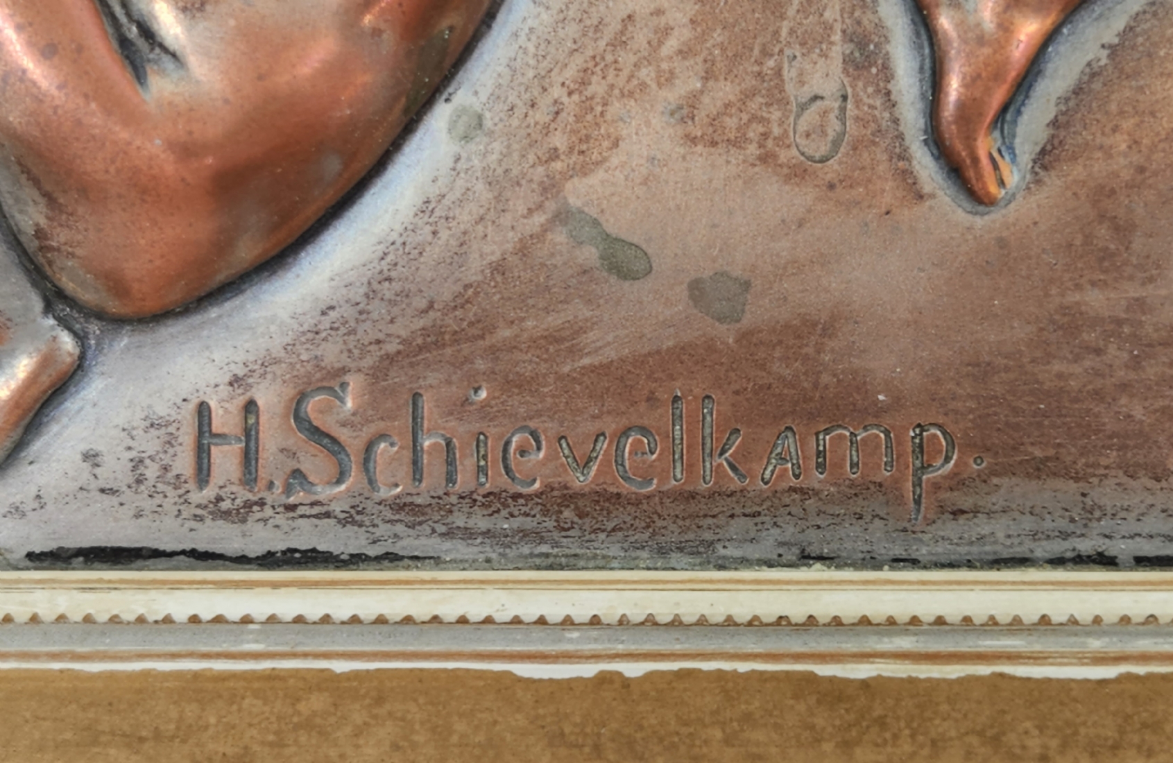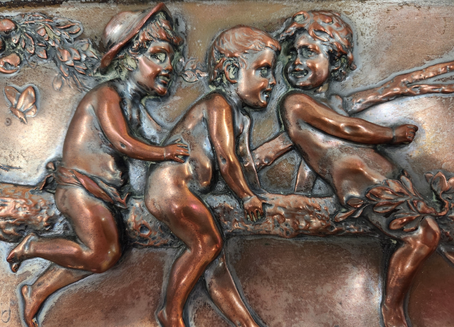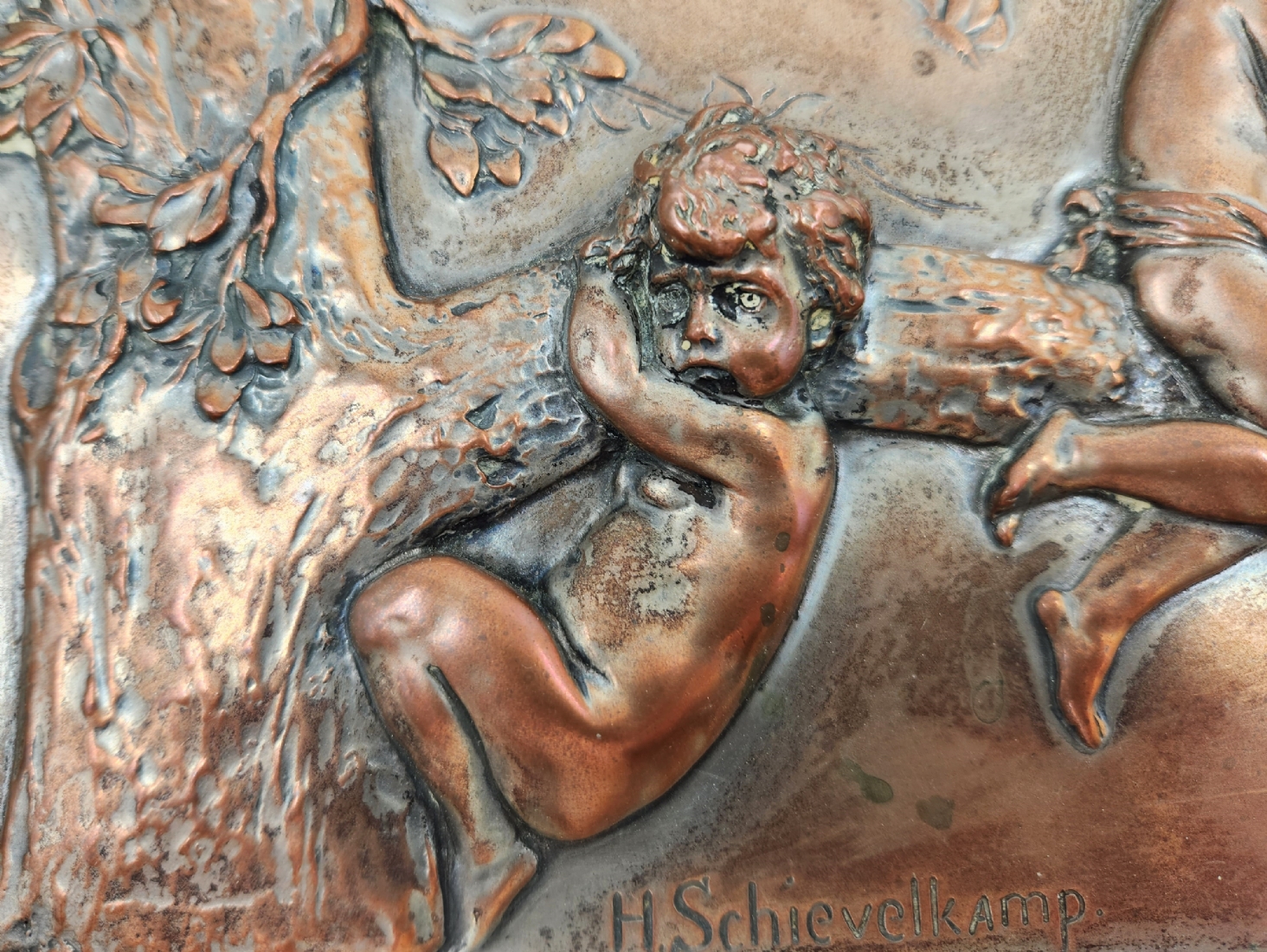 הלמוט שיוולקאמפ (Helmuth Schievelkamp, גרמני 1849-1936) - 'ארבעה ילדים על ענף של עץ' - תבליט גרמני עתיק, עשוי נחושת, חתום, מידות התבליט עצמו: 15X47 ס"מ, מידות המסגרת (פגמים למסגרת / מצולם): 9.5X51.5 ס"מ.