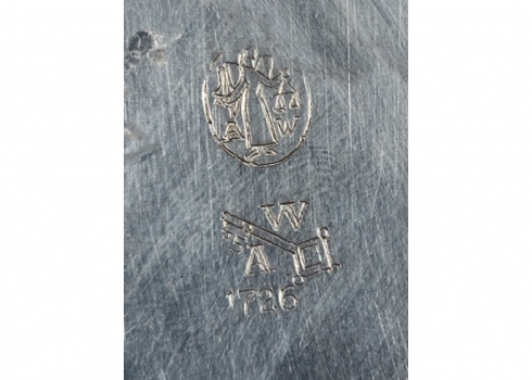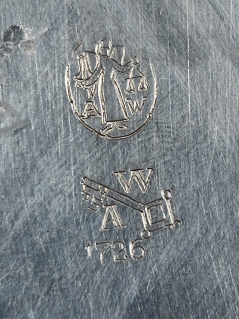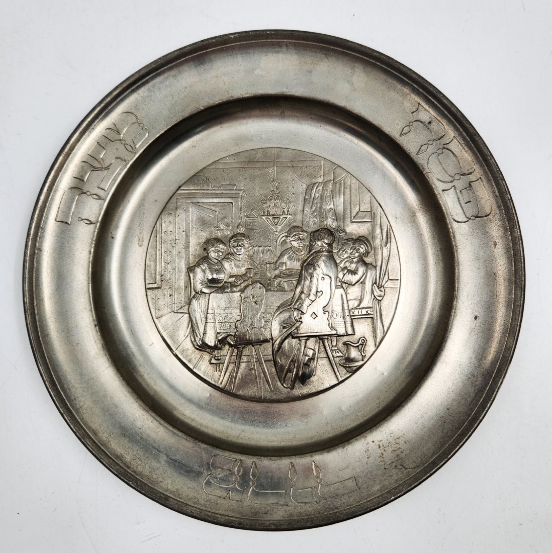 צלחת פסח ישנה, עשויה פיוטר, מעוטרת בכיתוב עברי ובלט של משפחה סביב שולחן ערוך, חתומה, ניתנת לתליה, קוטר 23 ס"מ.