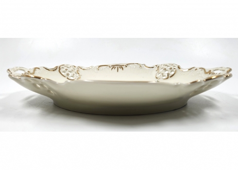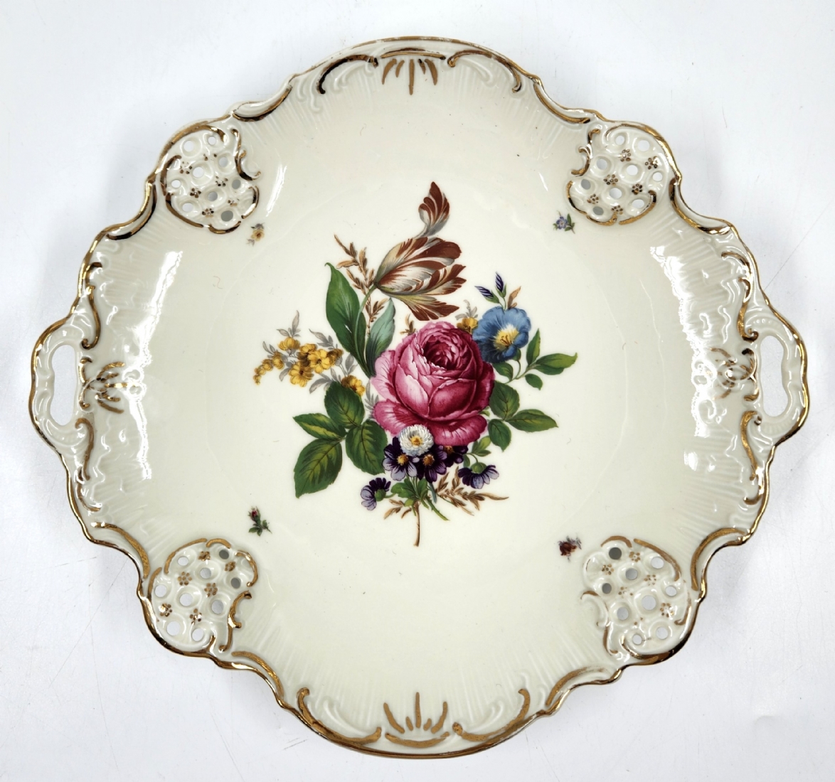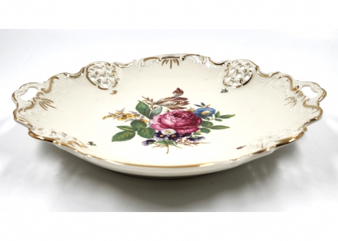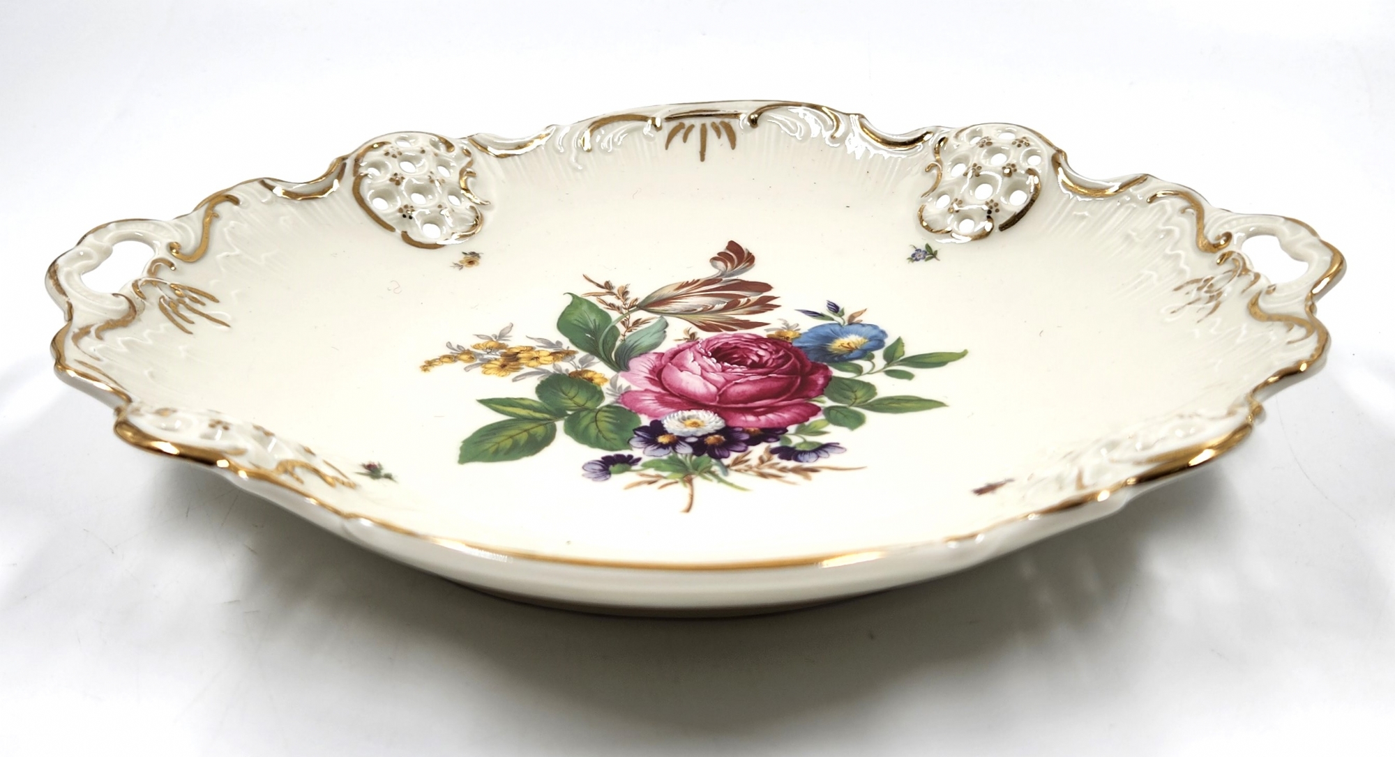 צלחת פירות גרמנית ישנה מתוצרת: 'רוזנטל' (Rosenthal), מעוטרת בהדפסים פרחוניים ובזהב על רקע ארבע מגרעות 'תחרה' (Open Work), חתומה, רוחב כולל ידיות: 30 ס"מ.