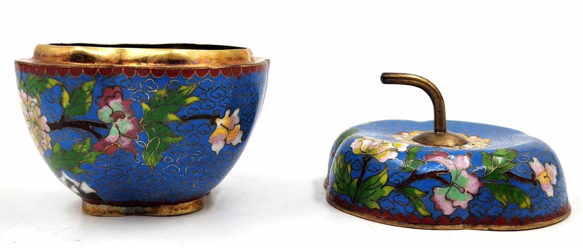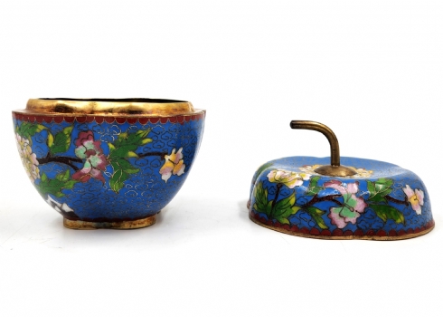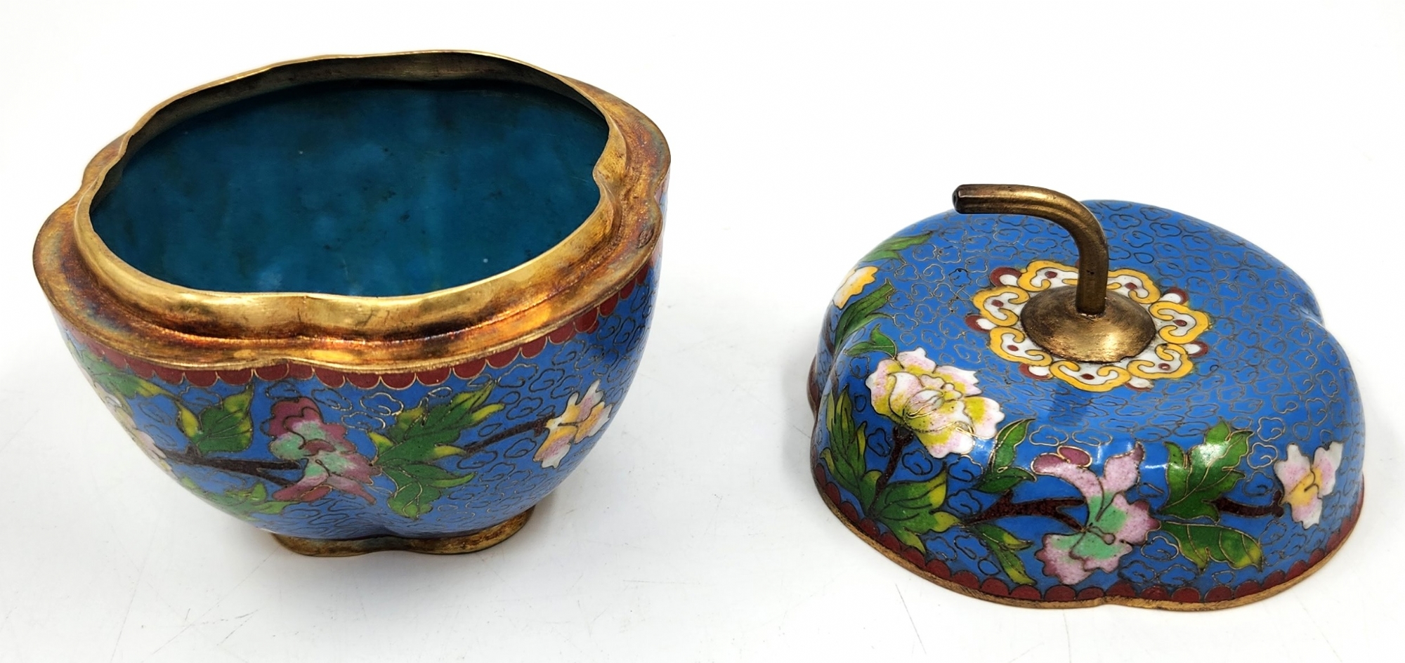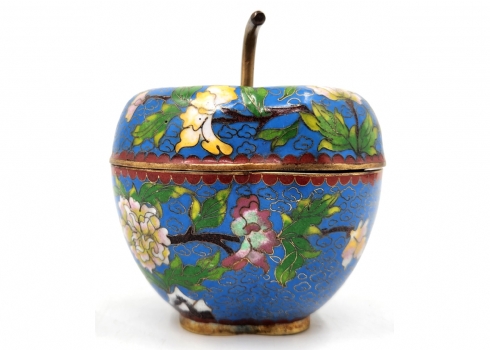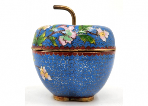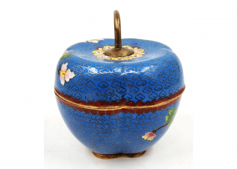 קופסה סינית ישנה ויפה ומכסה תואם, מעוצבת בצורת תפוח עץ, עשויה נחושת מוזהבת ומעוטרת אמייל קלואזונה (Cloisonne) בדגם פרחים על רקע בגוון טורקיז, רוחב: 10 ס"מ, גובה: 11 ס"מ.