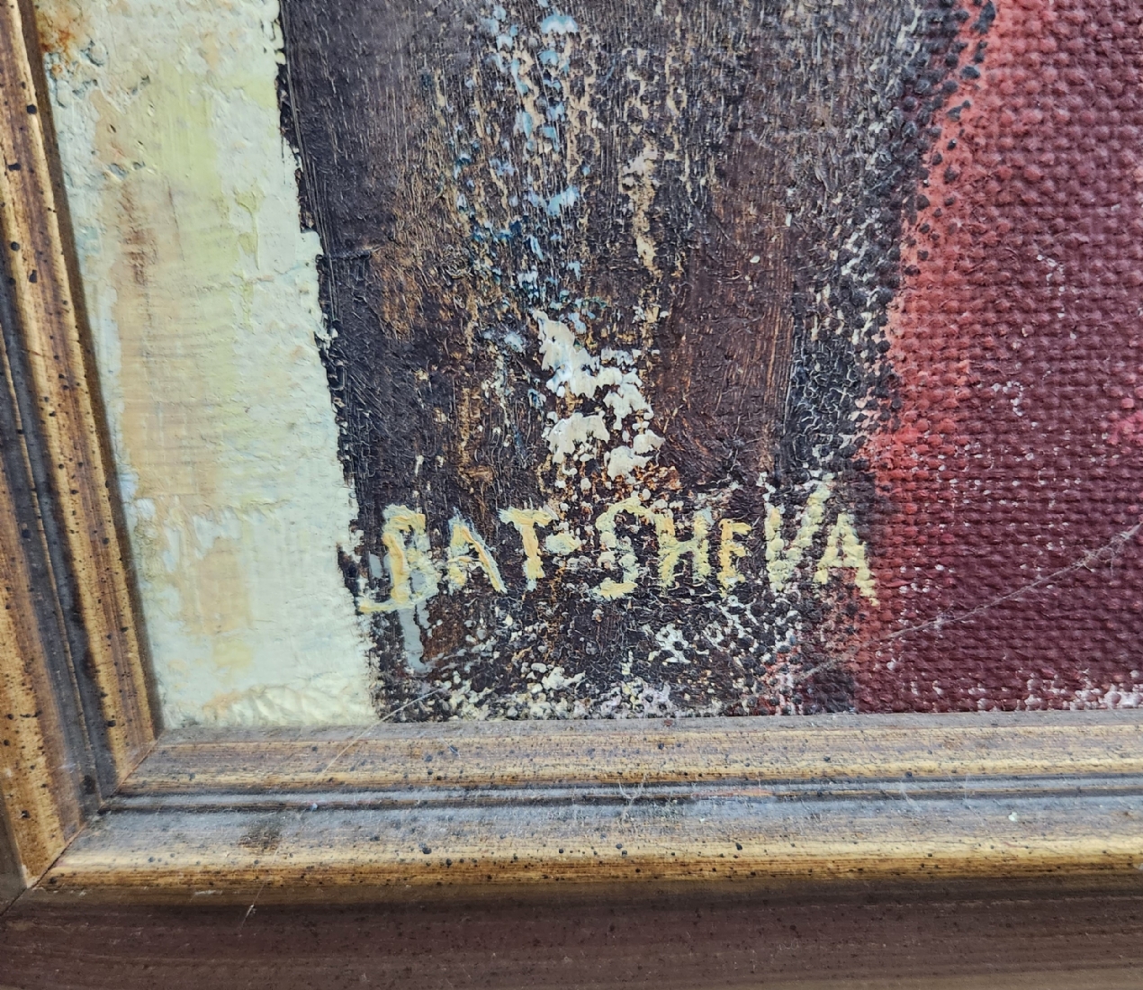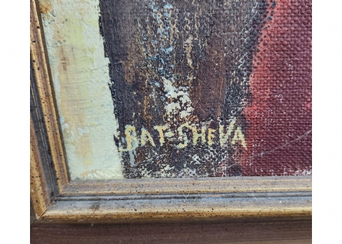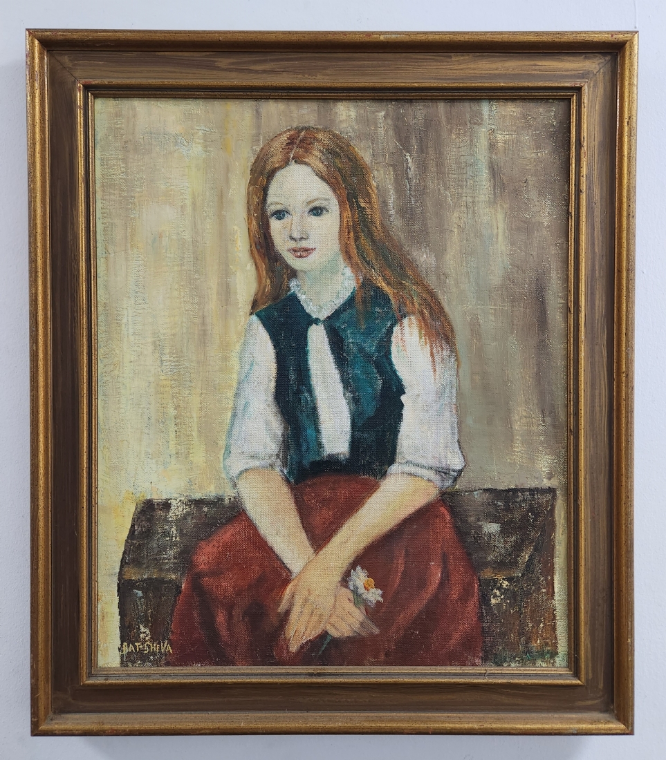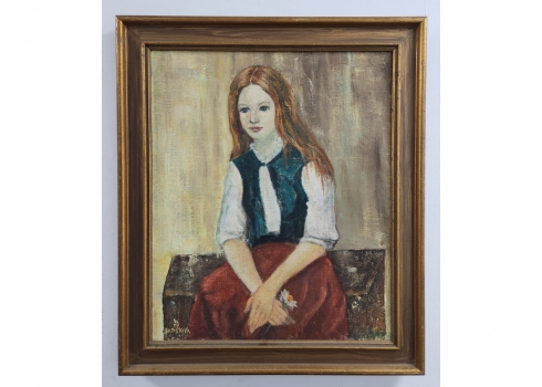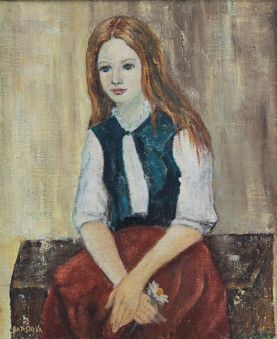 בת שבע - 'נערה יושבת' - שמן על בד, חתום ומתוארך בגבו 1977, מידות: 60X50 ס"מ, 73X63 ס"מ.