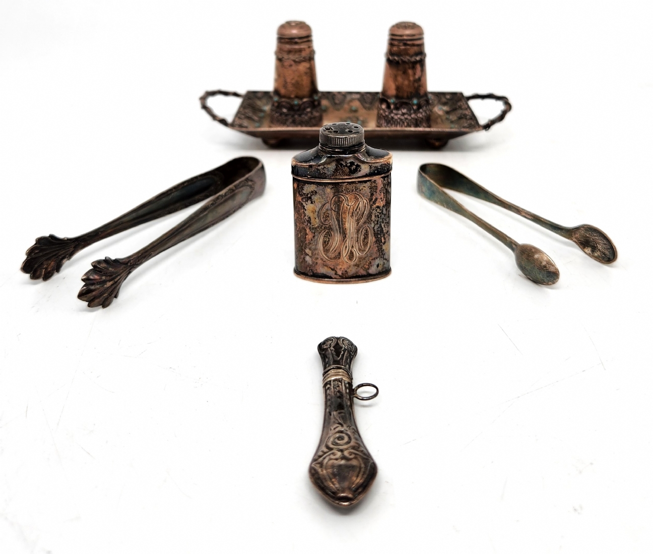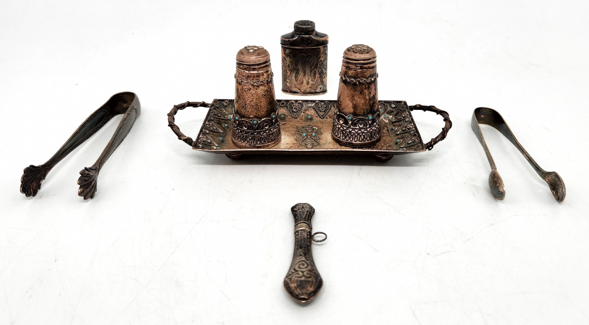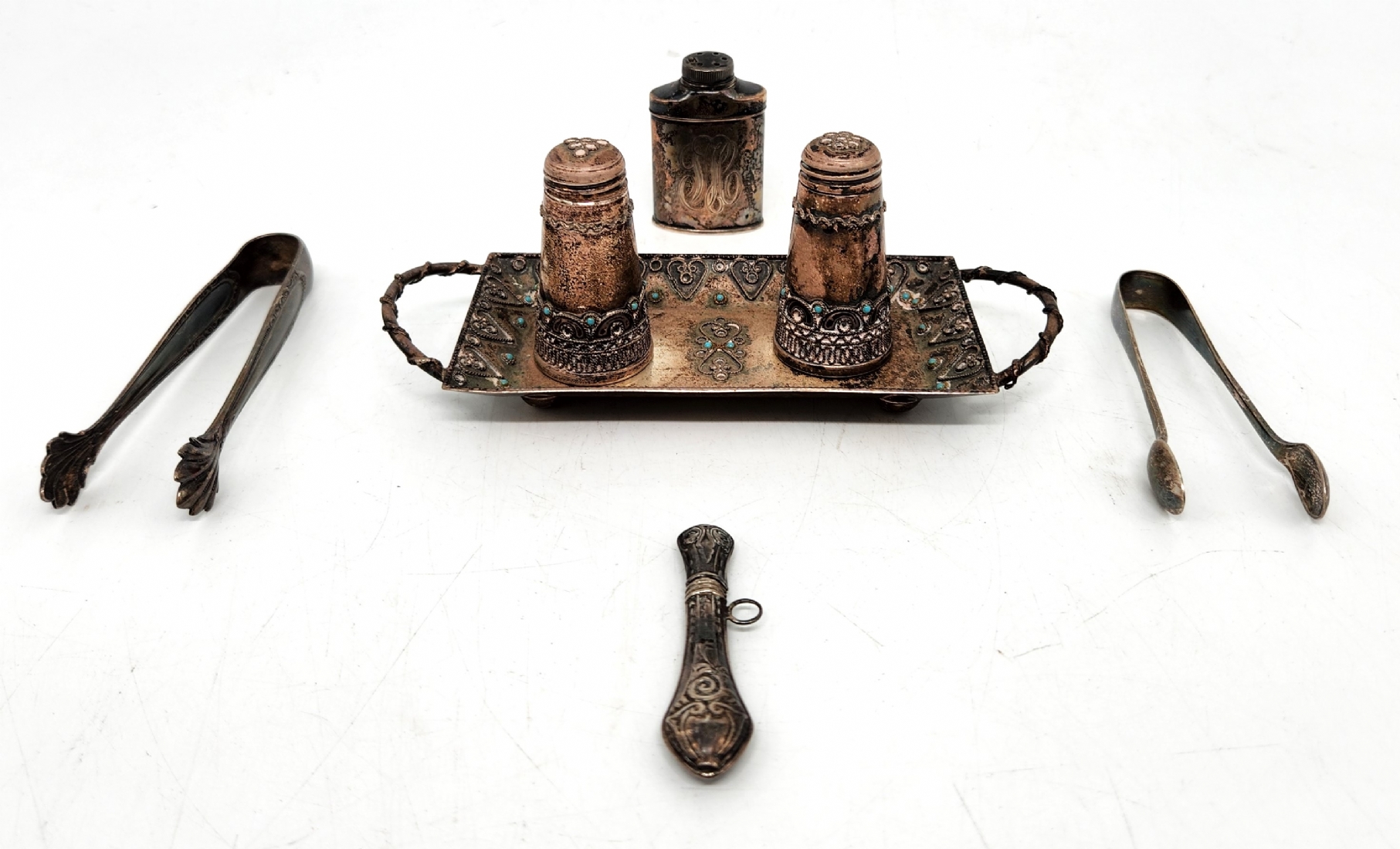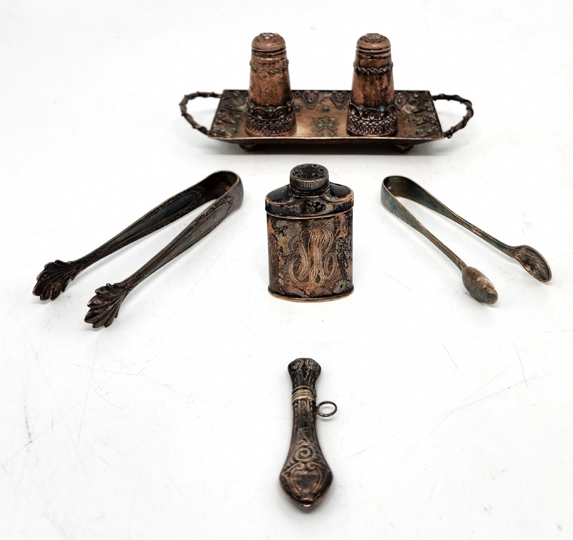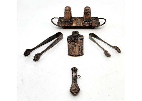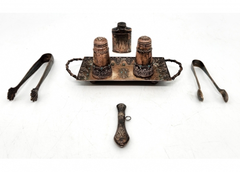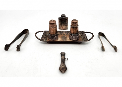 לוט של 7 חפצי כסף ישנים קטנים, שונים, בעיצובים ויצרנים שונים, כולם חתומים, משקל כולל: 142 גרם סה"כ, אורך המגש כולל ידיות: 16 ס"מ.
