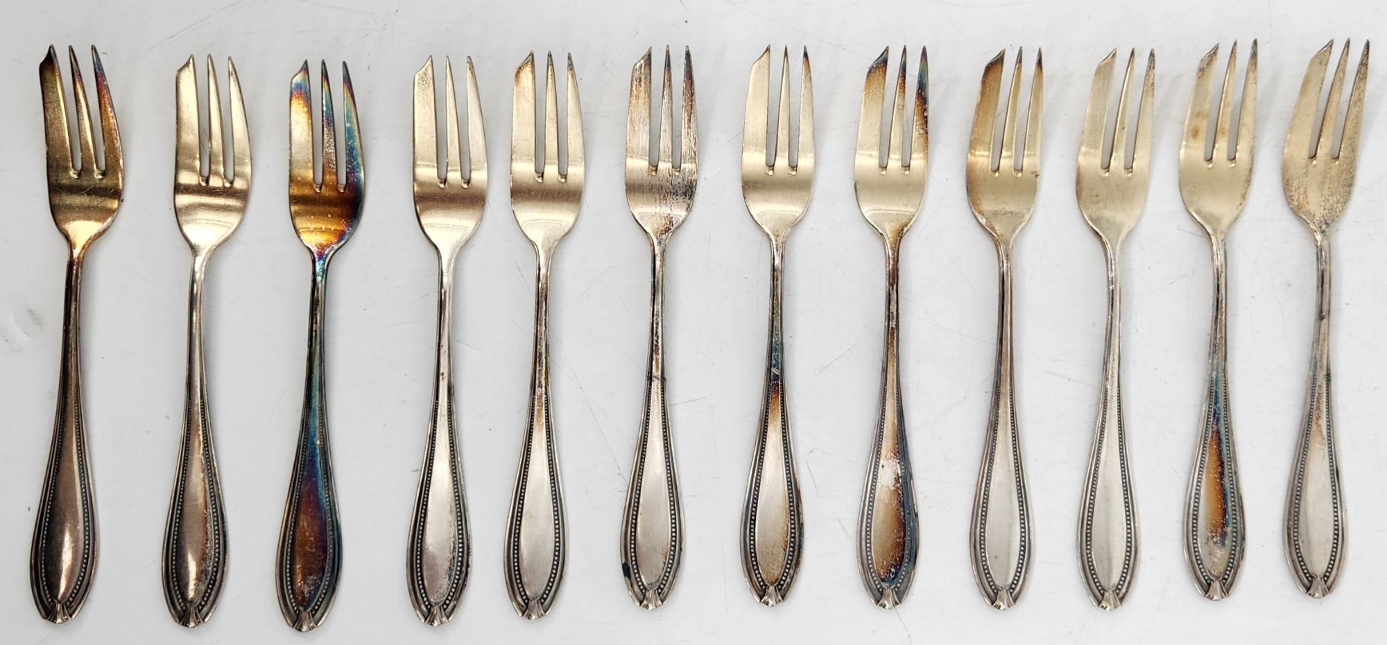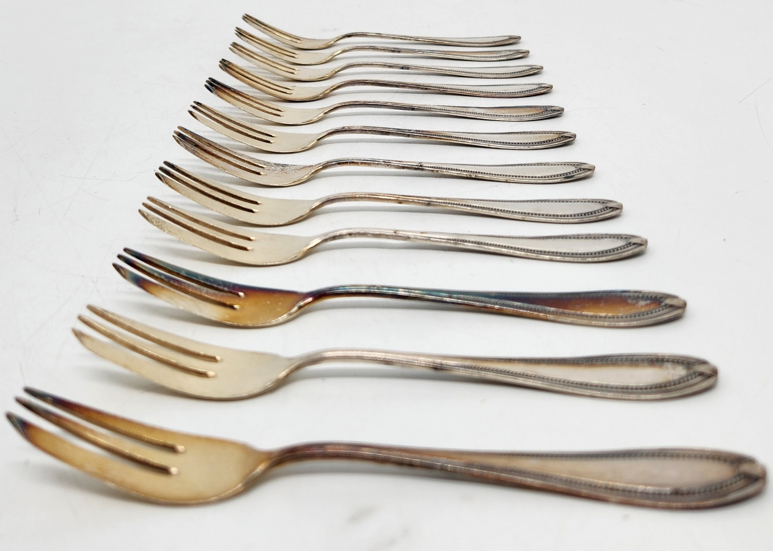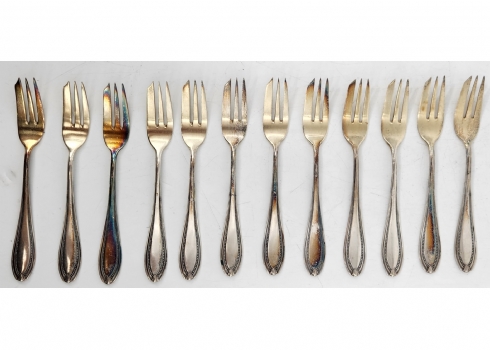 סט של 12 מזלגות כסף גרמניים ישנים מתחילת המאה העשרים, עשויים כסף '800', משקל כולל: 279 גרם סה"כ, אורך: 14 ס"מ.