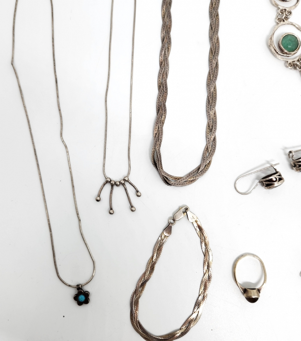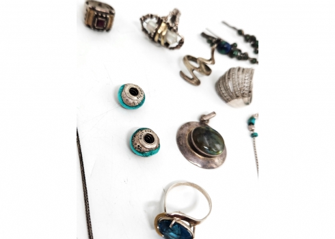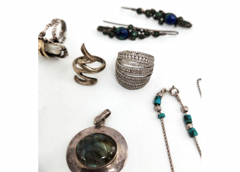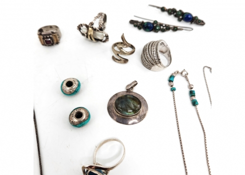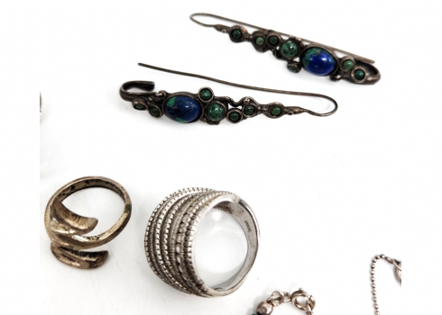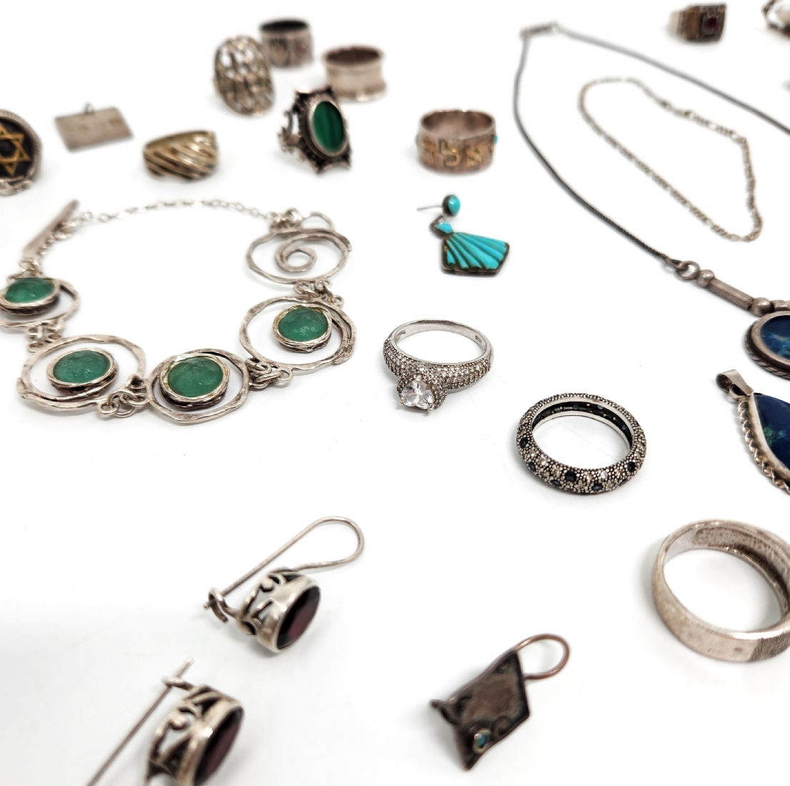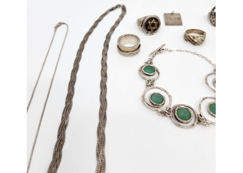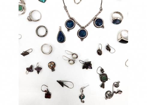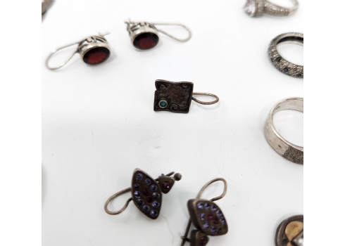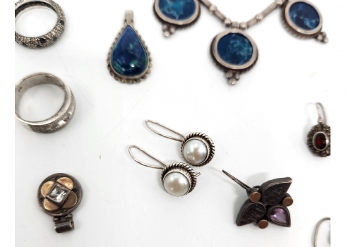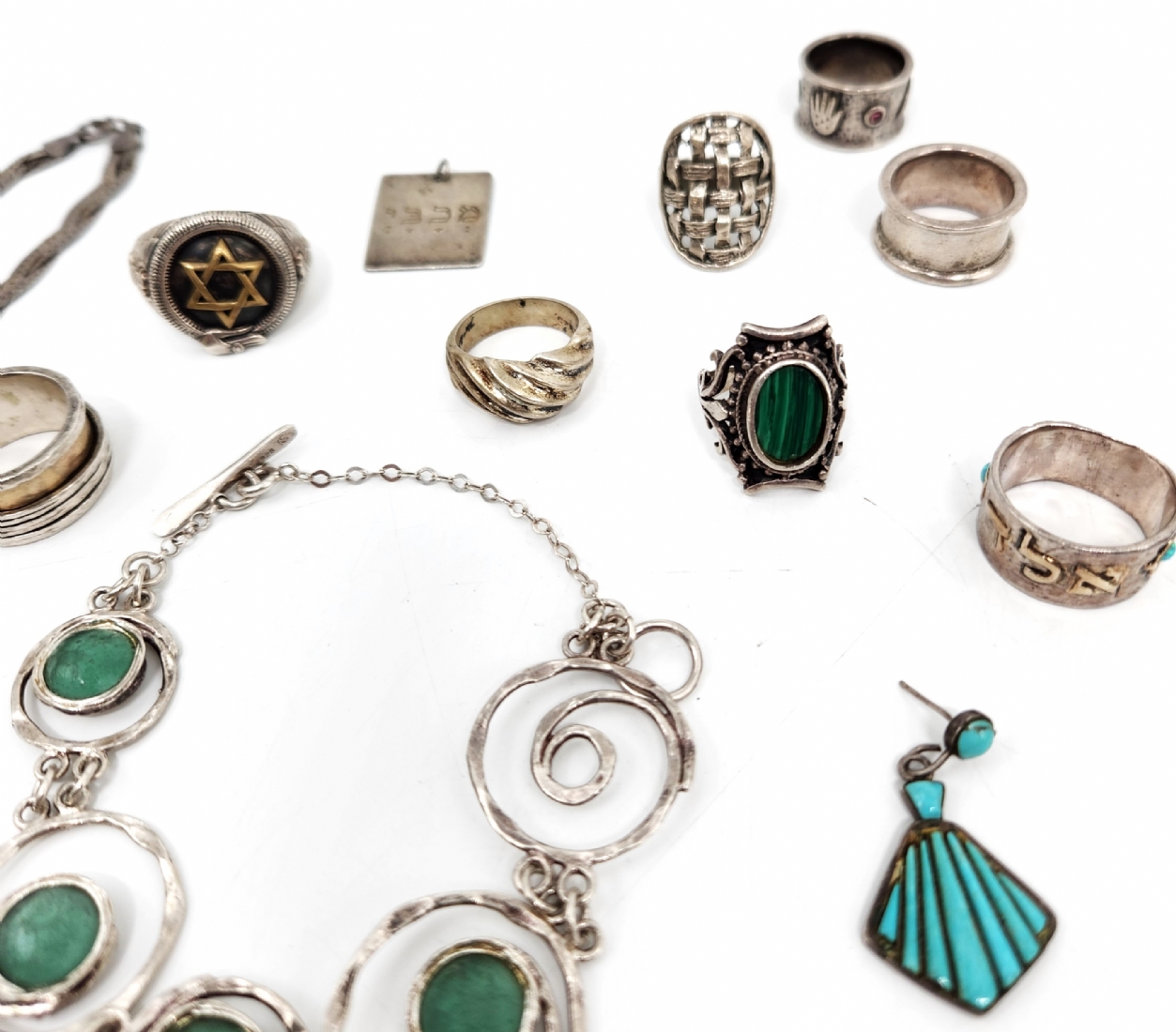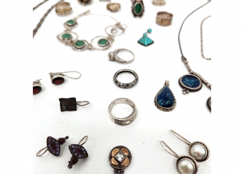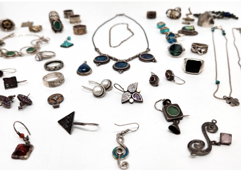 לוט סוחרים גדול ומגוון של 54 תכשיטי כסף ישנים שונים (יצרנים ודגמים שונים), חלק מהעגילים בודדים, חלק מהתכשיטים משובצים אבנים שונות, כולם עשויים כסף 'סטרלינג וכולם חתומים בחותמות כסף, משקל כולל: 330 גרם סה"כ.