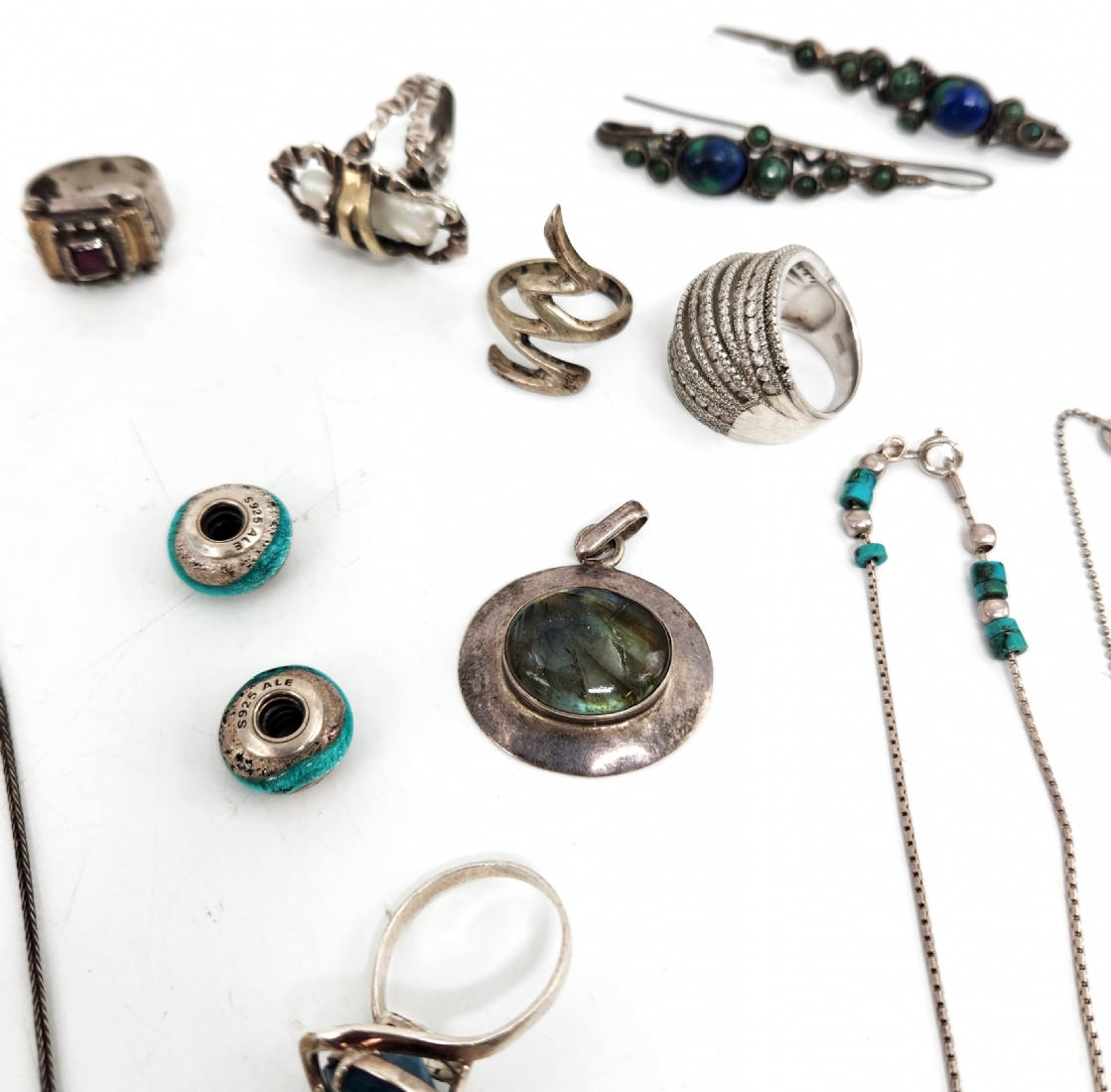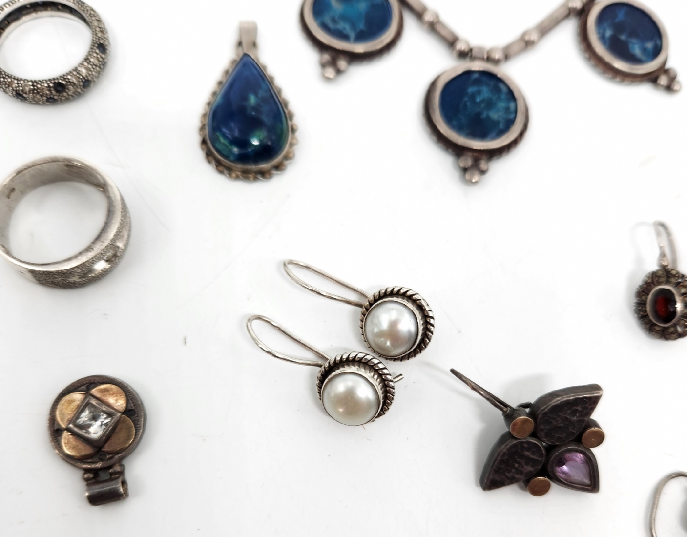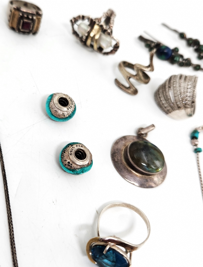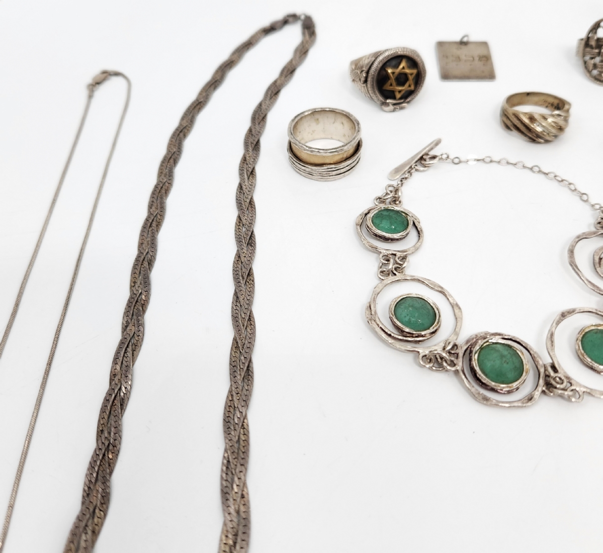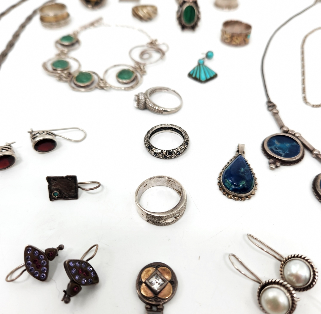 לוט סוחרים גדול ומגוון של 54 תכשיטי כסף ישנים שונים (יצרנים ודגמים שונים), חלק מהעגילים בודדים, חלק מהתכשיטים משובצים אבנים שונות, כולם עשויים כסף 'סטרלינג וכולם חתומים בחותמות כסף, משקל כולל: 330 גרם סה"כ.