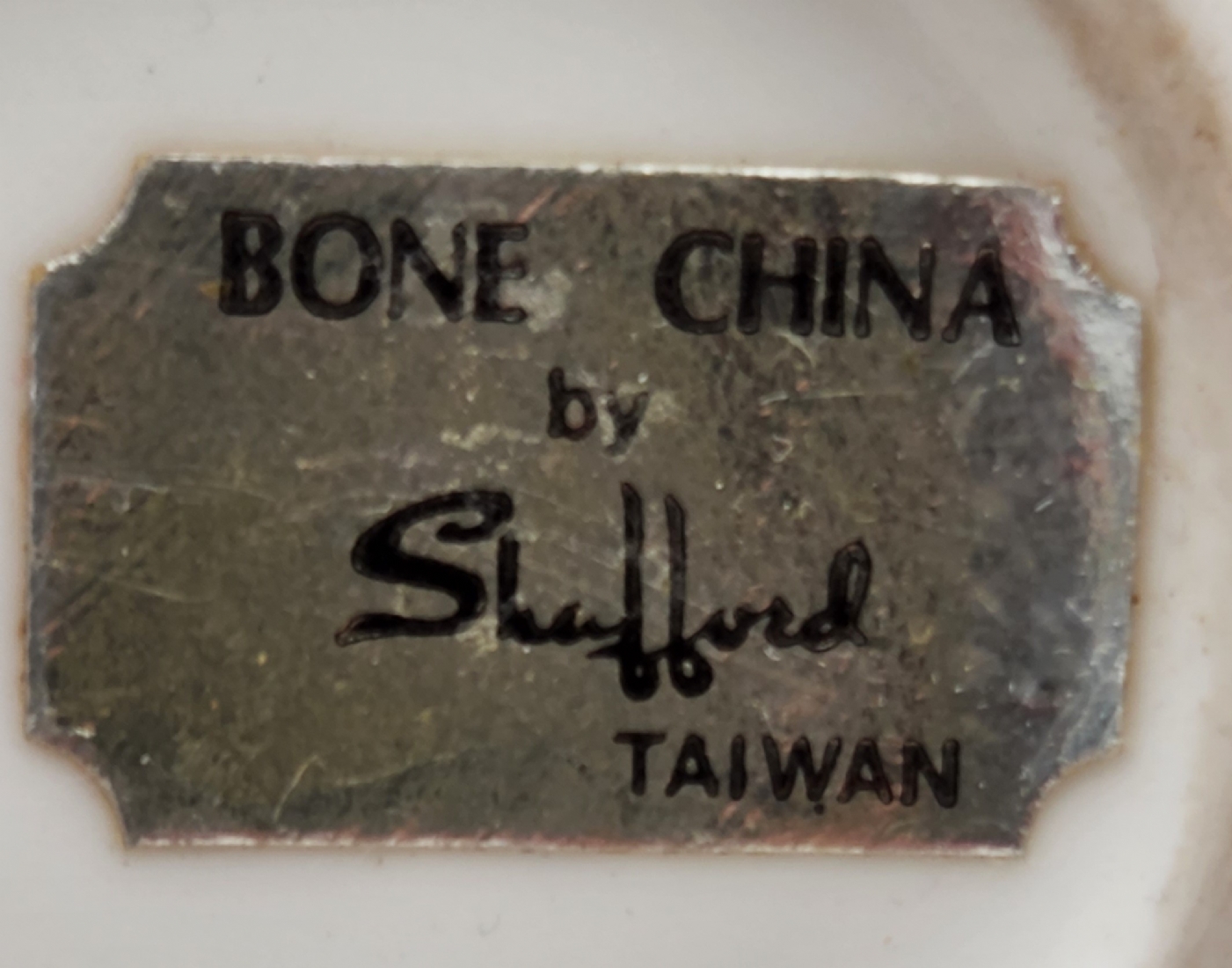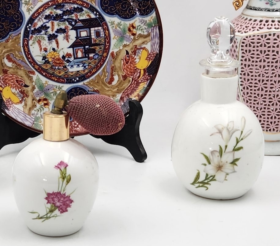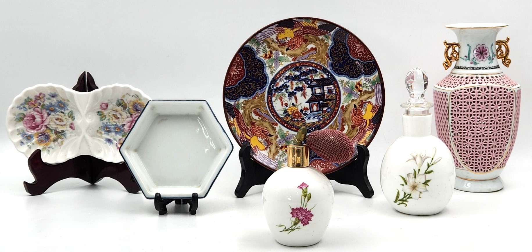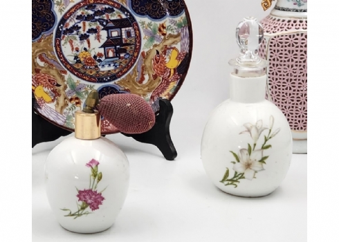 לוט של 6 כלי פורצלן וקרמיקה ישנים שונים, רובם לא חתומים, גובה האהיל מנורת הנישואין: 20.5 ס"מ, אורך הכלי הדו תאי: 8 ס"מ.