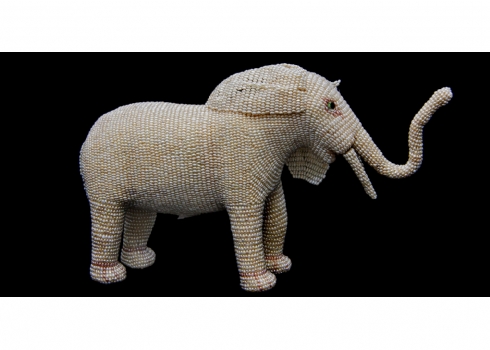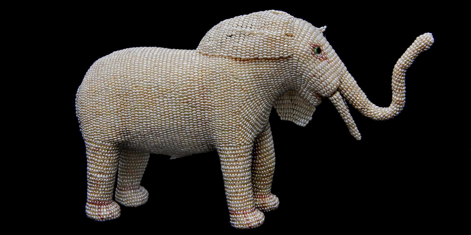 פיל עשוי בעבודת שריגה עדינה מחרוזי פנינים לבנים וורודים ממים מתוקים, פגם, גובה:22.