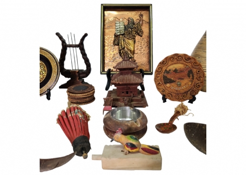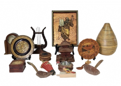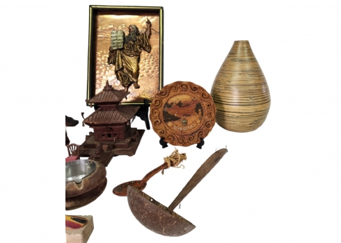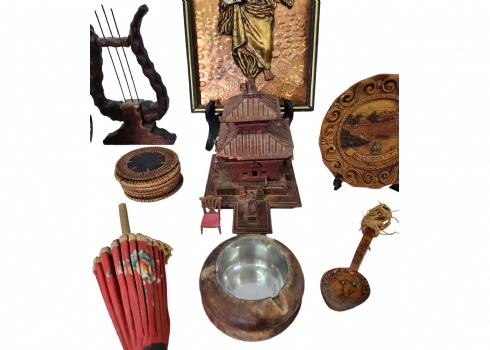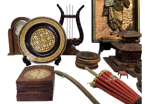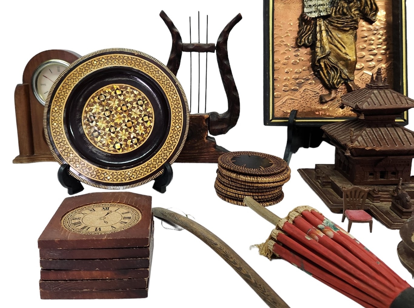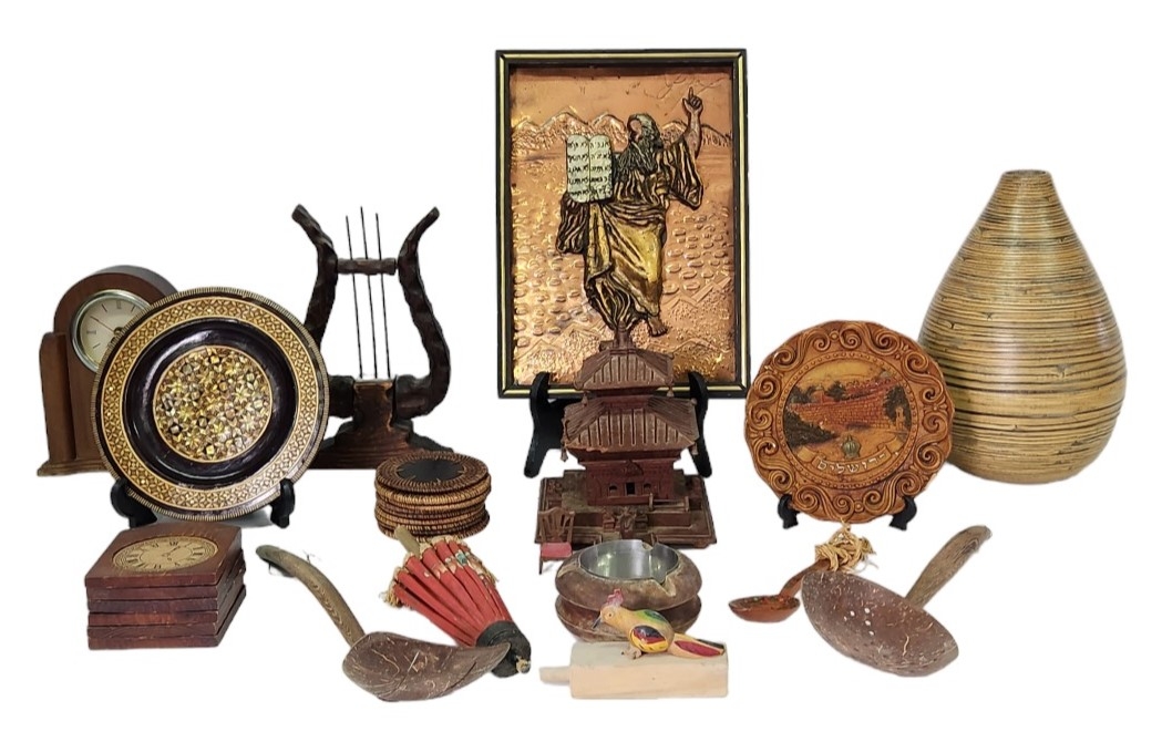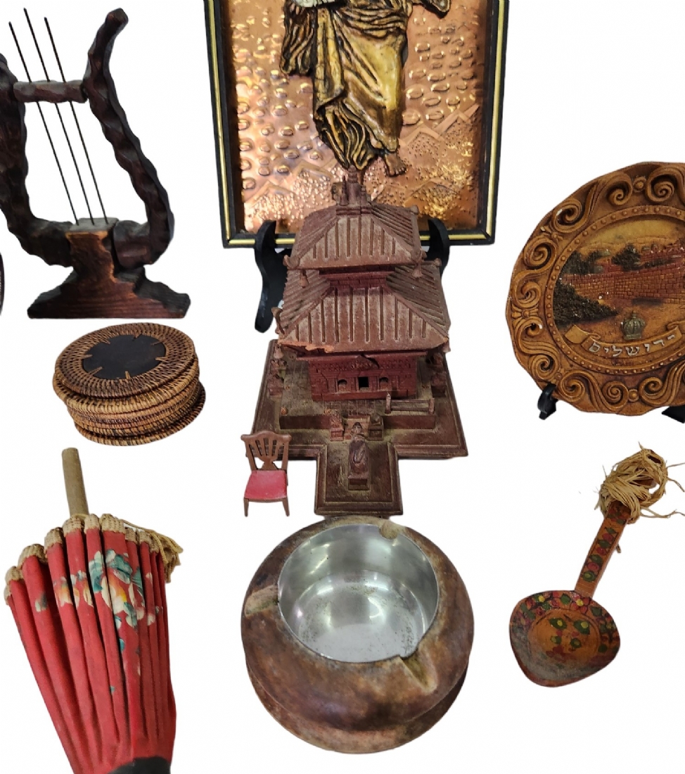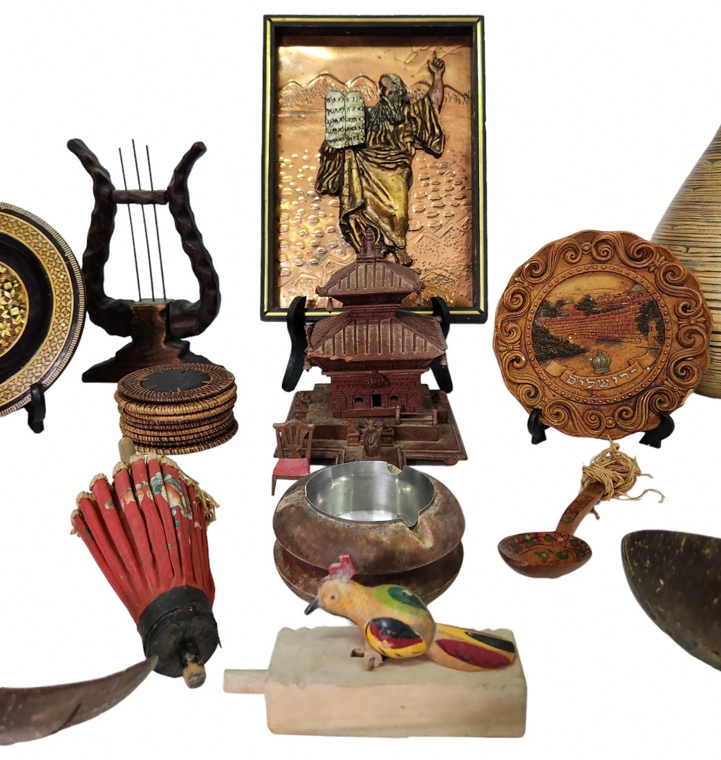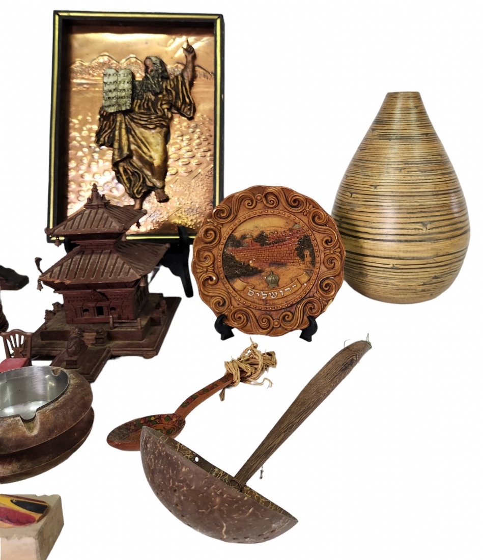לוט של 29 פריטי עץ ישנים שונים, עשויים עץ, מתכת, בד וחומר יצוק, גובה הכד הגדול: 30 ס"מ, קוטר התחתיות העגולות: 10 ס"מ, גובה השמשיה: 26 ס"מ.