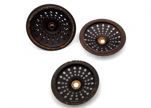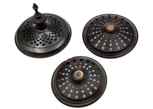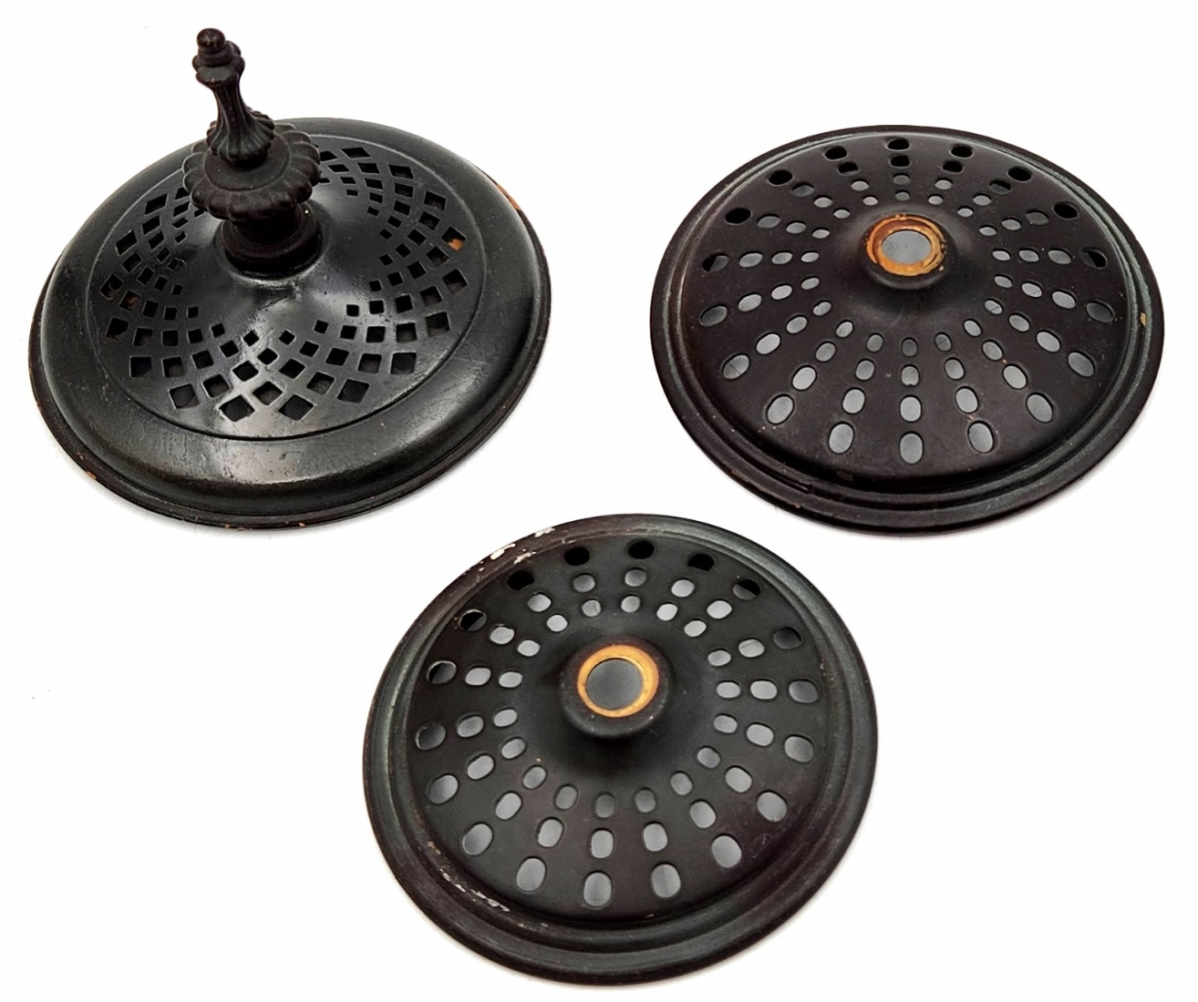 לוט של 3 כיסויי אהילים לאהילים בסגנון טיפאני (Tiffany) (ראו צילומים מצורפים להמחשה), עשויים פליז מושחם, קוטר בהתאמה מ: 9.5 ס"מ ועד 11 ס"מ.