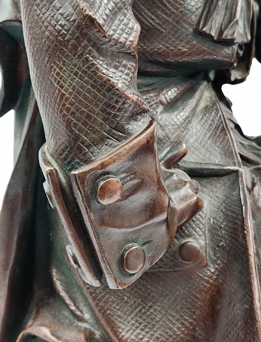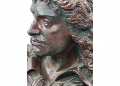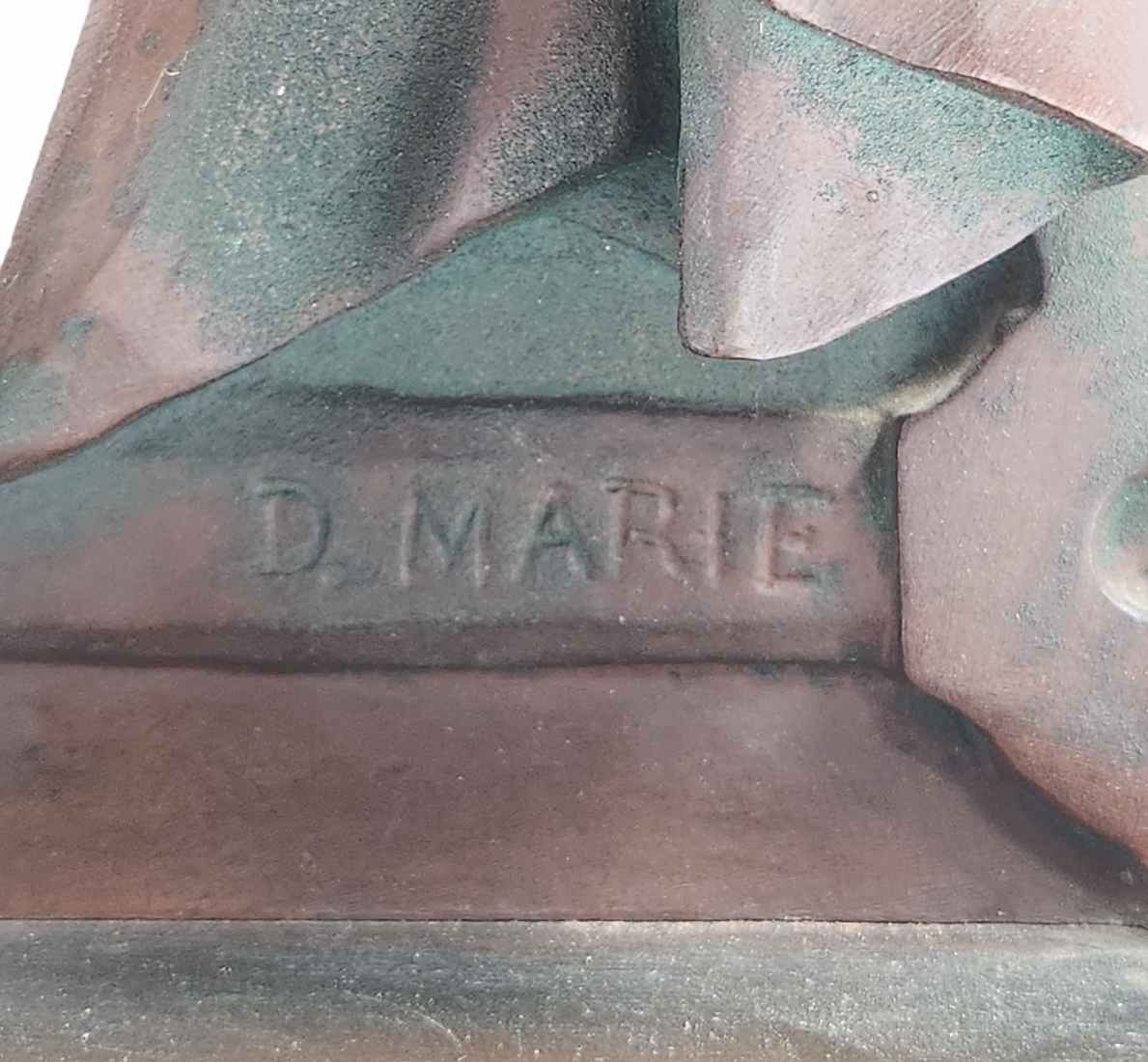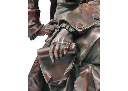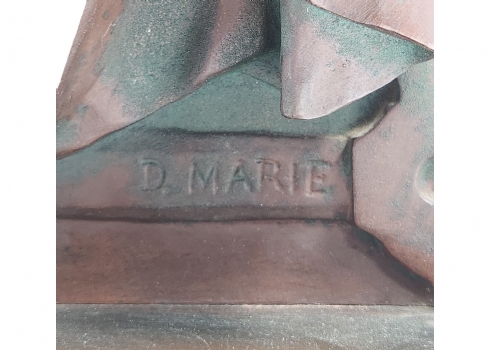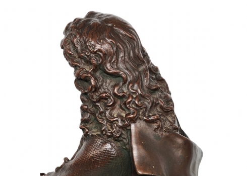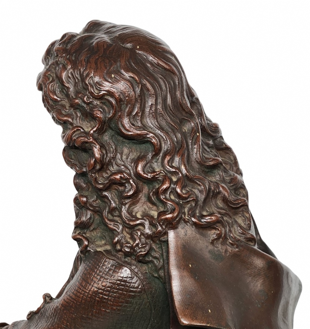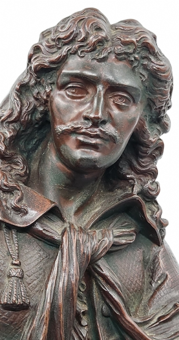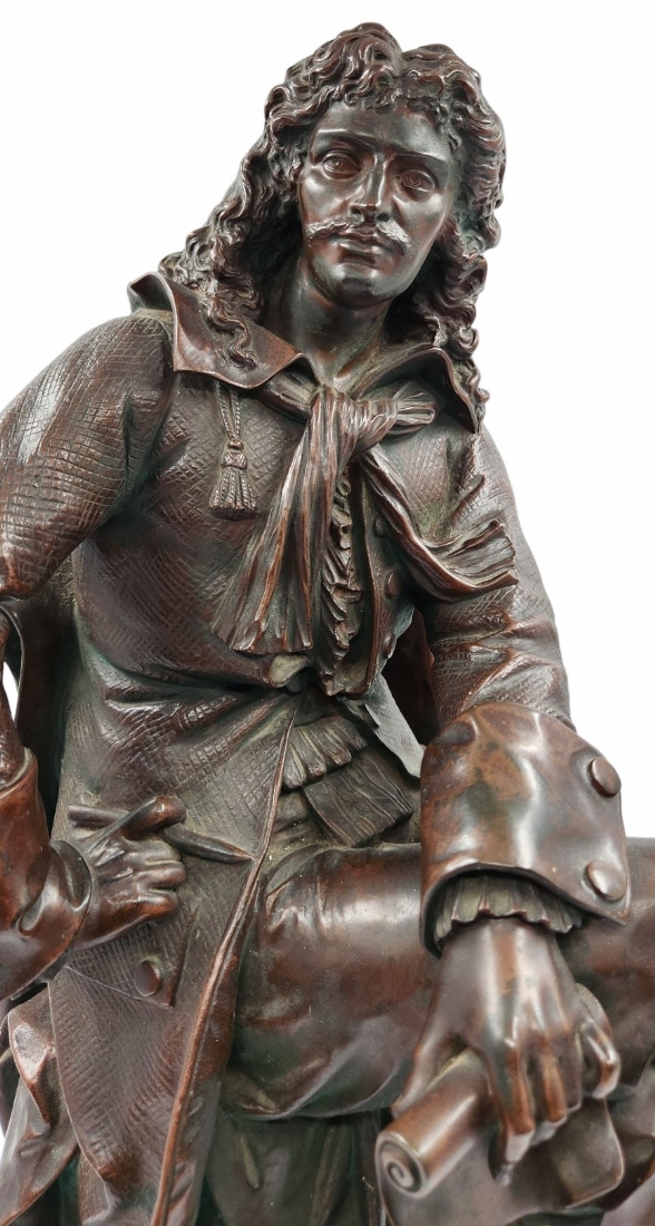 דזירה פייר לואי מארי / Desire Pierre Louis Marie (פסלת צרפתיה, 1761–1863) - פסל ברונזה עתיק גדול איכותי ומרשים במיוחד בדמותו של ז'אן-בטיסט פוקלן, הידוע כמולייר (Moliere - שהיה מגדולי המחזאים של צרפת, במאי ושחקן), פאטינה חומה, חתום: 'D. Marie', המאה ה-19, רוחב החזית: 28 ס"מ, עומק מהחזית לגב הפסל: 37 ס"מ, גובה: 56 ס"מ. (* מפאת משקלו הרב לא ניתן לשלוח פסל זה באמצעות שליח - איסוף עצמי ממשרדנו ברחוב המצודה בעיר אזור)