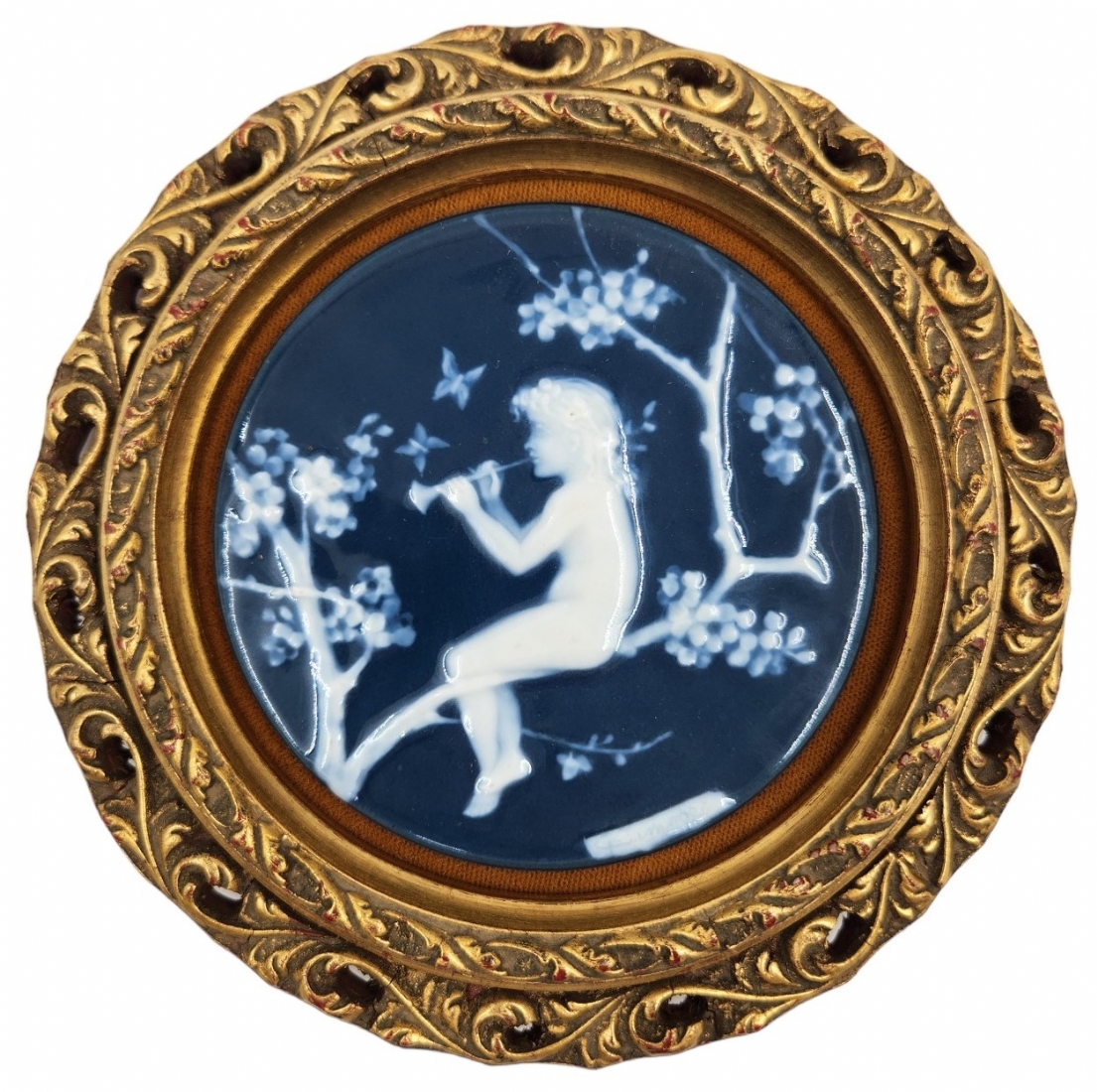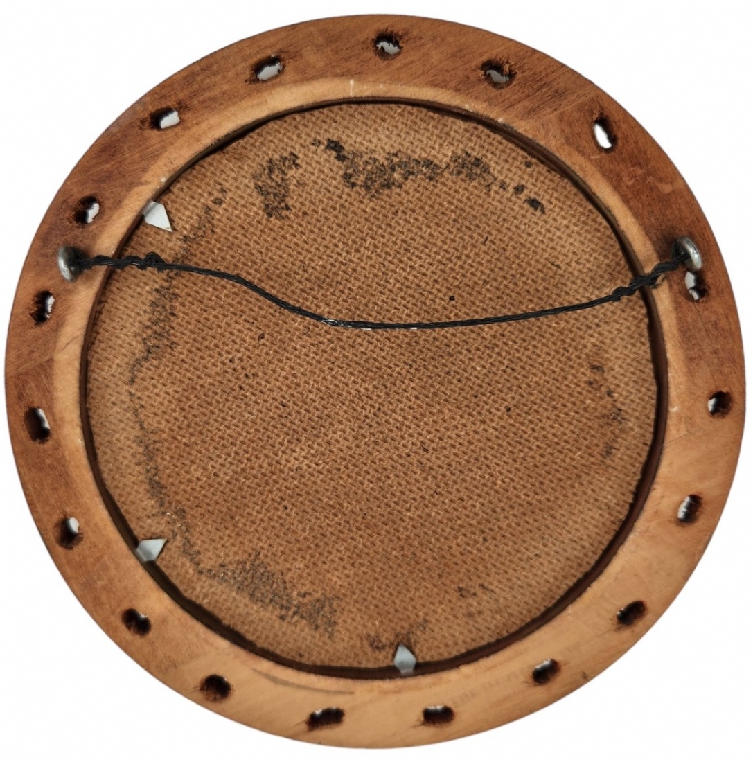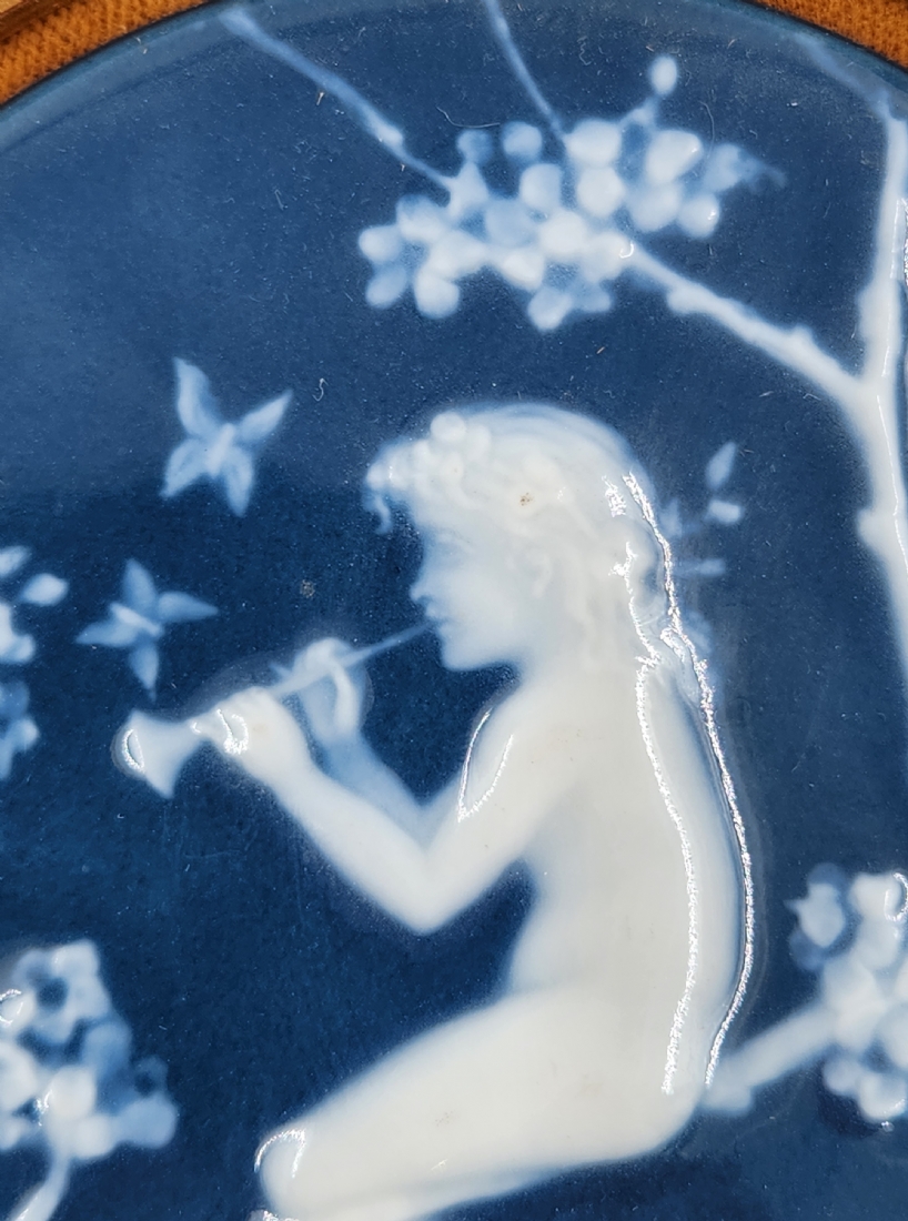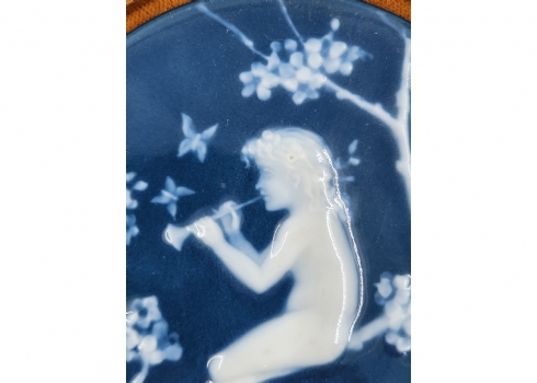 מדליון פורצלן צרפתי מתוצרת: 'Camille Tharaud Limoges' (יצר בין השנים: 1878-1956), חתום בחזית במונוגרם ובמילה לימוג', מעוטר בטכניקת הפט סור פט (Pate Sur Pateׂ), קוטר המדליון עצמו: 10.5 ס"מ, 17 ס"מ.