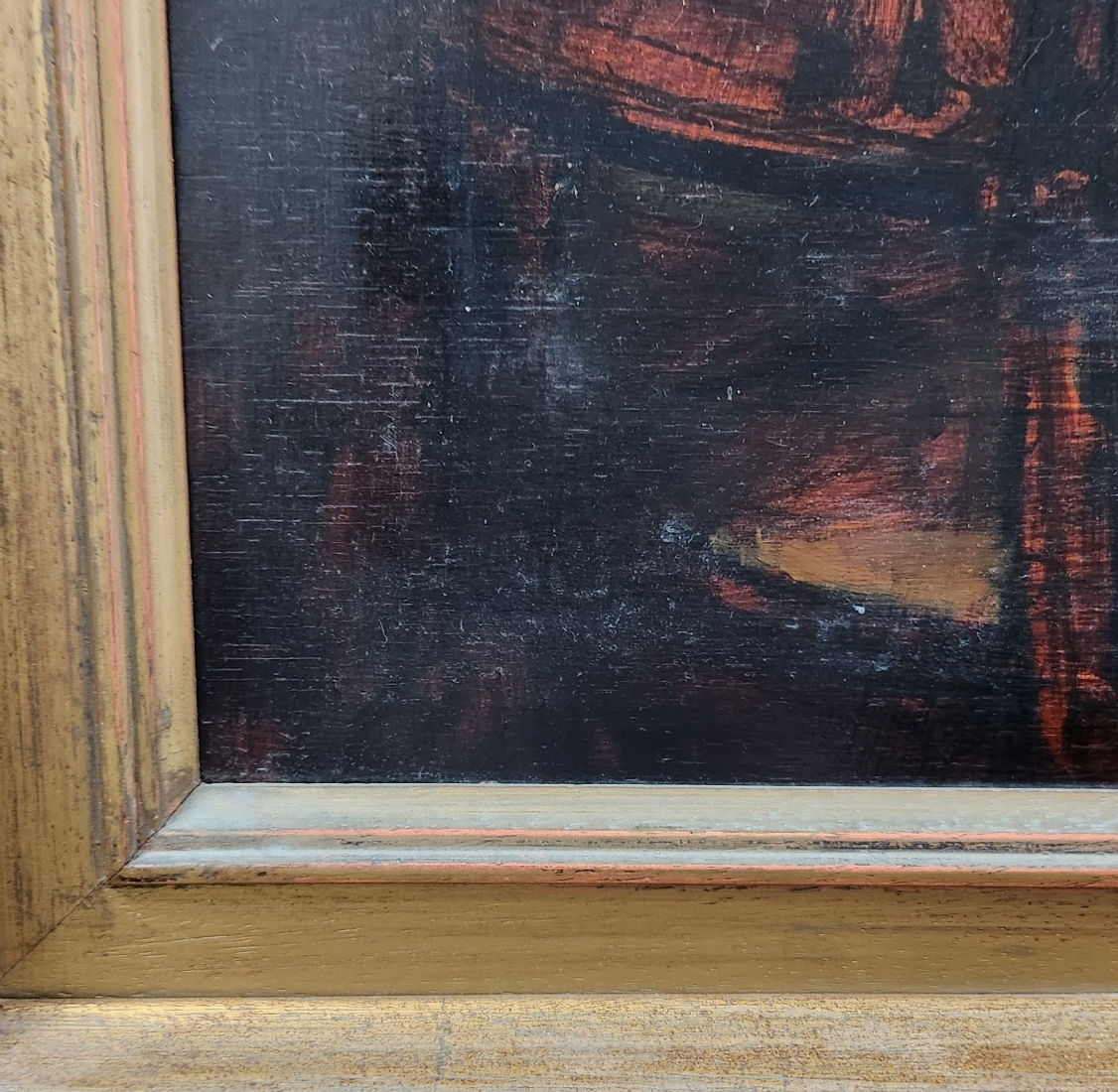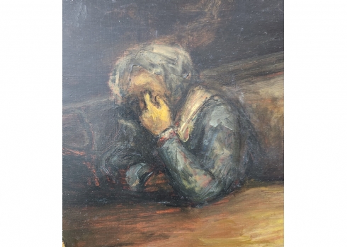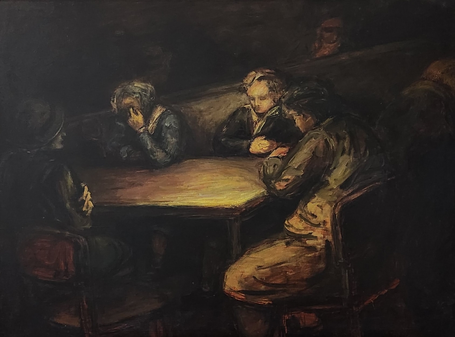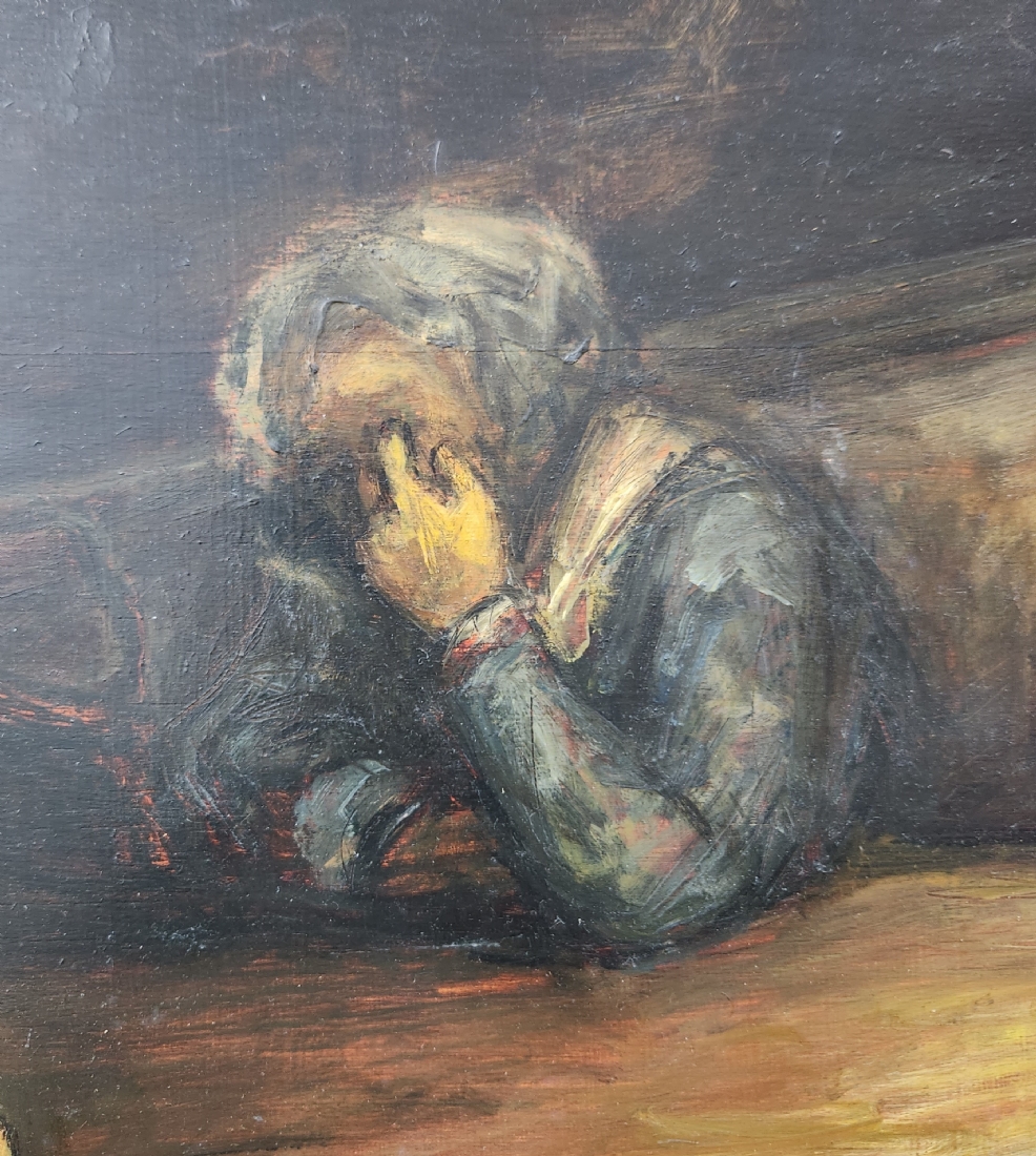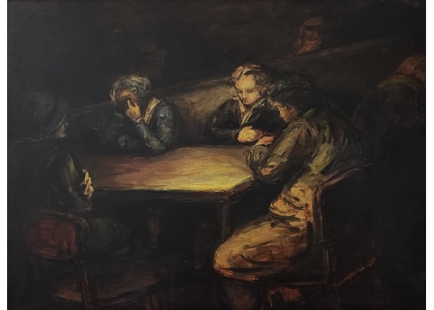 'ארבעה גברים סביב שולחן' - ציור גדול שמן על לוח, לא נמצאה חתימה