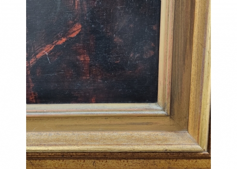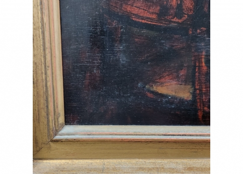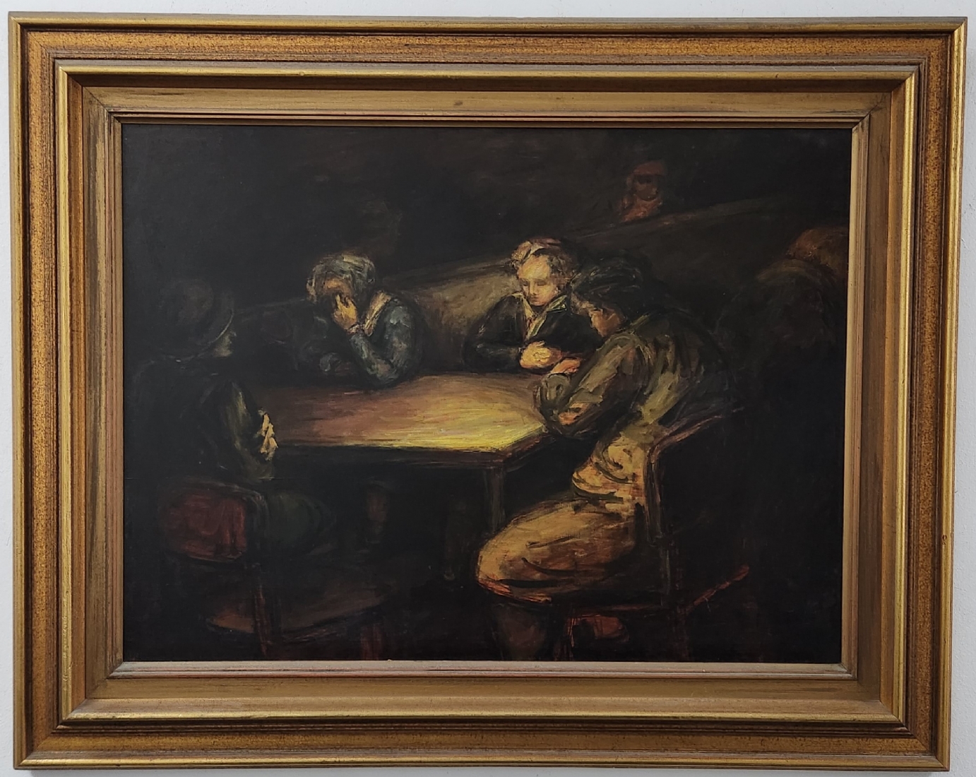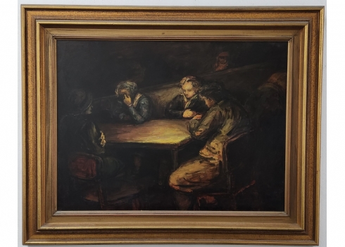 'ארבעה גברים סביב שולחן' - ציור גדול שמן על לוח, לא נמצאה חתימה, מידות: 60X80 ס"מ, מידות המסגרת: 82X105 ס"מ.