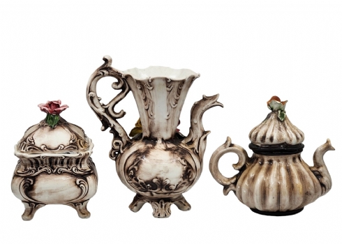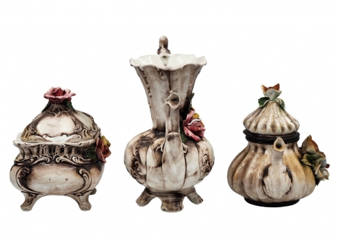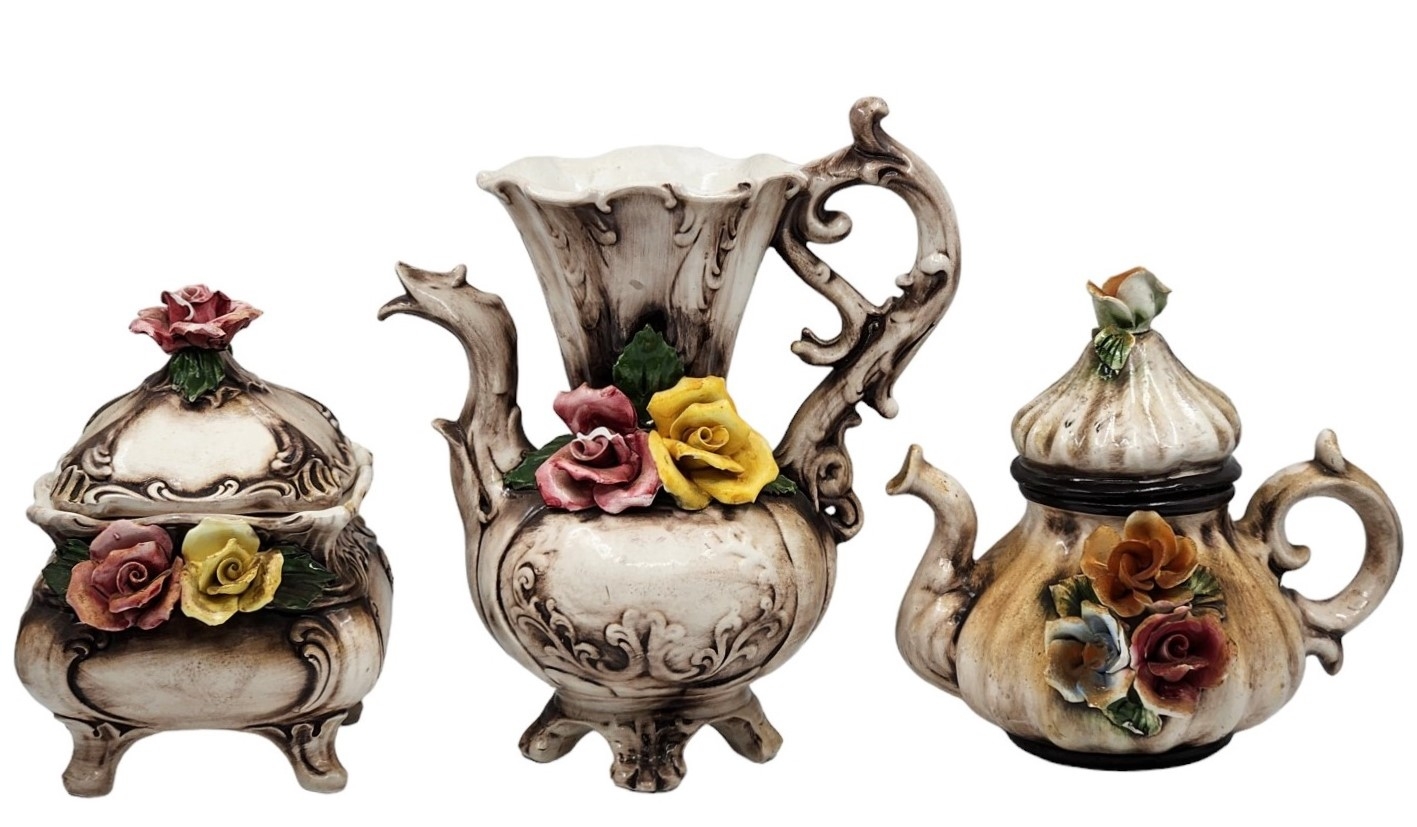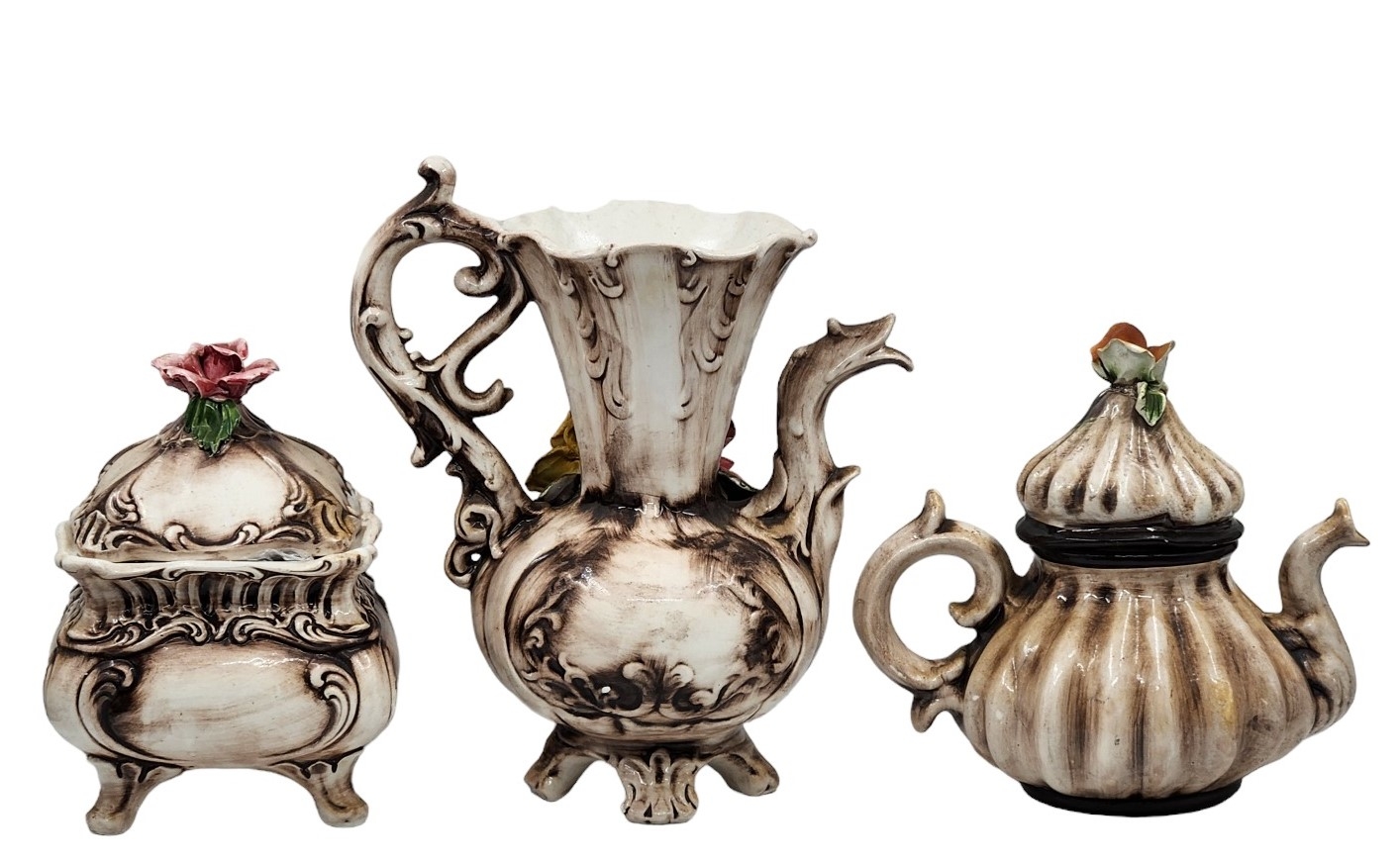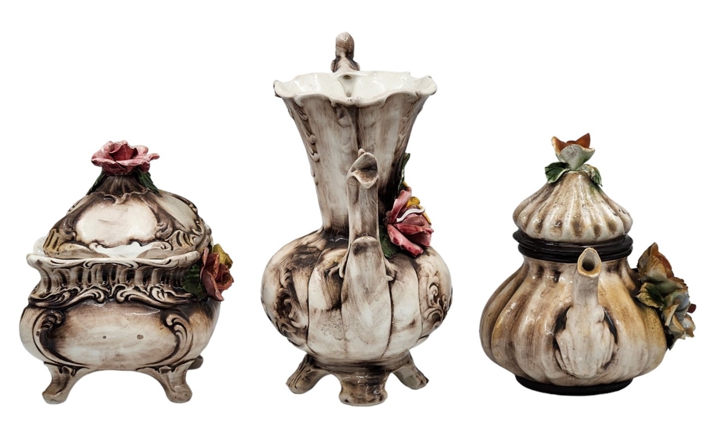 לוט של 3 כלי חרס איטלקיים ישנים, תוצרת 'קאפו דימונטה' (Capodimonte), מעוטרים בפרחים מפוסלים צבועים ביד, לא חתומים (פגמים קלים לעלי הכותרת ולאחד המכסים- מצולמים), רוחב הקומקום כולל הזרבובית: 24 ס"מ, גובה הקנקן: 33 ס"מ.