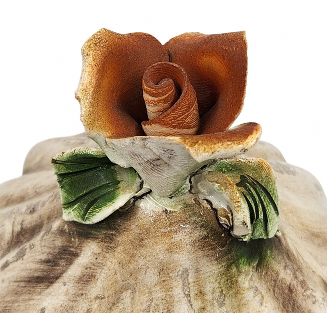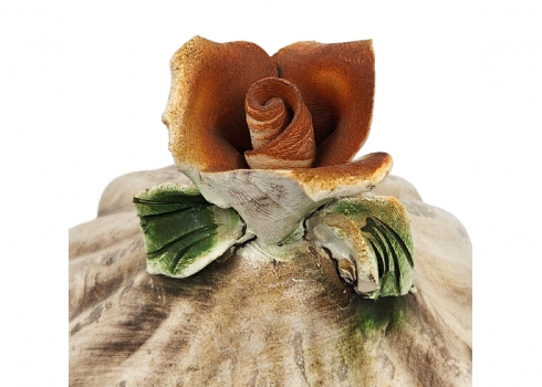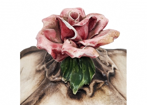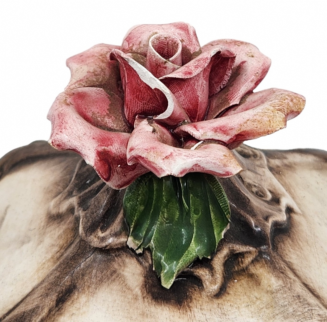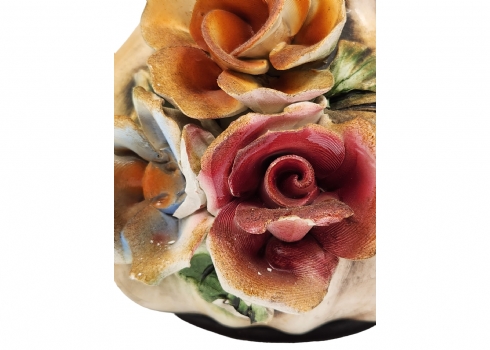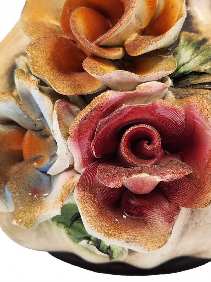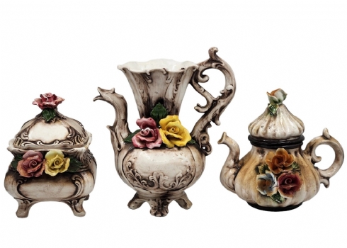 לוט של 3 כלי חרס איטלקיים ישנים, תוצרת 'קאפו דימונטה' (Capodimonte), מעוטרים בפרחים מפוסלים צבועים ביד, לא חתומים (פגמים קלים לעלי הכותרת ולאחד המכסים- מצולמים), רוחב הקומקום כולל הזרבובית: 24 ס"מ, גובה הקנקן: 33 ס"מ.