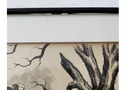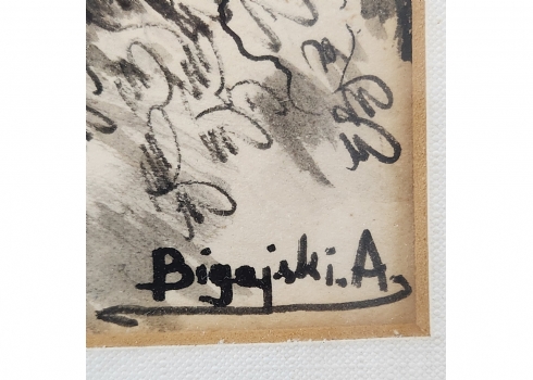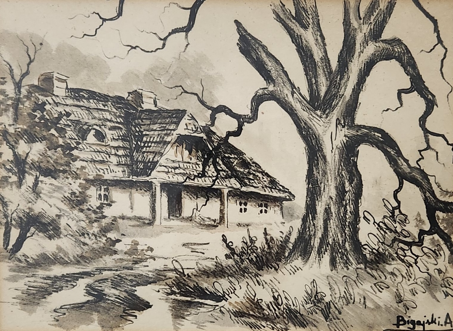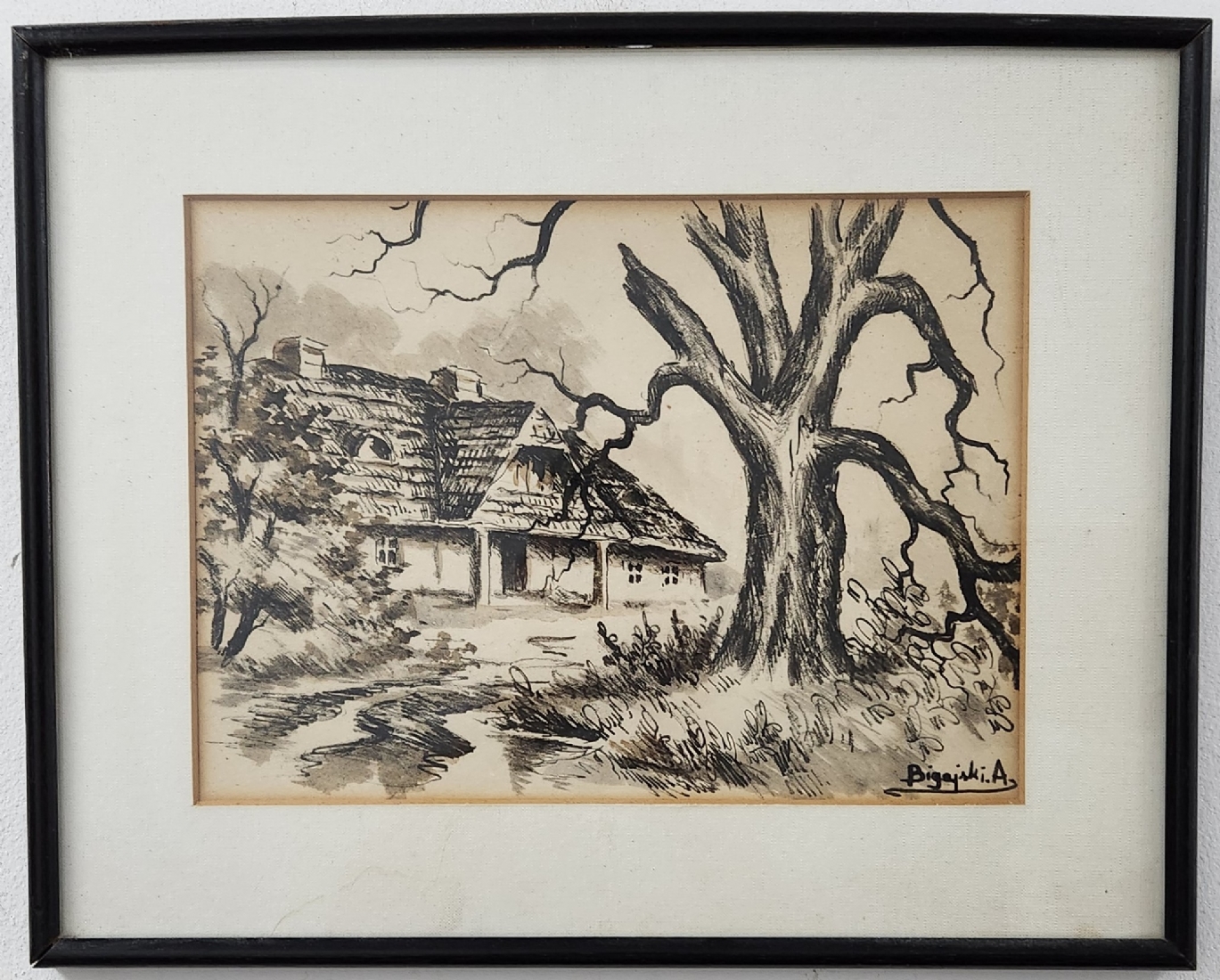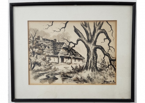 'הבית של האלמנה בלנקה שמפלינסקה' - ציור פולני ישן, רישום ואקוורל על נייר, חתום, מידות: 23X32 ס"מ, מידות המסגרת: