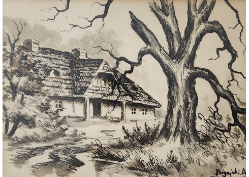 'הבית של האלמנה בלנקה שמפלינסקה' - ציור פולני ישן, רישום ואקוורל על נייר, חתום