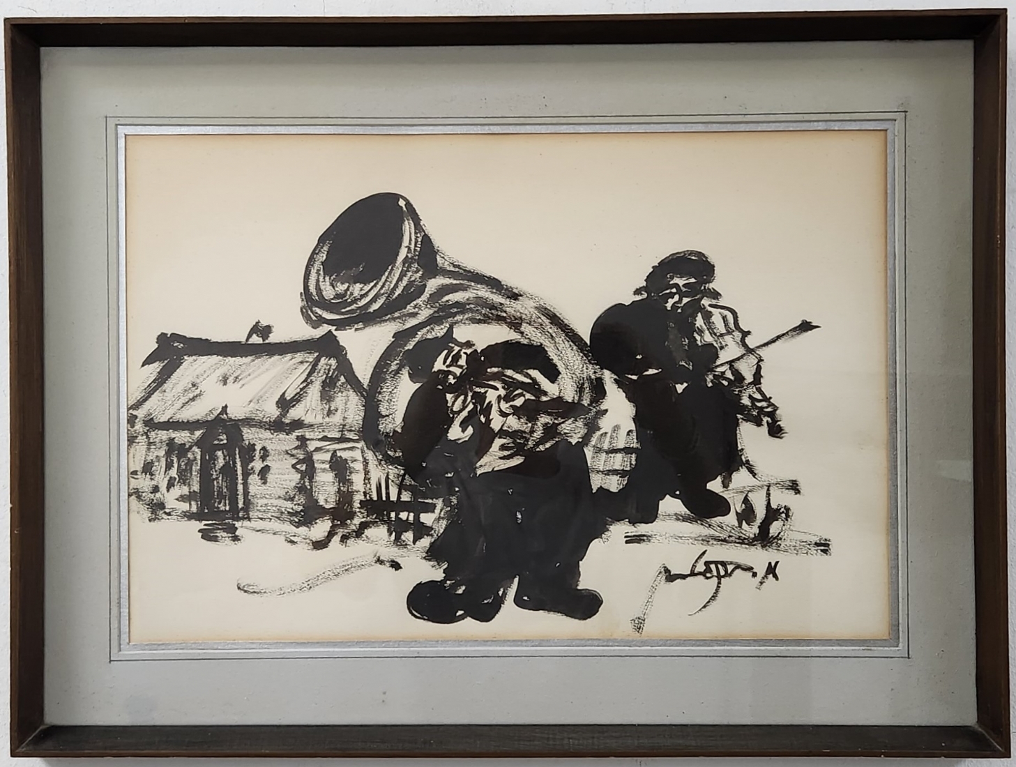 משה ברנשטיין (Moshe Bernstein) - 'כלייזמר תוקע בקרן יער' - גואש שחור על נייר, חתום, מידות: 35X50 ס"מ, מידות המסגרת: 47X63 ס"מ.