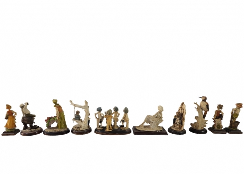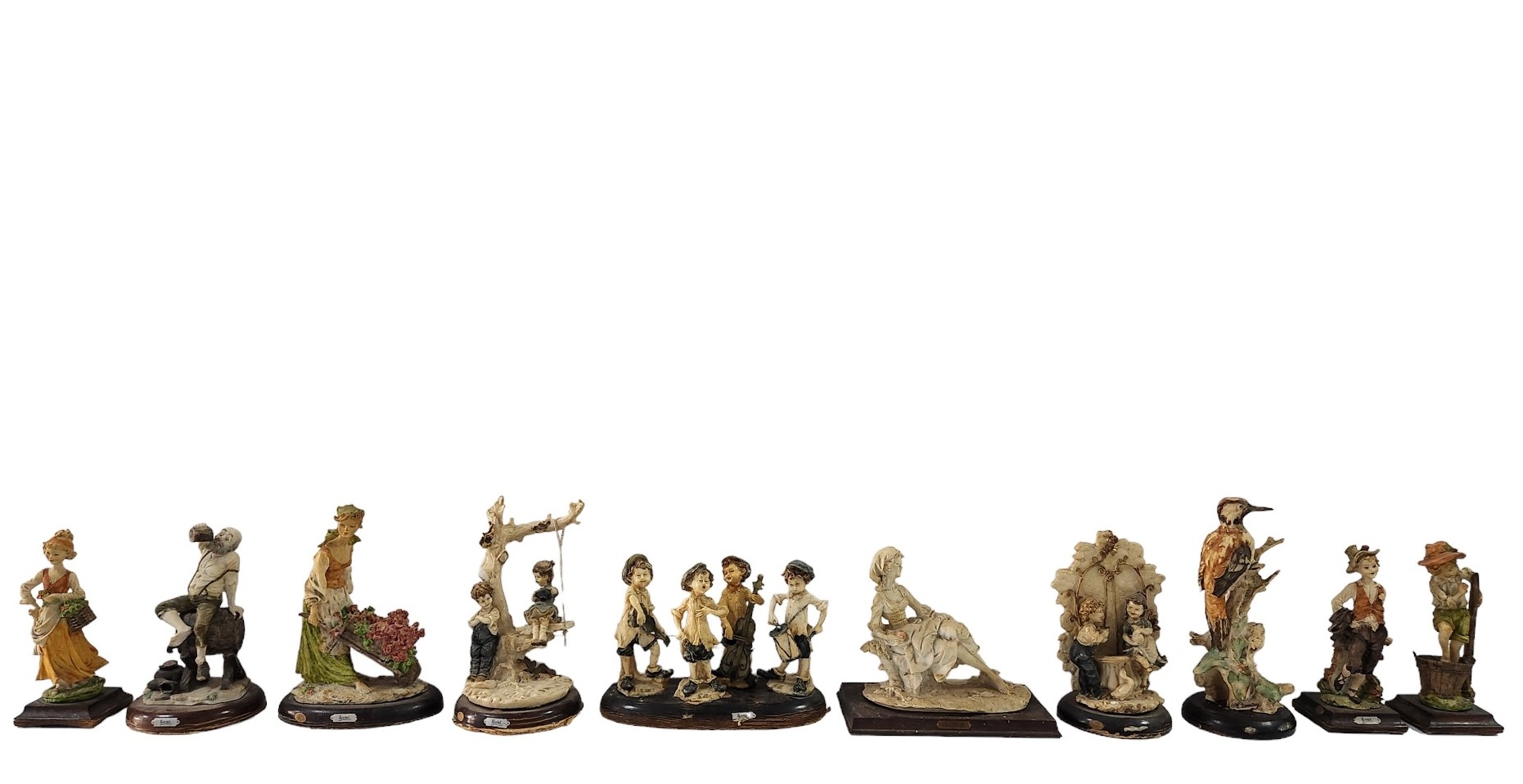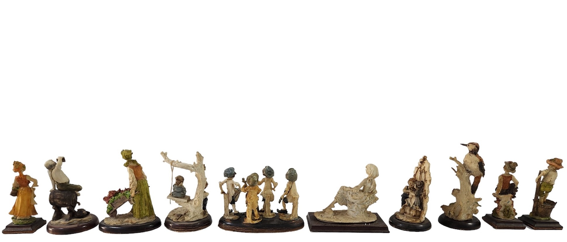 לוט של 10 פסלונים ישנים ושונים, בדמויות מאפיזודות שונות, עשויי חומר יצוק ומעוטרים בצביעת יד, כולל מעמדי עץ תואמים, מצב בהתאם לגיל (מספר חוסרים ותיקונים לדמויות ולבסיסיהן) רובם חתומים, גובה בהתאמה: 27 - 17 ס"מ, רוחב בהתאמה: 28 - 9 ס"מ.