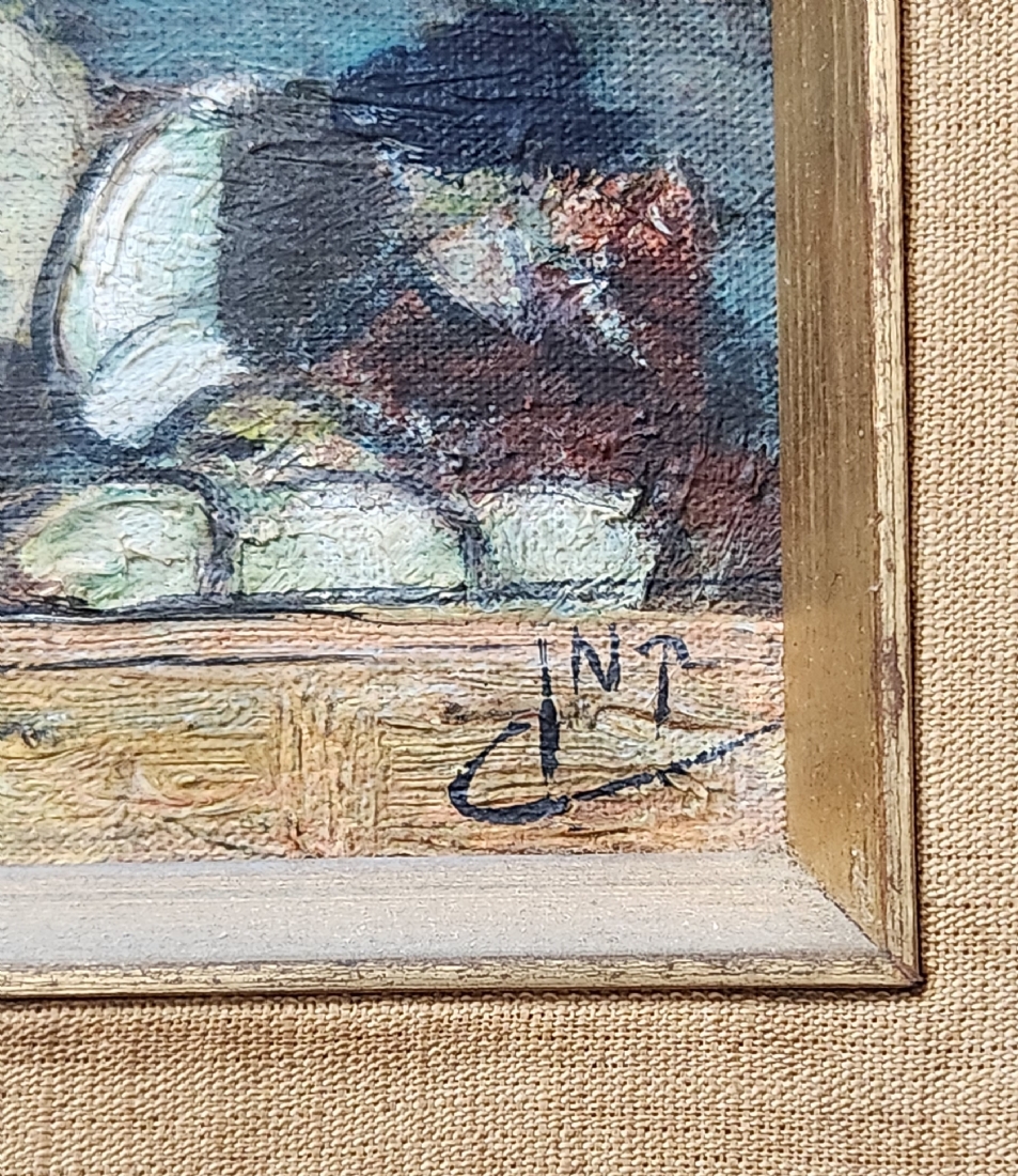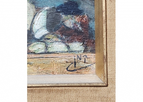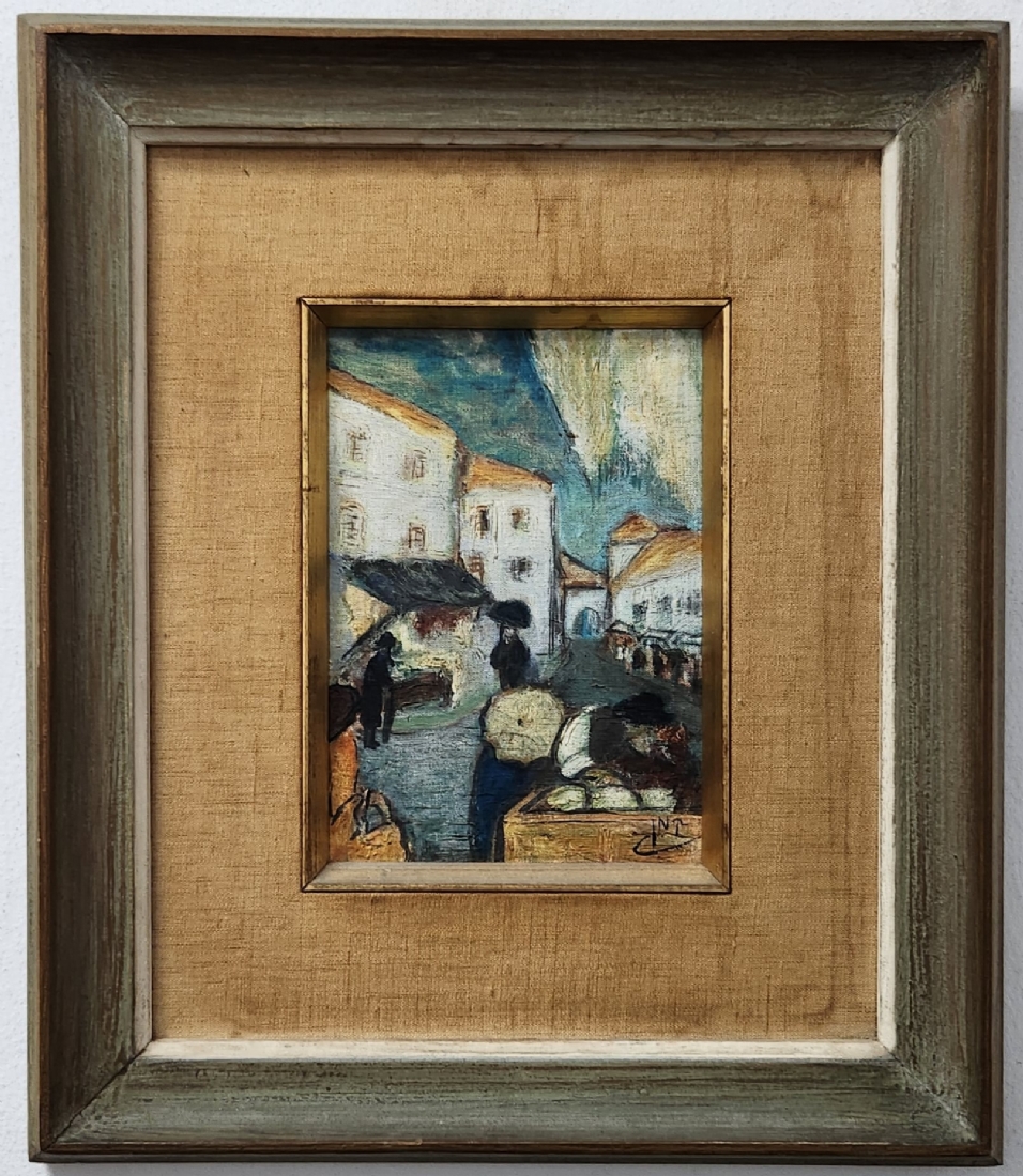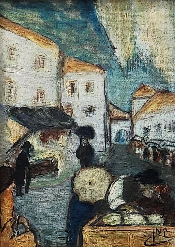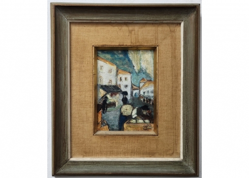 'יהודי ליד דוכן דגים מלוחים' - ציור ישן, שמן על לוח, חתום: קמן (נשמח לעזרה בזיהוי האמן), מידות: 21X16 ס"מ, מידות המסגרת: 40X34 ס"מ.