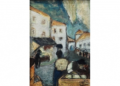 'יהודי ליד דוכן דגים מלוחים' - ציור ישן, שמן על לוח, חתום: קמן