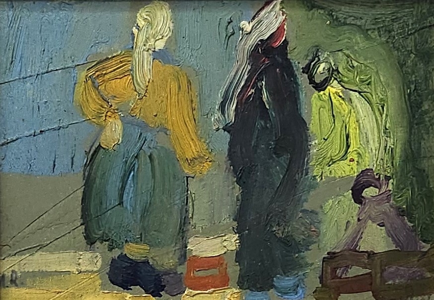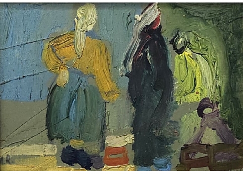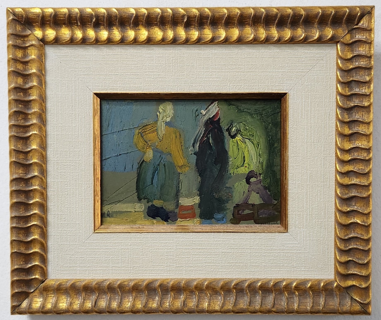משה רוזנטליס (Moshe Rosenthalis) - 'נשים בדואיות' - שמן על לוח, חתום בראשי תיבות, מידות: 12X16 ס"מ, מידות המסגרת: 26X31 ס"מ.