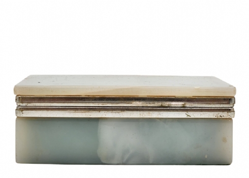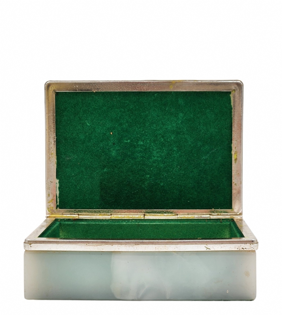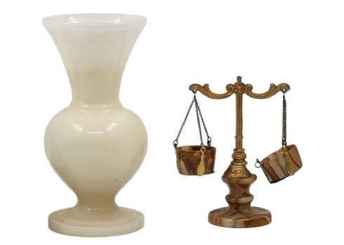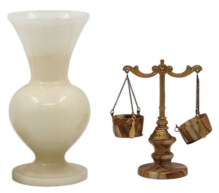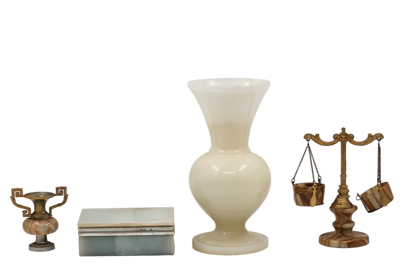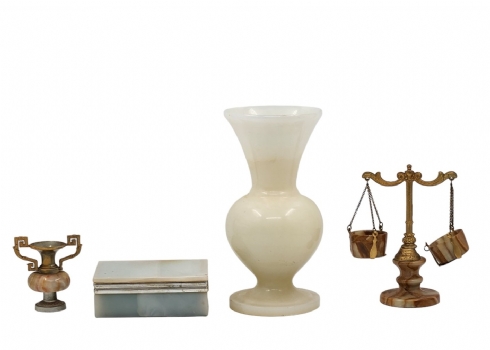 לוט של 4 חפצים שולחנים ישנים שונים, עשויים אוניקס מצרי, גובה הכד הגדול: 23.5 ס"מ, רוחב הקופסה: 13.5 ס"מ.