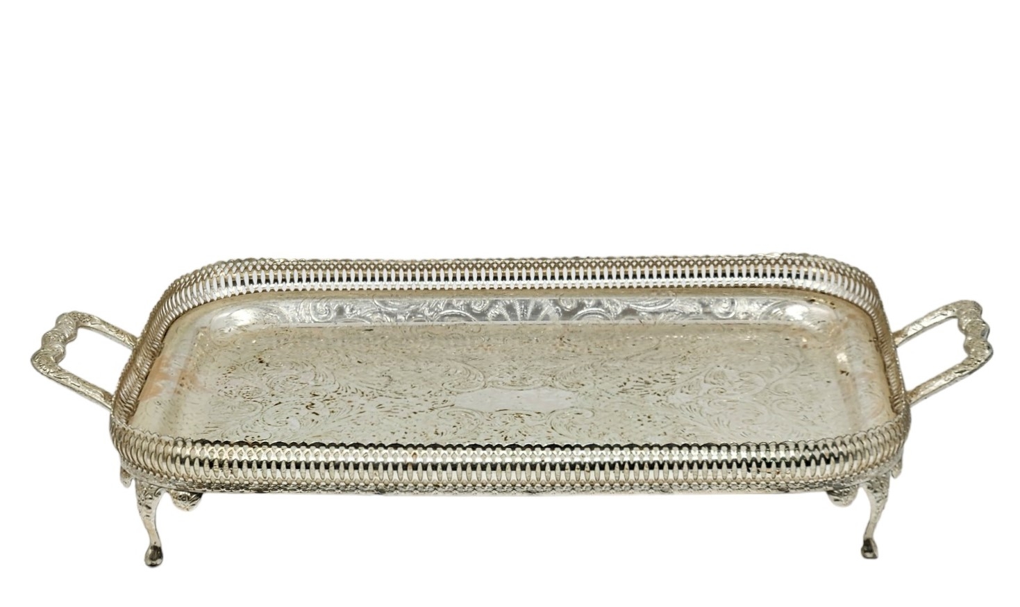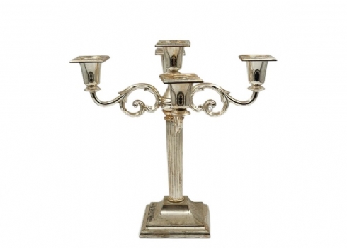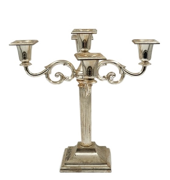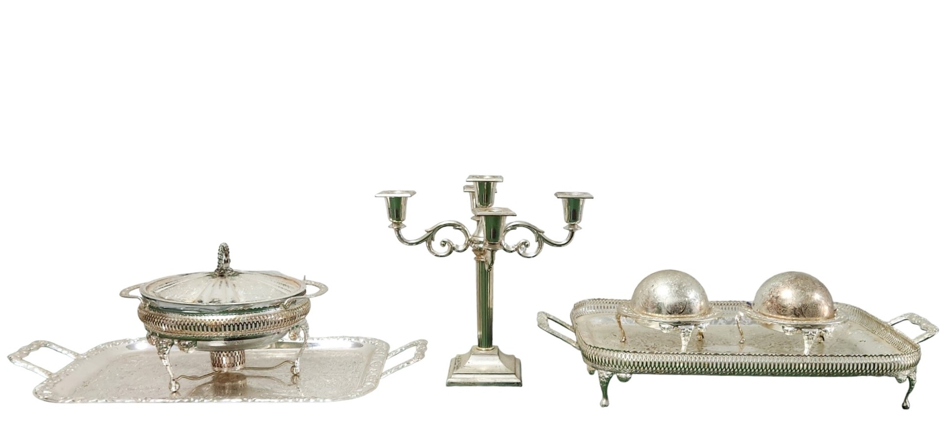 לוט של 6 חפצי מתכת ישנים שונים, מצופים כסף, גובה הקנדלברה: 16 ס"מ, אורך המגש כולל ידיות: 52 ס"מ.