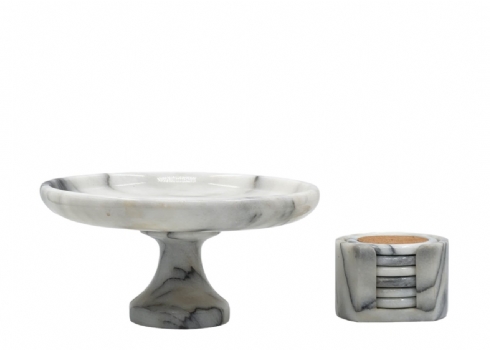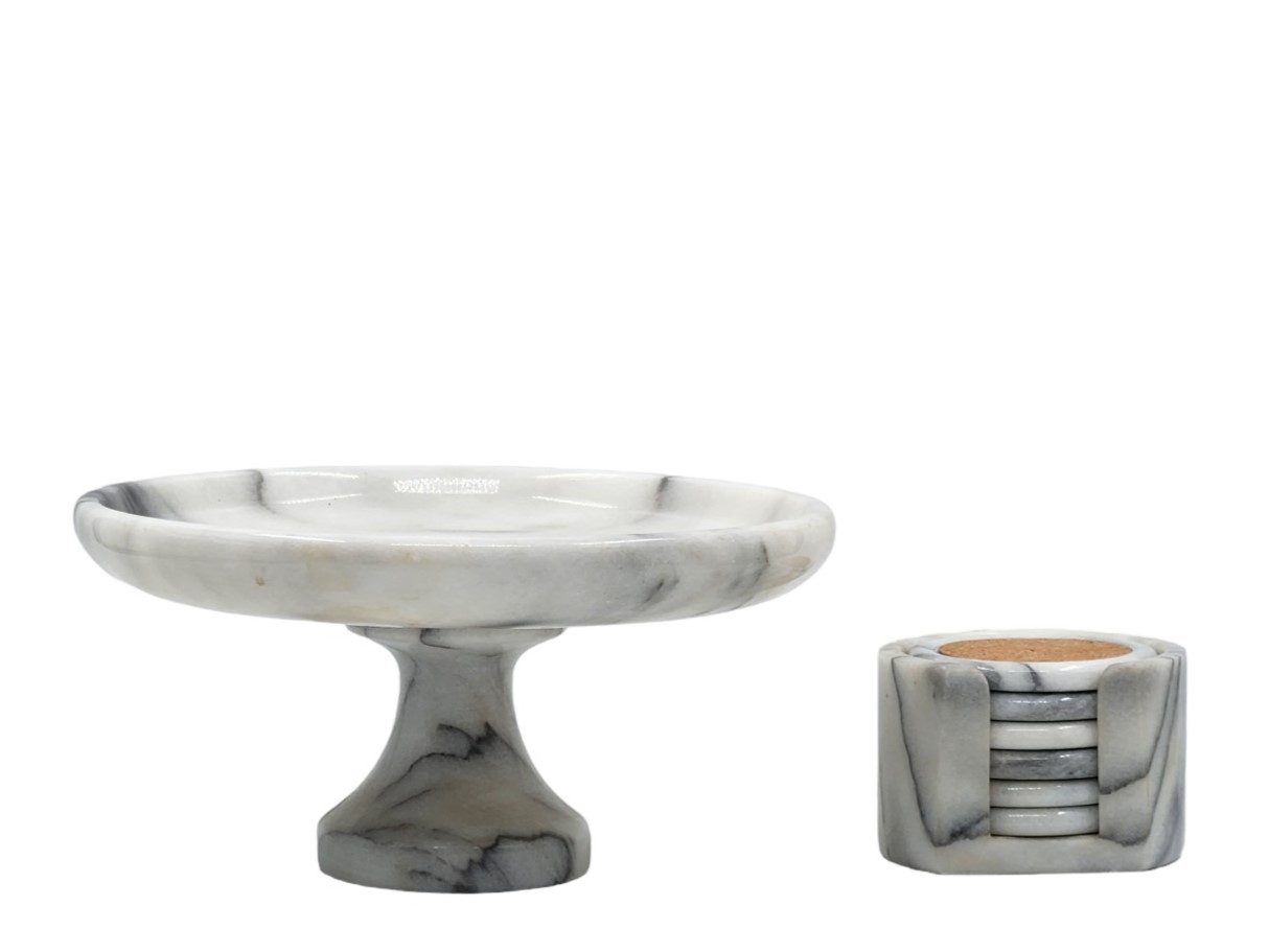 לוט של 2 כלים להגשה וכיבוד, משיש, גובה הטזה: 13 ס"מ, קוטר הטזה: 26 ס"מ, קוטר תחתית: 9 ס"מ.