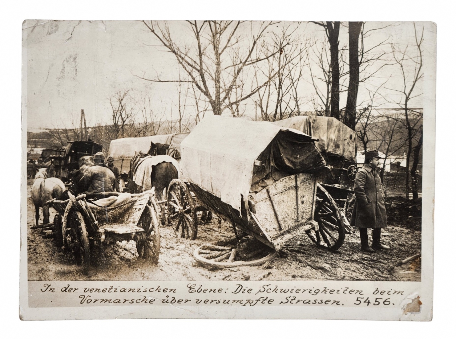 "איך יוצאים מהבוץ הזה?" – צילום ממלחמת העולם הראשונה, בחזיתו תיאור בגרמנית: "במישור הוונציאני: קשיי ההתקדמות בדרכים הבוציות", מאחור: חותמת משרד הצילום של בית הדפוס המלחמתי של קיסרות אוסטרו-הונגריה, מידות: 13x18 ס"מ.