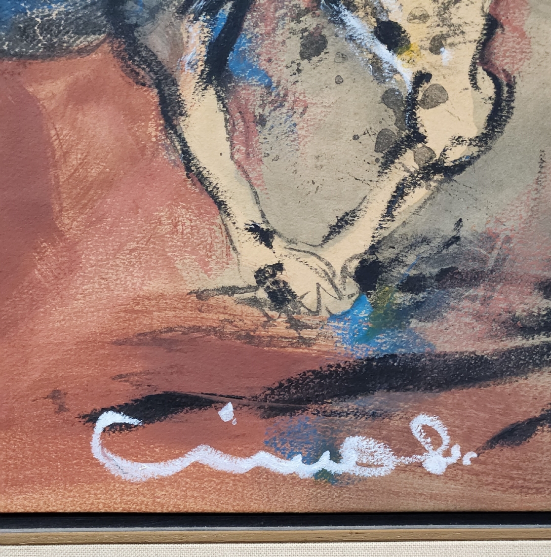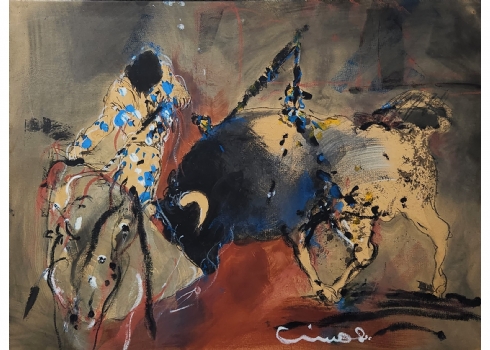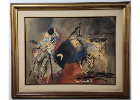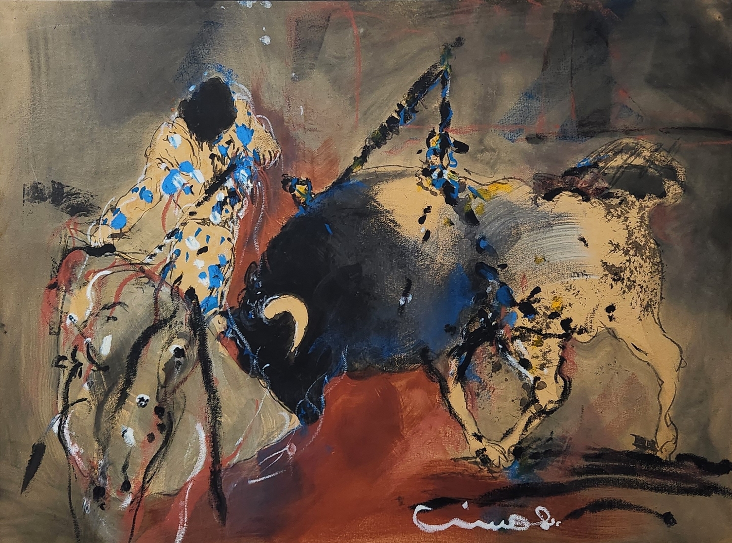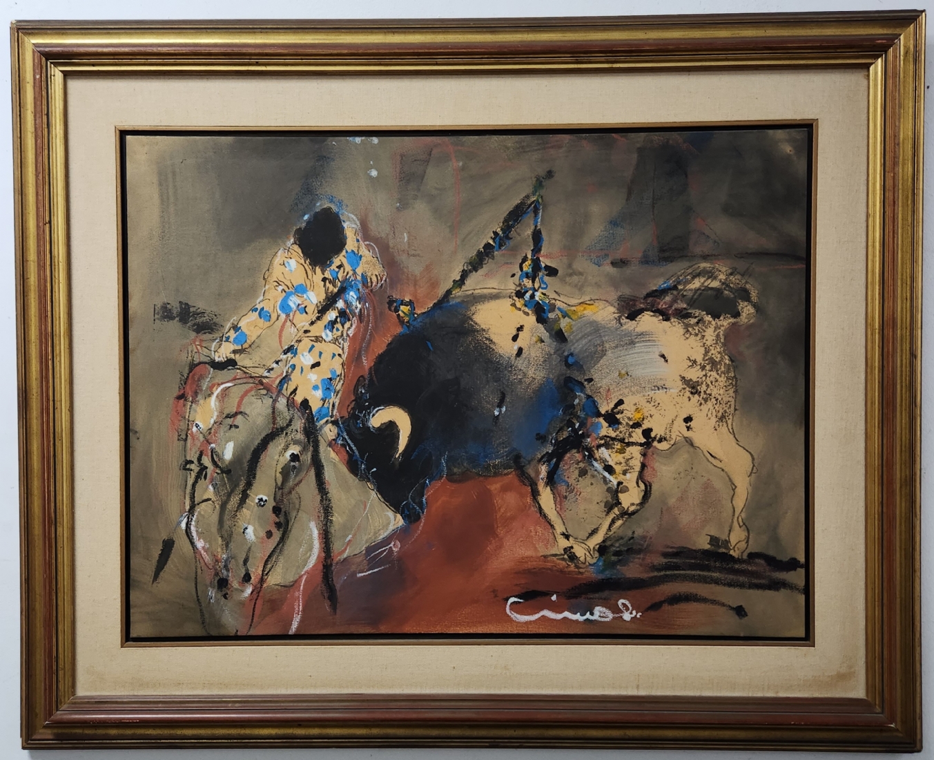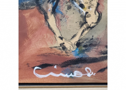 אורי ליפשיץ (Uri Lifschitz) - 'מטדור', צביעת יד על נייר מודפס מוצמד לבד, חתום (פגמים למסגרת - מצולם), מידות: 56.5X76 ס"מ, מידות המסגרת: 82X101.5 ס"מ.