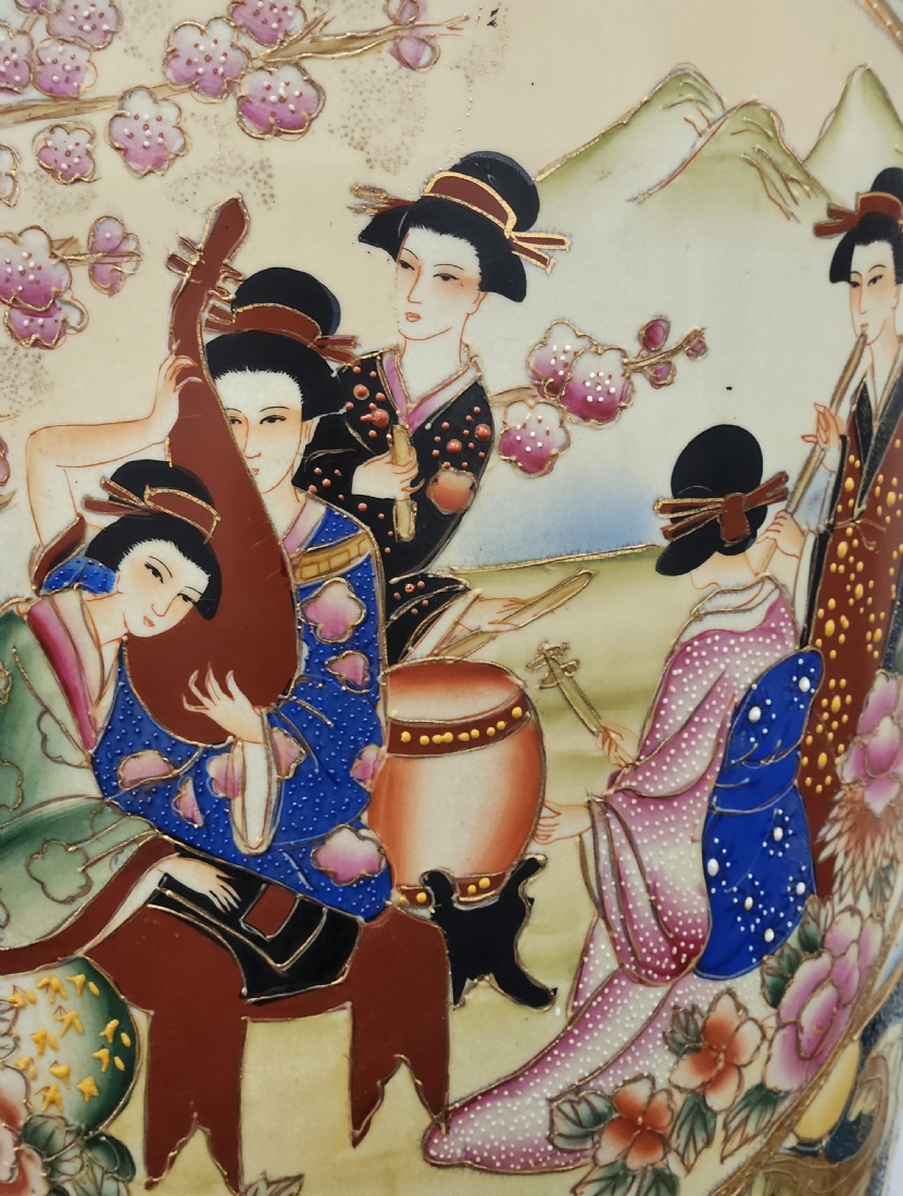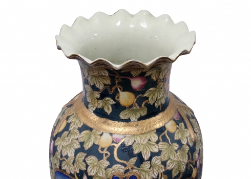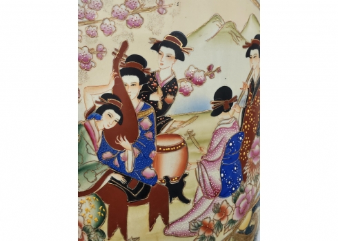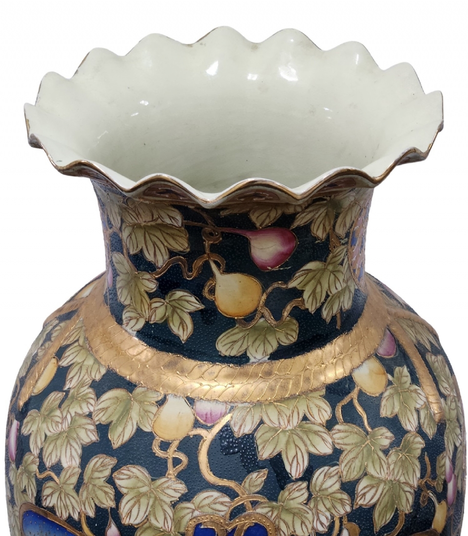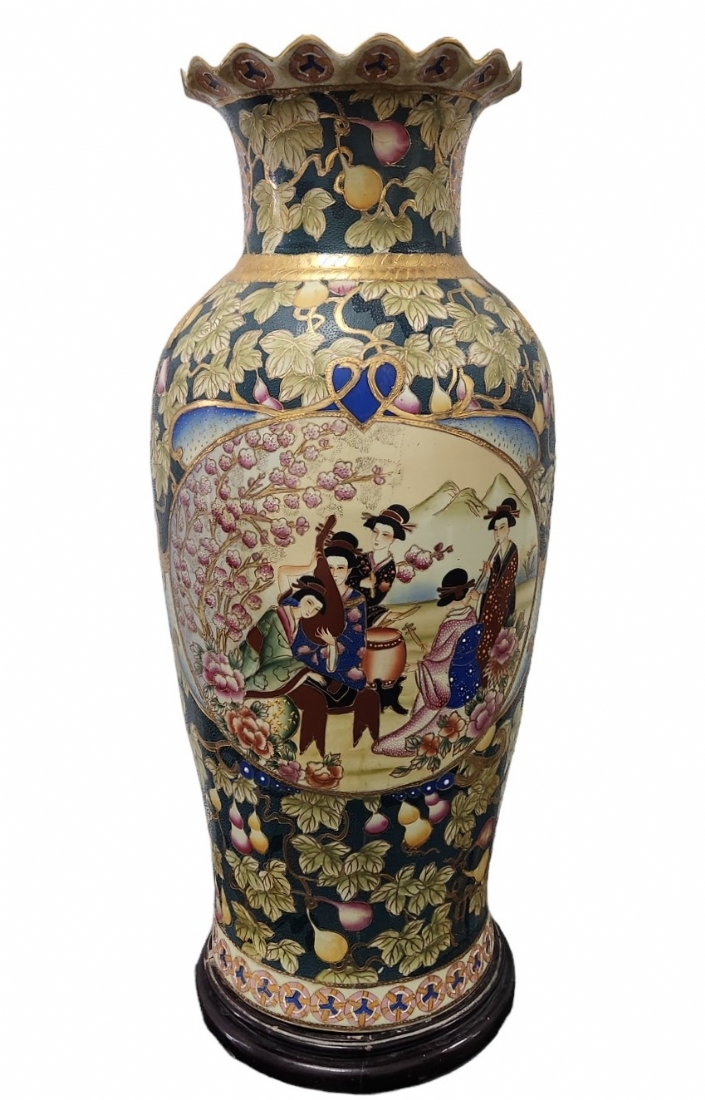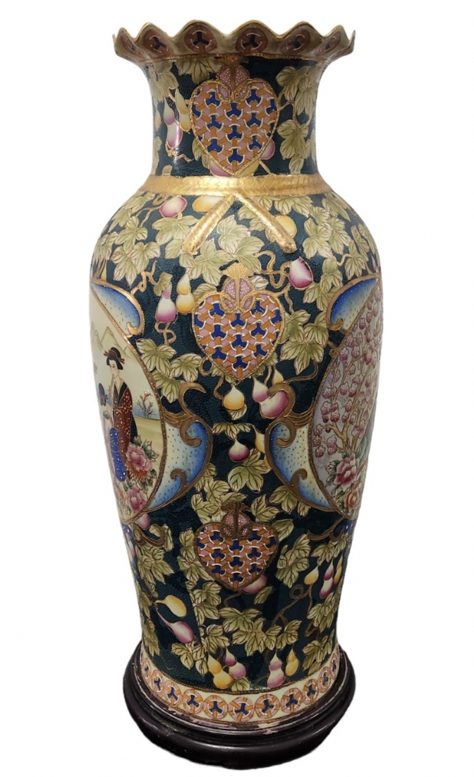 אגרטל סיני גדול מימדים בסגנון 'סטסומה' יפני, עשו חרס מעוטר אמאייל וזהב כולל בסיס עץ, גובה: הכד 92.5 ס"מ, גובה הבסיס: 6.5 ס"מ, גובה כולל: 99 ס"מ, רוחב: 30 ס"מ.