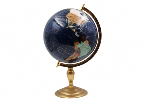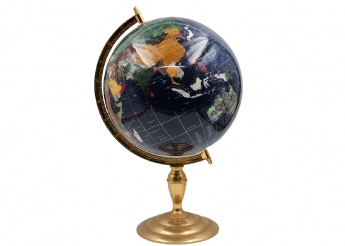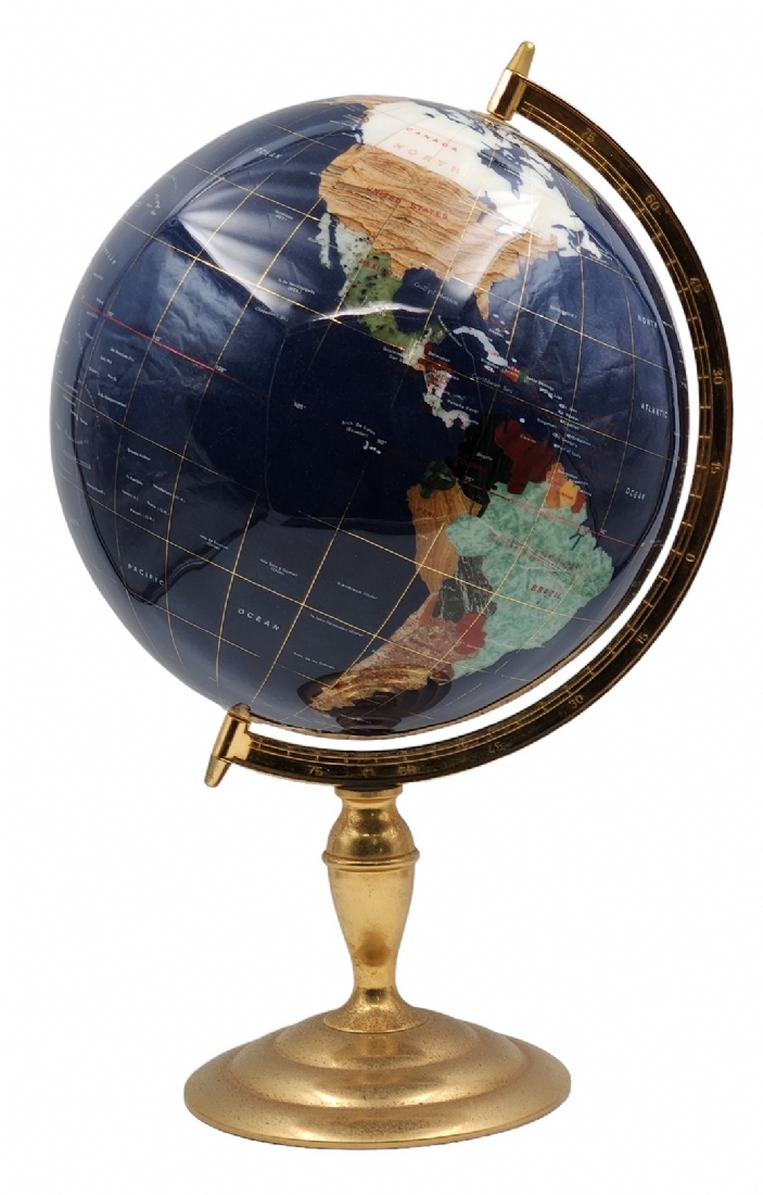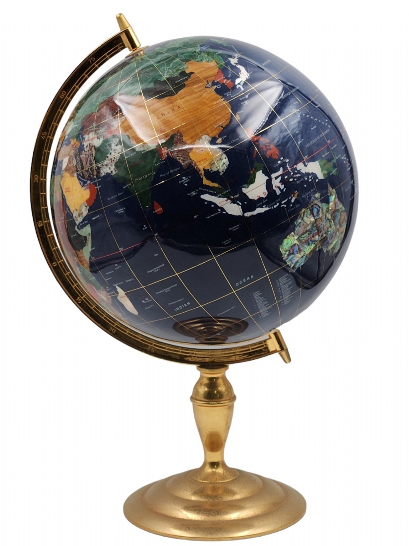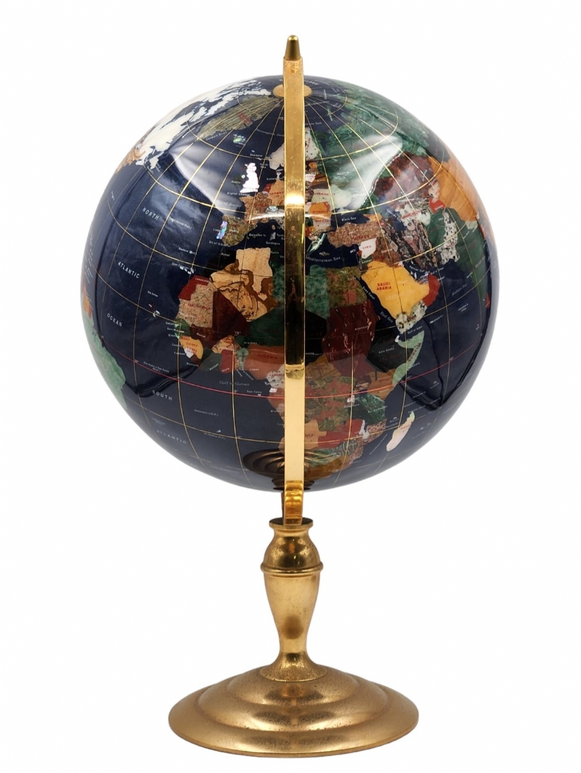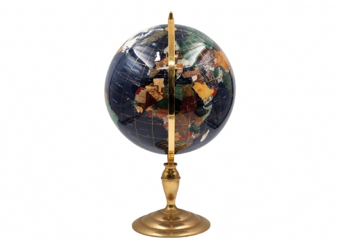 גלובוס שולחני על בסיס מתכת מוזהבת, היבשות והימים מאבני חן שונות (לאפיס כחול, ג'ייד, אגאט, אם הפנינה וכו'), גובה כולל מעמד: 53 ס"מ, רוחב: 28 ס"מ