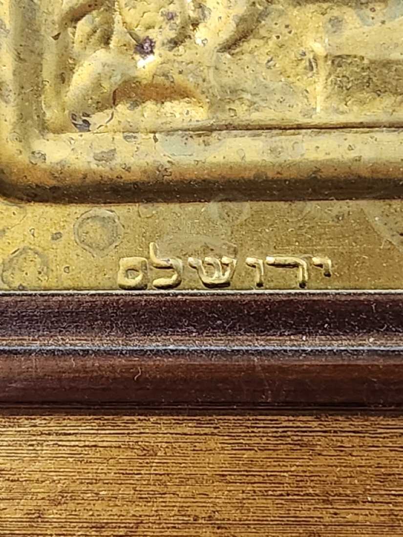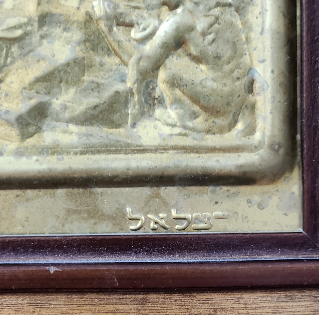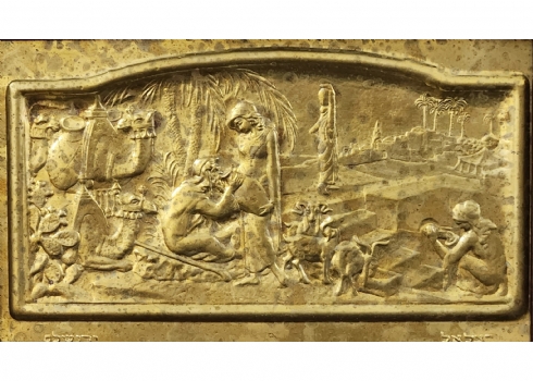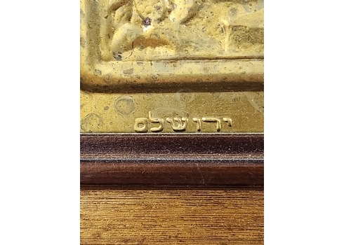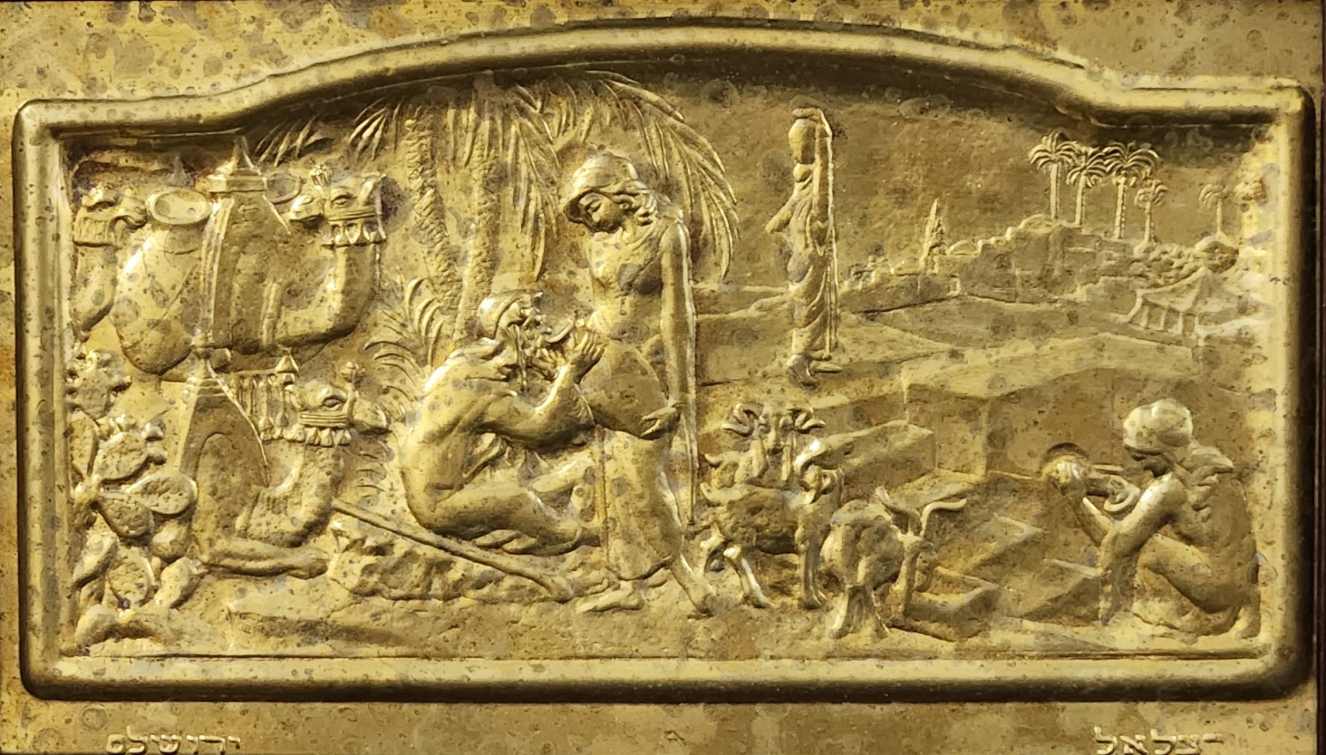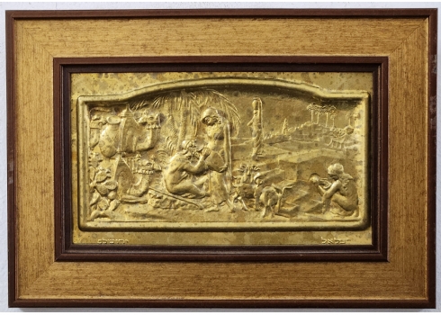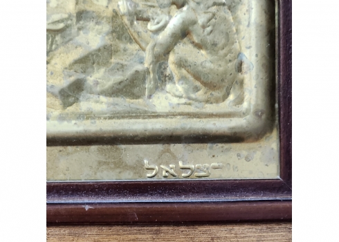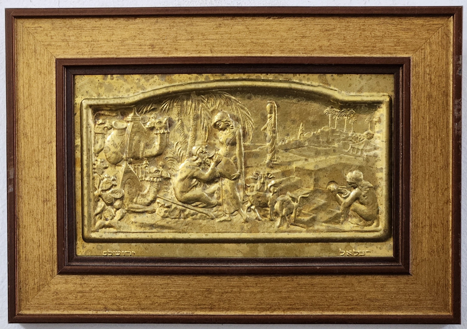 'רבקה ואלעזר על יד הבאר' - תבליט בסגנון בצלאל, עשוי פליז, נתון במסגרת נאה, חתום, מידות: 12X21 ס"מ, מידות: 21X30 ס"מ.