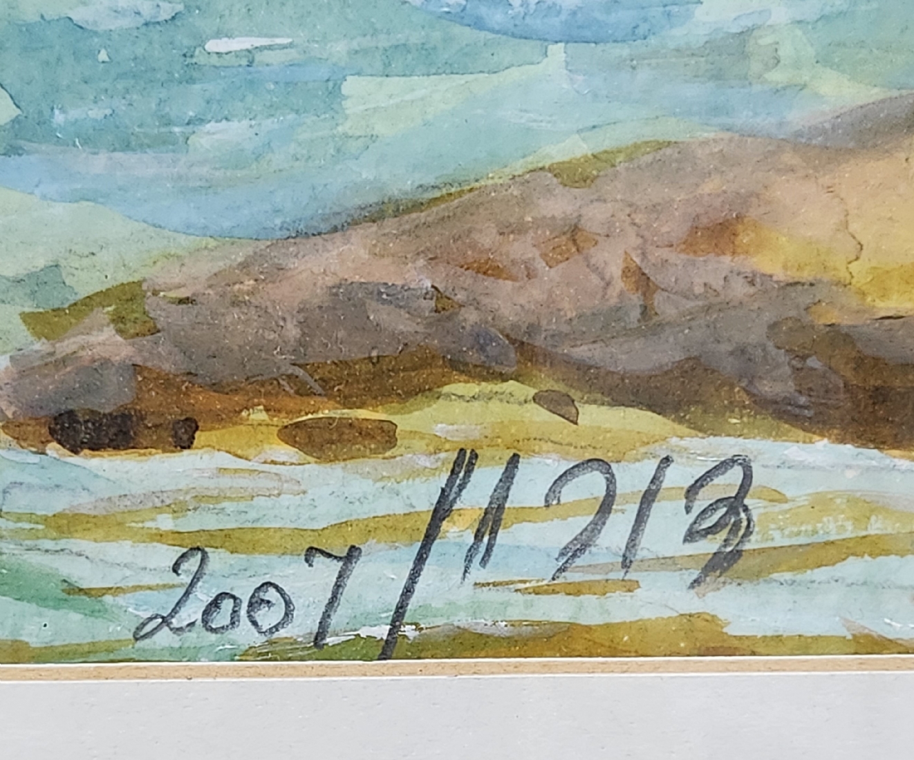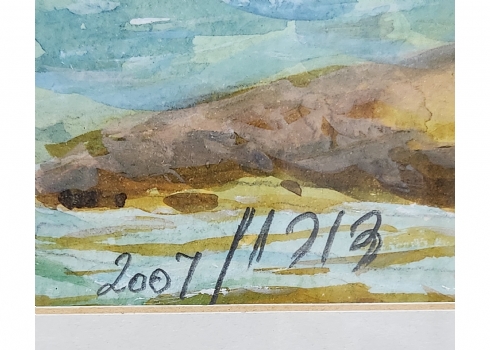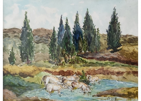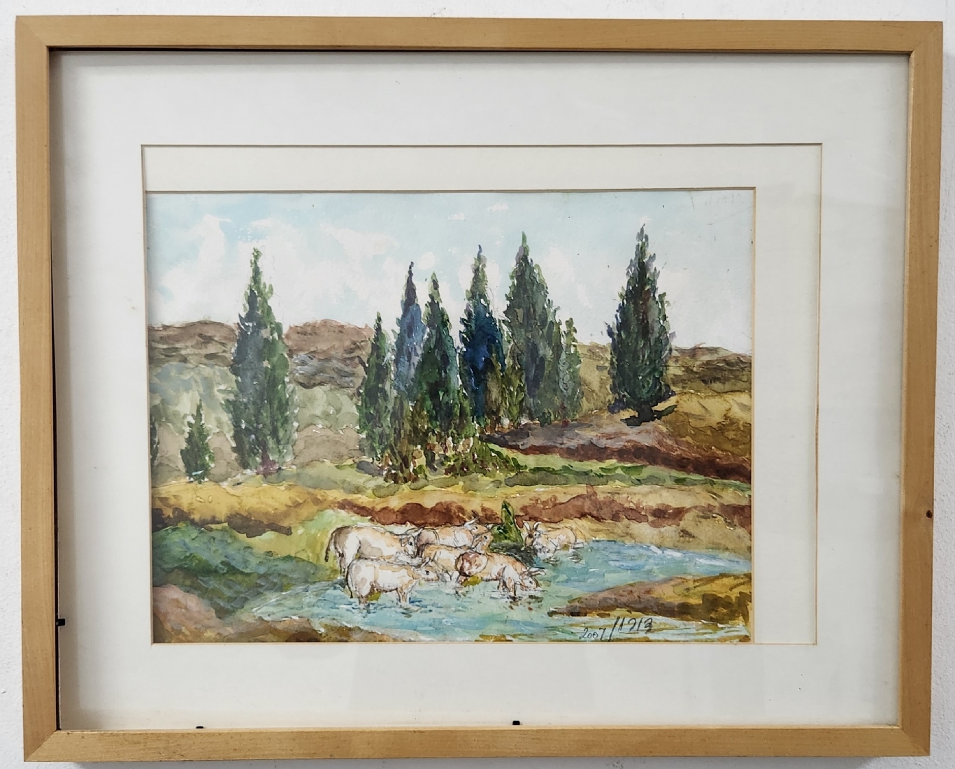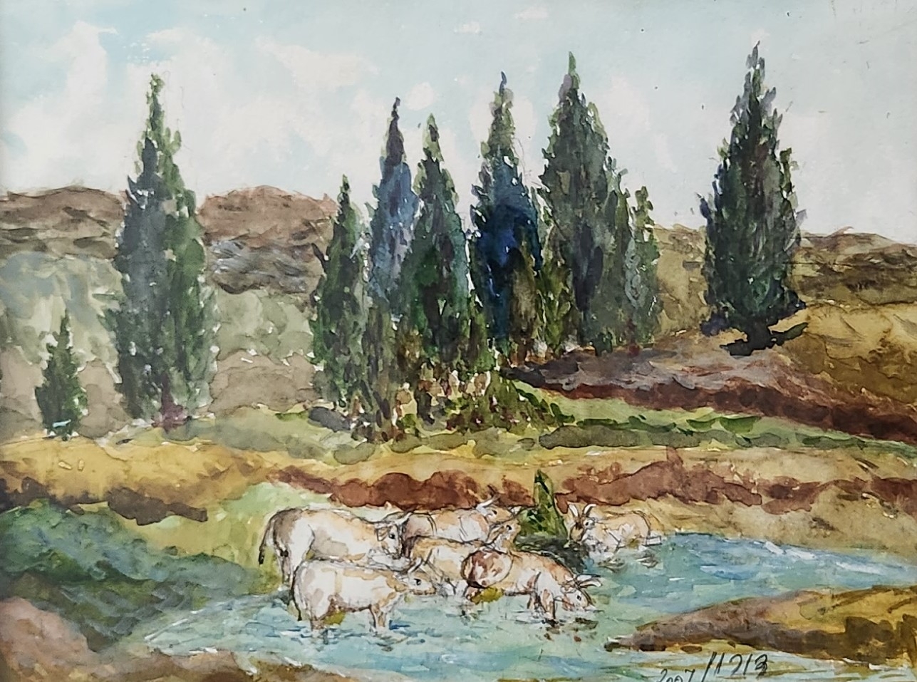 'עדר פרות לבקניות במקווה מים' - אקוורל על נייר, חתום: דורון ומתוארך 2007