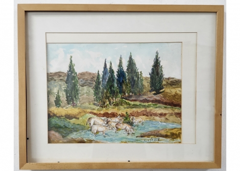 'עדר פרות לבקניות במקווה מים' - אקוורל על נייר, חתום: דורון ומתוארך 2007, מידות: 30X40 ס"מ, מידות המסגרת: 42.5X52.5 ס"מ.