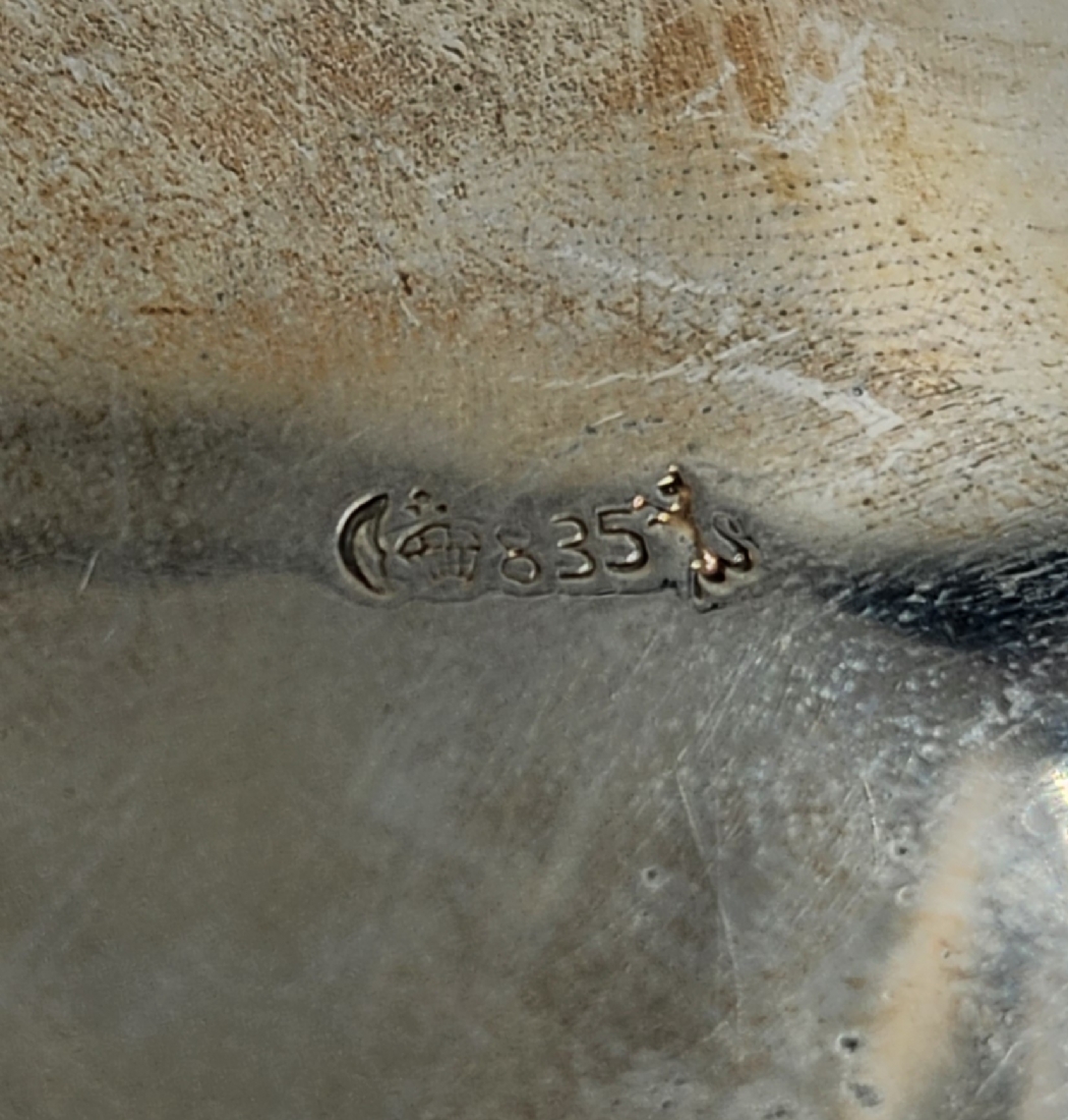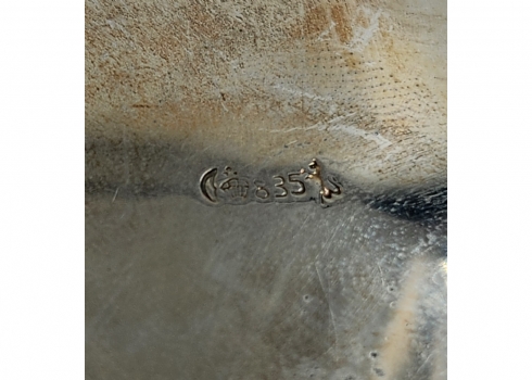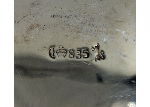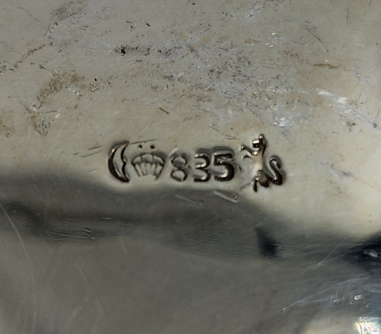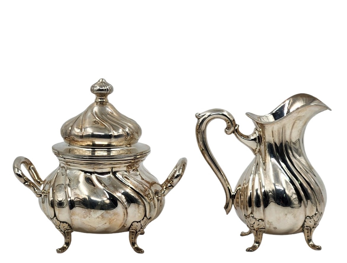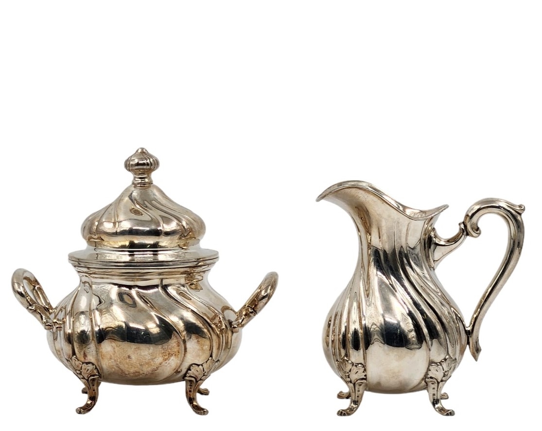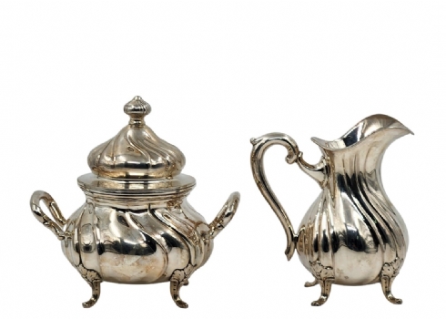 זוג כלי כסף גרמנים קנקן חלב/שמנת וכלי לסוכר ומכסה תואם, עשויים כסף: '835', חתומים, משקל: 509 גרם, רוחב הכלי לסוכר כולל ידיות: 16 ס"מ, גובה כולל המכסה: 16 ס"מ, גובה קנקן החלב: 13.5 ס"מ.