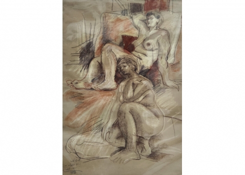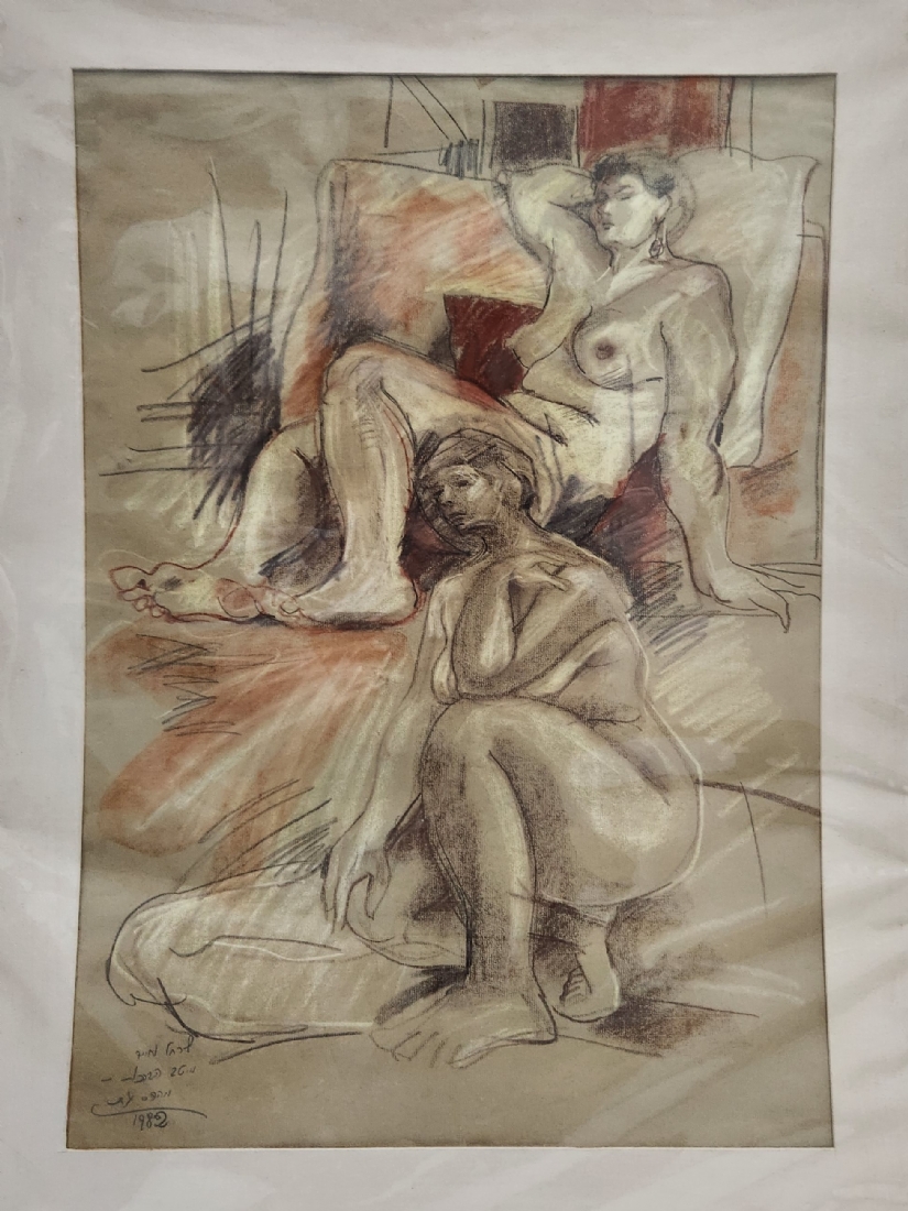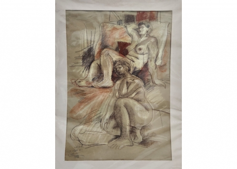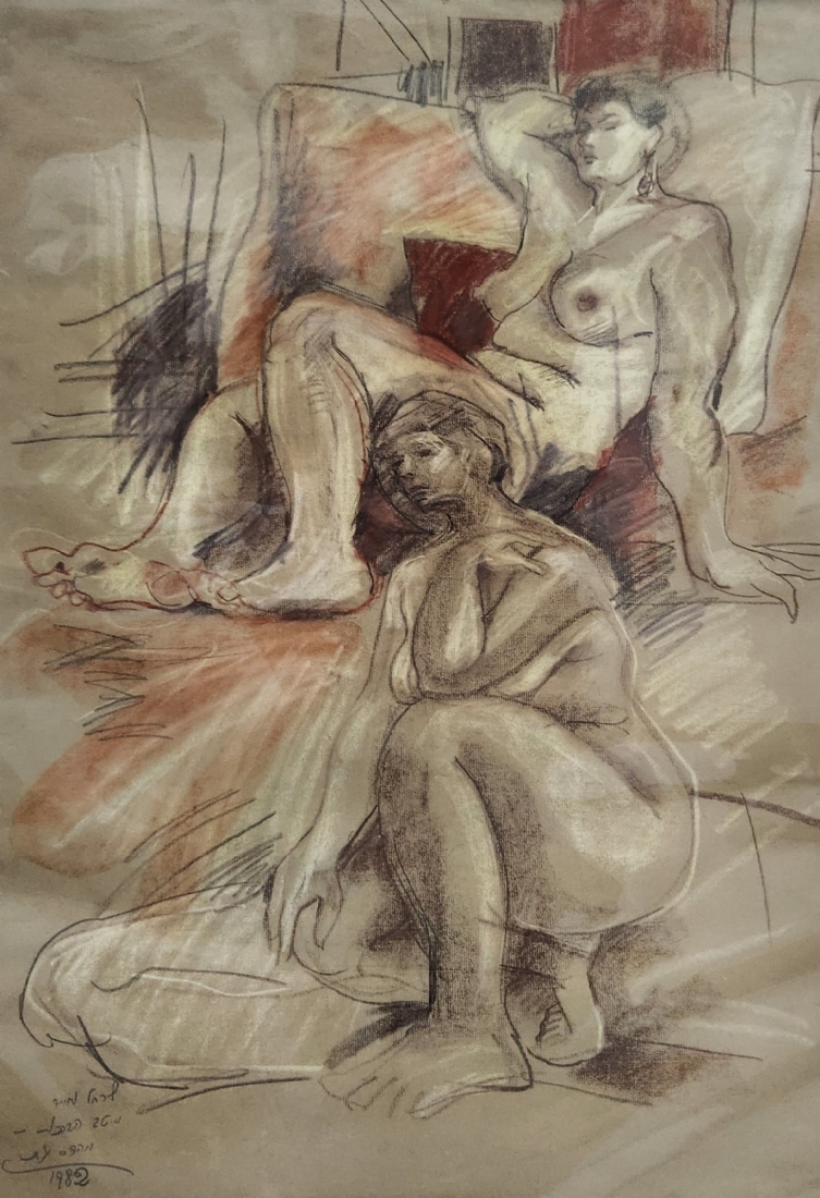 הדס גת - 'נשים נחות', פנדה על קרטון, חתום ומתוארך 1982, נתון בפספרטו בלבד, מידות: 67X48 ס"מ.