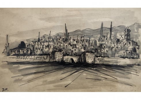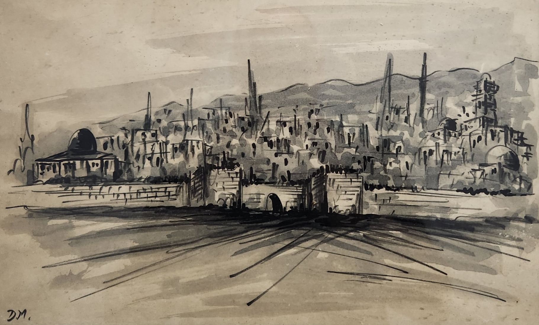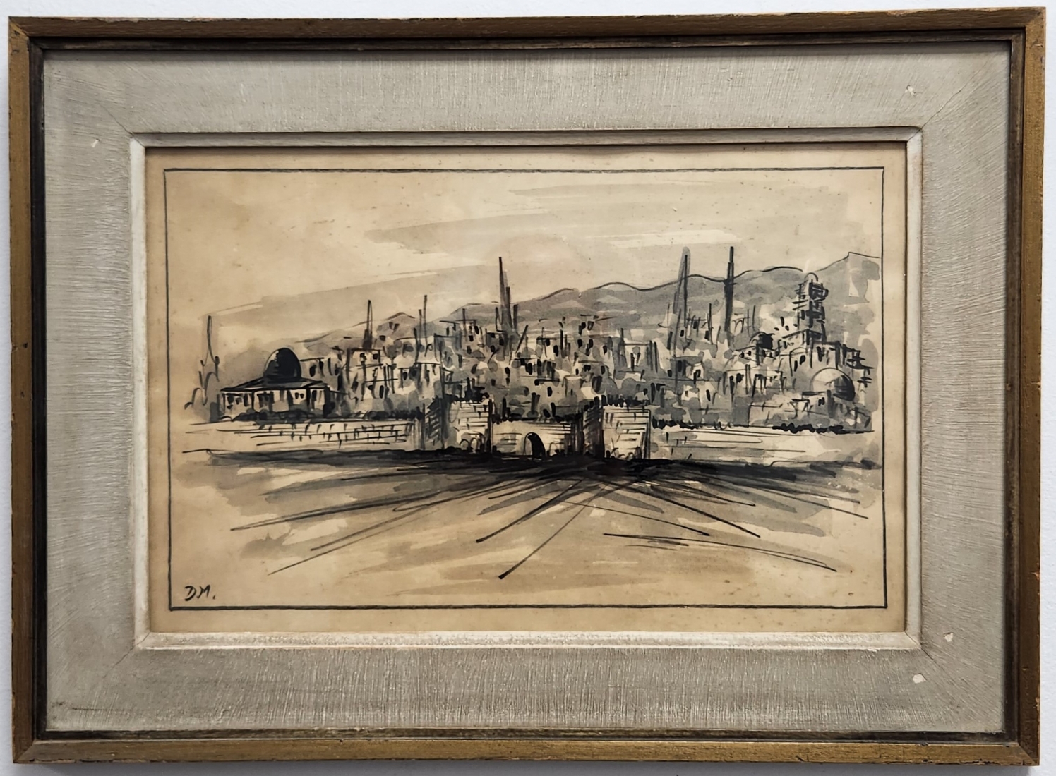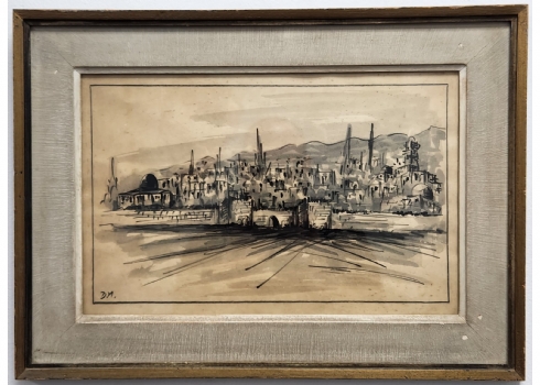 'ירושלים' - ציור ישן, רישום ואקוורל על נייר, חתום, מידות: 23X36 ס"מ, מידות המסגרת: 34.5X47.5 ס"מ.
